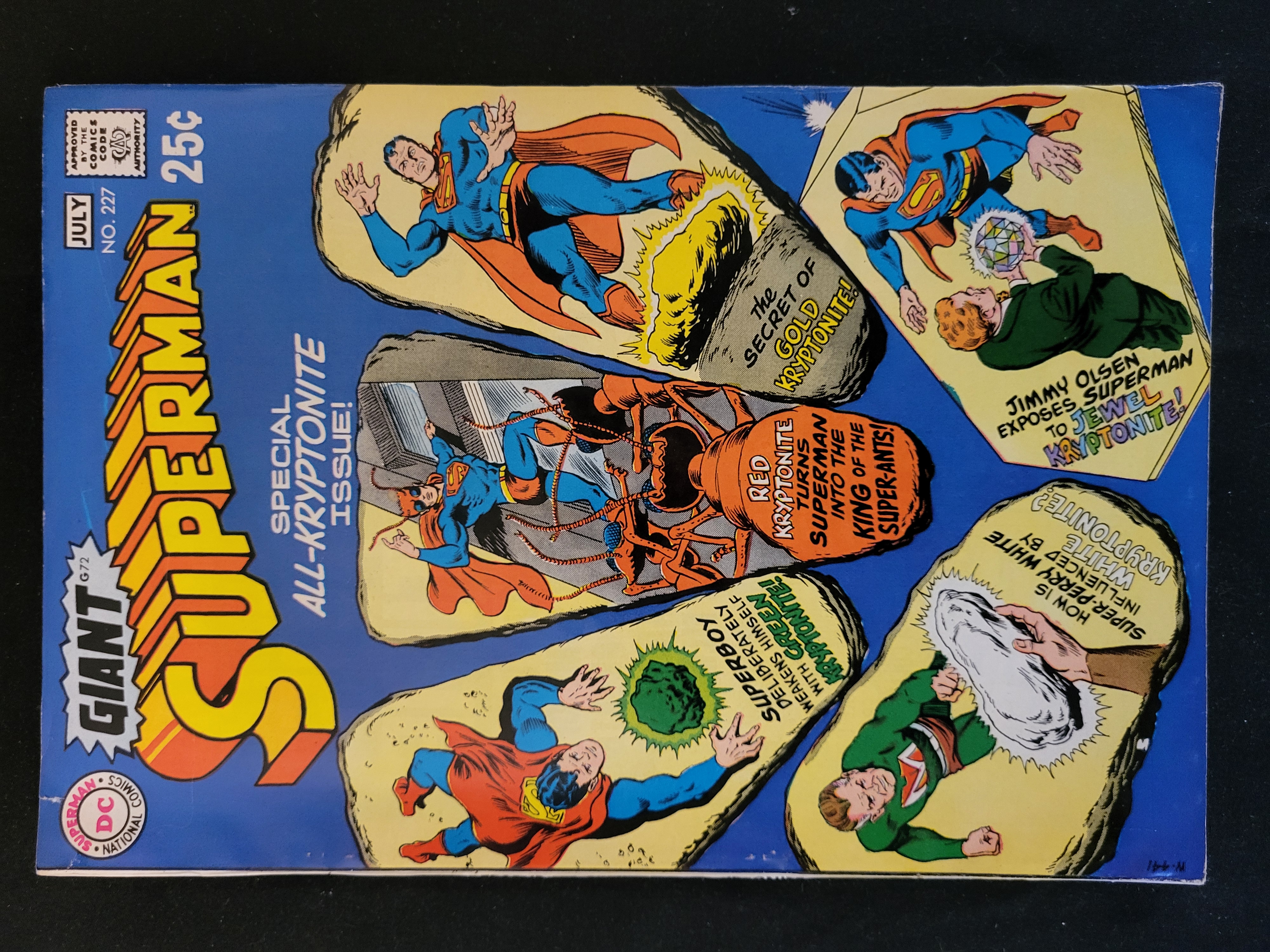 BID PER WHAT YOU SEE IN THE PHOTO, NOT THE AI GENERATED TITLES AND DESCRIPTIONS! This is a copy of Superman No. 227, a Giant edition designated as G-72, published by DC National Comics in July 1970. The cover features a 25-cent original cover price and identifies the publication as a Special All-Kryptonite Issue! The cover illustration consists of five vignettes depicting Superman and associated characters interacting with Gold, Jewel, Red, Green, and White Kryptonite. The Comics Code Authority seal is located in the upper left corner. This issue serves as a giant-size reprint collection of previous stories.
