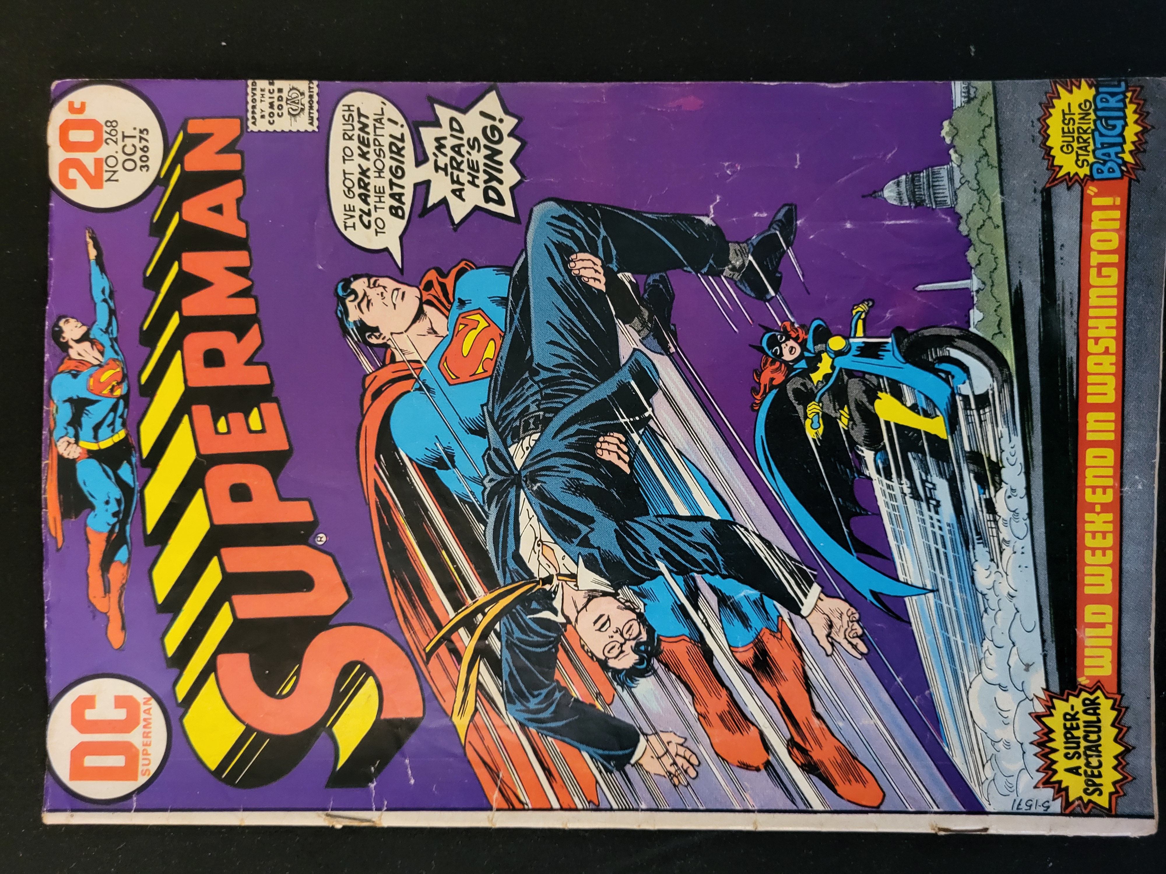 BID PER WHAT YOU SEE IN THE PHOTO, NOT THE AI GENERATED TITLES AND DESCRIPTIONS! This Bronze Age comic book, Superman No. 268, was published by DC Comics in October 1973. The front cover features a 20-cent price point and the Comics Code Authority seal. The cover art depicts Superman carrying an unconscious Clark Kent alongside Batgirl on a motorcycle with the United States Capitol in the background. The cover includes the story title Wild Week-End in Washington! and speech bubbles. This issue features a guest appearance by Batgirl. The publication is part of the Superman Vol. 1 series.