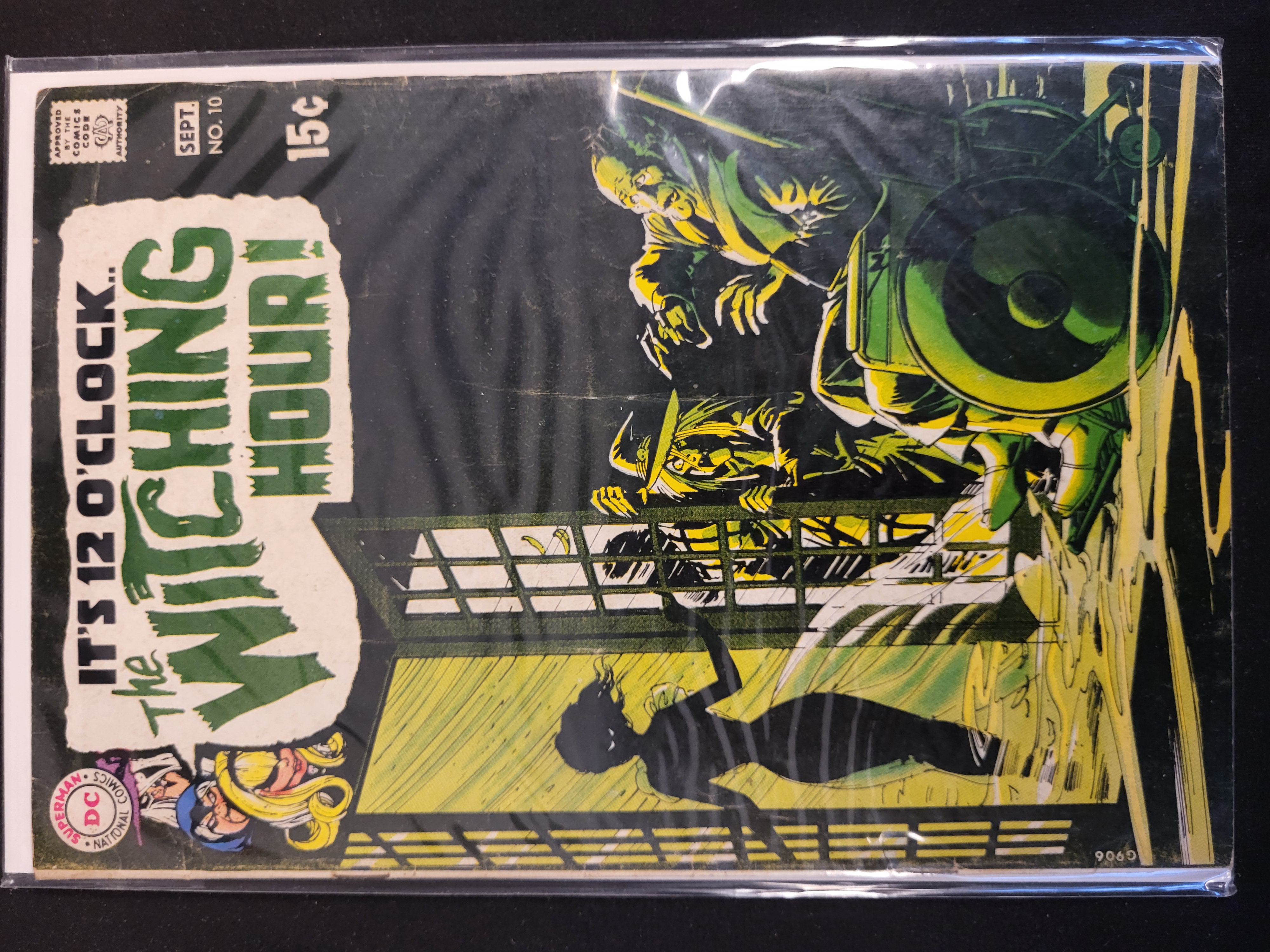 BID PER WHAT YOU SEE IN THE PHOTO, NOT THE AI GENERATED TITLES AND DESCRIPTIONS! The Witching Hour issue number 10, published by DC National Comics in September 1970. This Bronze Age horror comic book features cover artwork by Neal Adams rendered in a high-contrast green, black, and white palette. The front cover displays the series title and the text It is 12 O Clock. The upper left corner includes the Approved by the Comics Code Authority seal, and the lower left corner features the Superman-DC National Comics logo. The cover price is 15 cents.