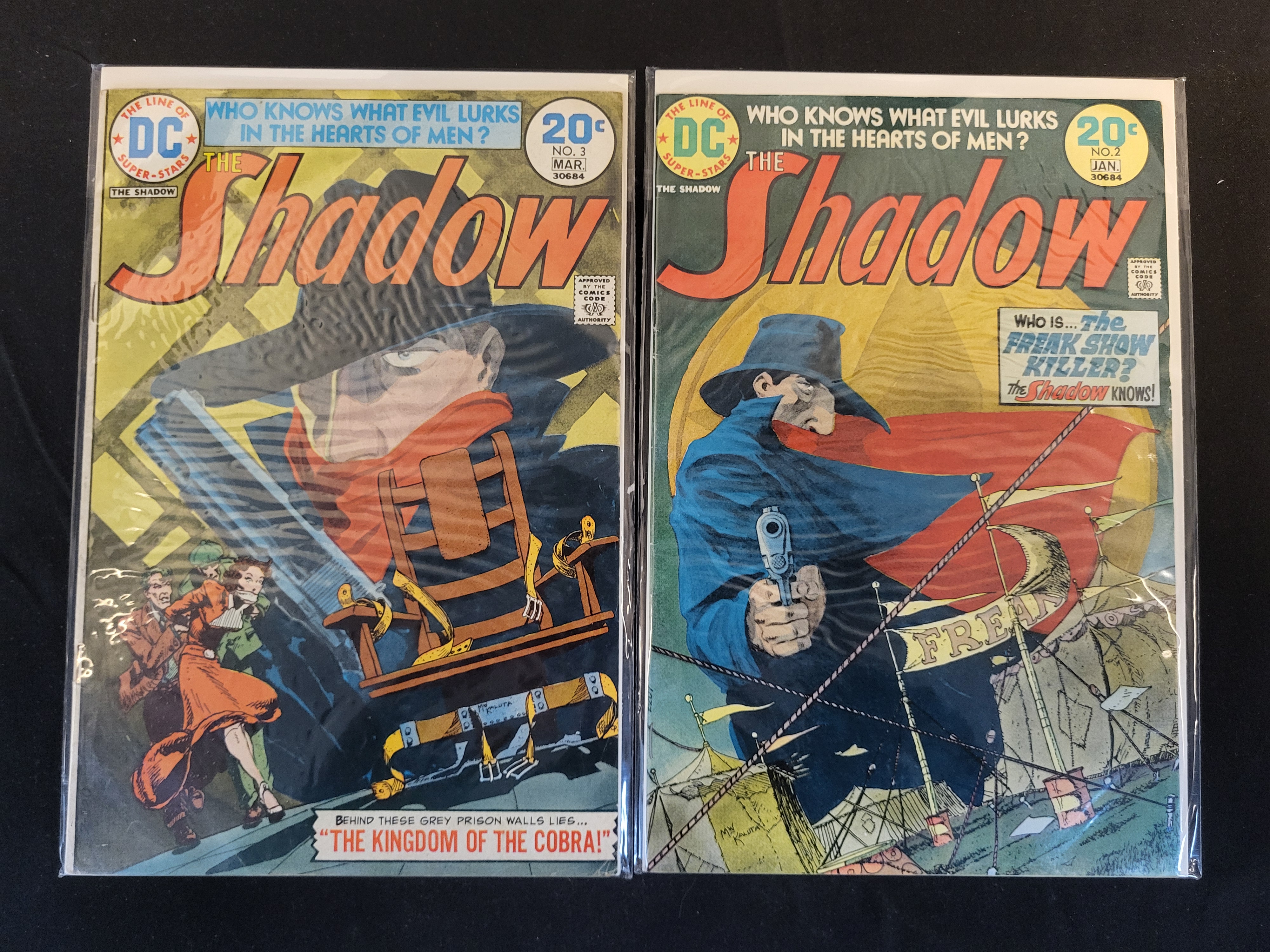 BID PER WHAT YOU SEE IN THE PHOTO, NOT THE AI GENERATED TITLES AND DESCRIPTIONS! A pair of vintage DC comic books featuring The Shadow, published under The Line of DC Super-Stars banner. The lot includes issue No. 2 (January 1974) and issue No. 3 (March 1974). Both issues feature cover illustrations by Michael Wm. Kaluta and stories written by Denny O’Neil. Issue No. 2 contains the story The Freak Show Killer and issue No. 3 contains The Kingdom of the Cobra. Each comic has an original cover price of 20 cents. The books are printed on standard comic newsprint with color covers. Each item is individually housed in a protective plastic sleeve with a cardboard backing.