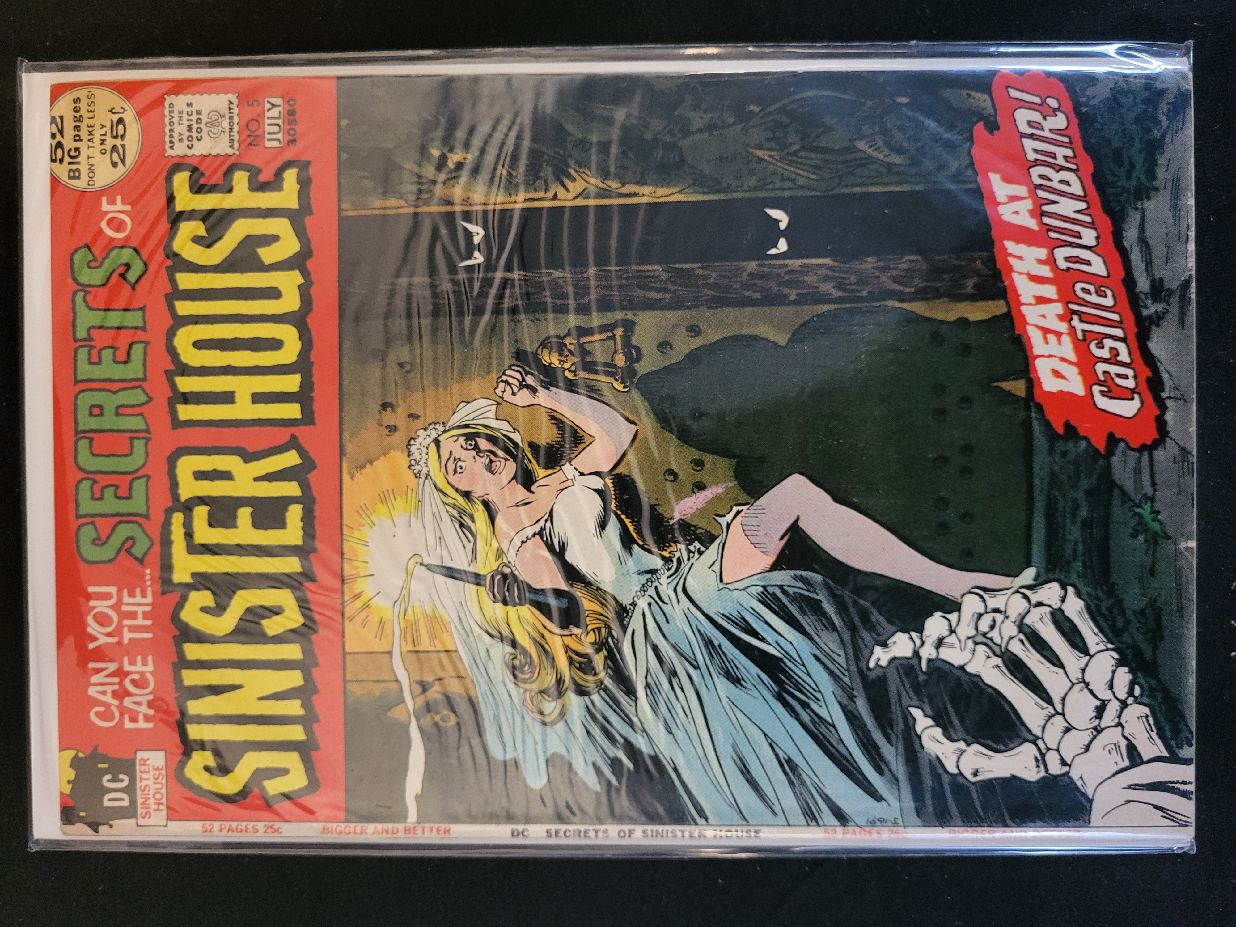 BID PER WHAT YOU SEE IN THE PHOTO, NOT THE AI GENERATED TITLES AND DESCRIPTIONS! This comic book is a copy of Secrets of Sinister House No. 5, published by DC Comics in July 1972. This Bronze Age horror and gothic romance title features cover art depicting a woman in a bridal gown holding a candle while recoiling from skeletal hands. The cover includes the secondary title Death at Castle Dunbar! and the Comics Code Authority seal of approval. The publication is noted as having 52 pages with a 25 cent cover price. The item is housed in a clear protective plastic sleeve.