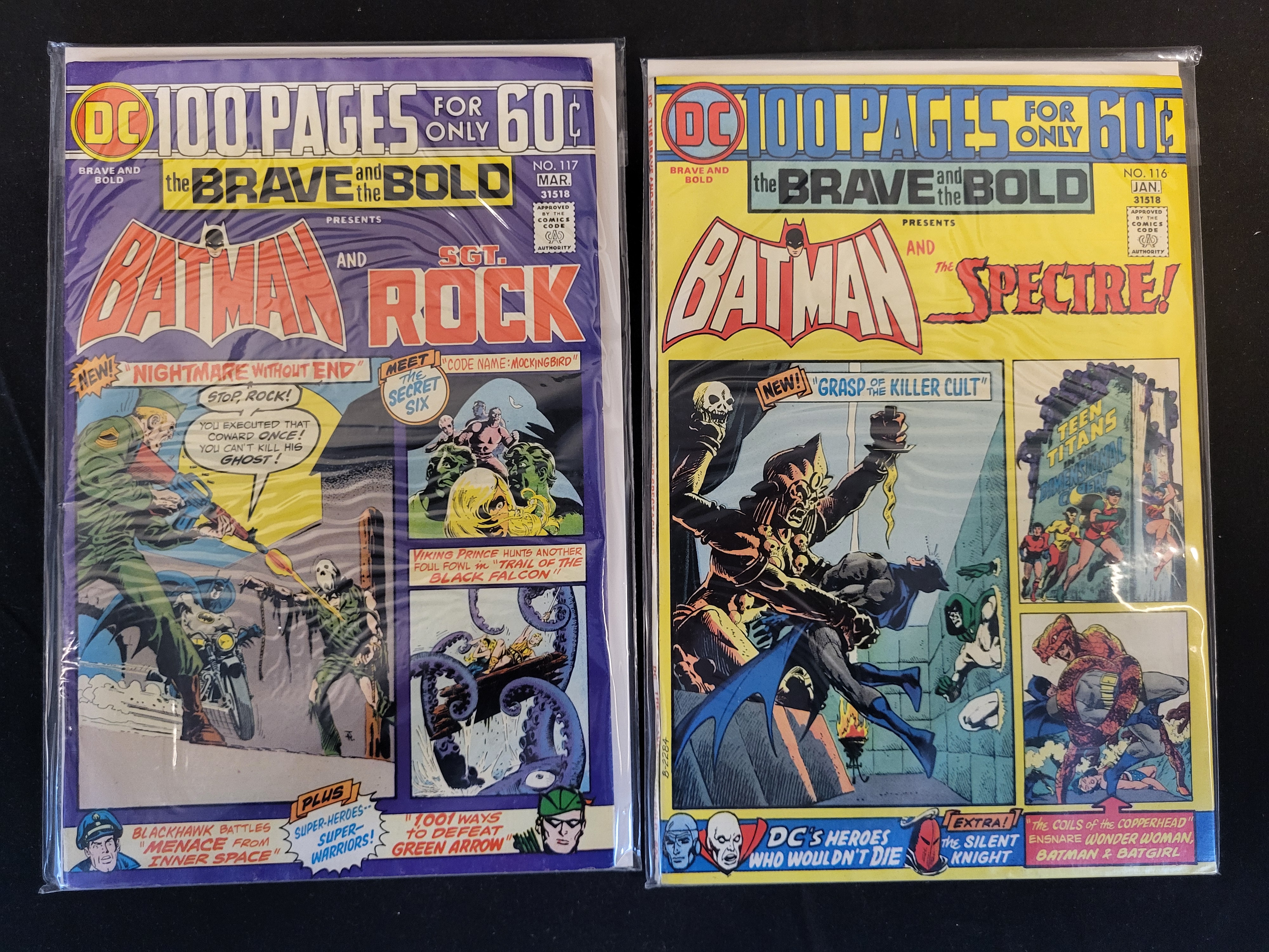 BID PER WHAT YOU SEE IN THE PHOTO, NOT THE AI GENERATED TITLES AND DESCRIPTIONS! This lot consists of two Bronze Age comic books from the DC Comics series The Brave and the Bold. Included are issue number 116, dated January 1975, and issue number 117, dated March 1975. Both issues are part of the 100-page giant format with a 60-cent original cover price. Issue number 116 features Batman and the Spectre in the lead story Grasp of the Killer Cult, with additional features including the Teen Titans, Wonder Woman, and Batgirl. Issue number 117 features Batman and Sgt. Rock in Nightmare Without End, with backup stories featuring the Secret Six, Viking Prince, Blackhawk, and Green Arrow. The comics are constructed of newsprint with staple-bound color covers.