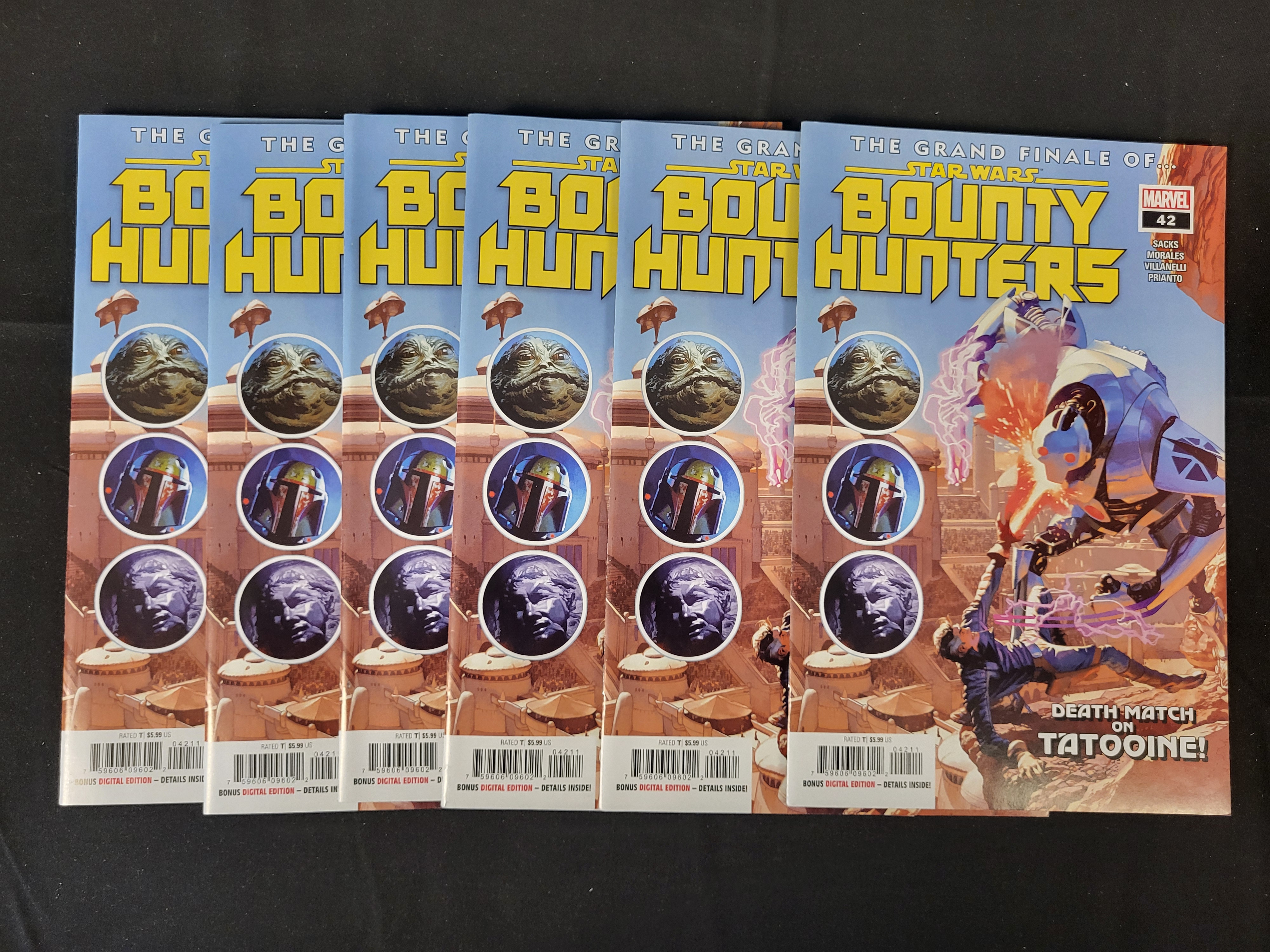 BID PER WHAT YOU SEE IN THE PHOTO, NOT THE AI GENERATED TITLES AND DESCRIPTIONS! A collection of modern comic books from Marvel, specifically Star Wars: Bounty Hunters issue number 42, titled The Grand Finale of… Star Wars Bounty Hunters. The cover art depicts an action scene captioned Death Match on Tatooine! and features circular inset portraits of Jabba the Hutt, Boba Fett, and Han Solo in carbonite. The creative team listed on the cover includes Sacks, Morales, Villanelli, and Prianto. Each copy includes a barcode and the Bonus Digital Edition tagline at the bottom. The items are constructed with glossy paper covers and stapled bindings.