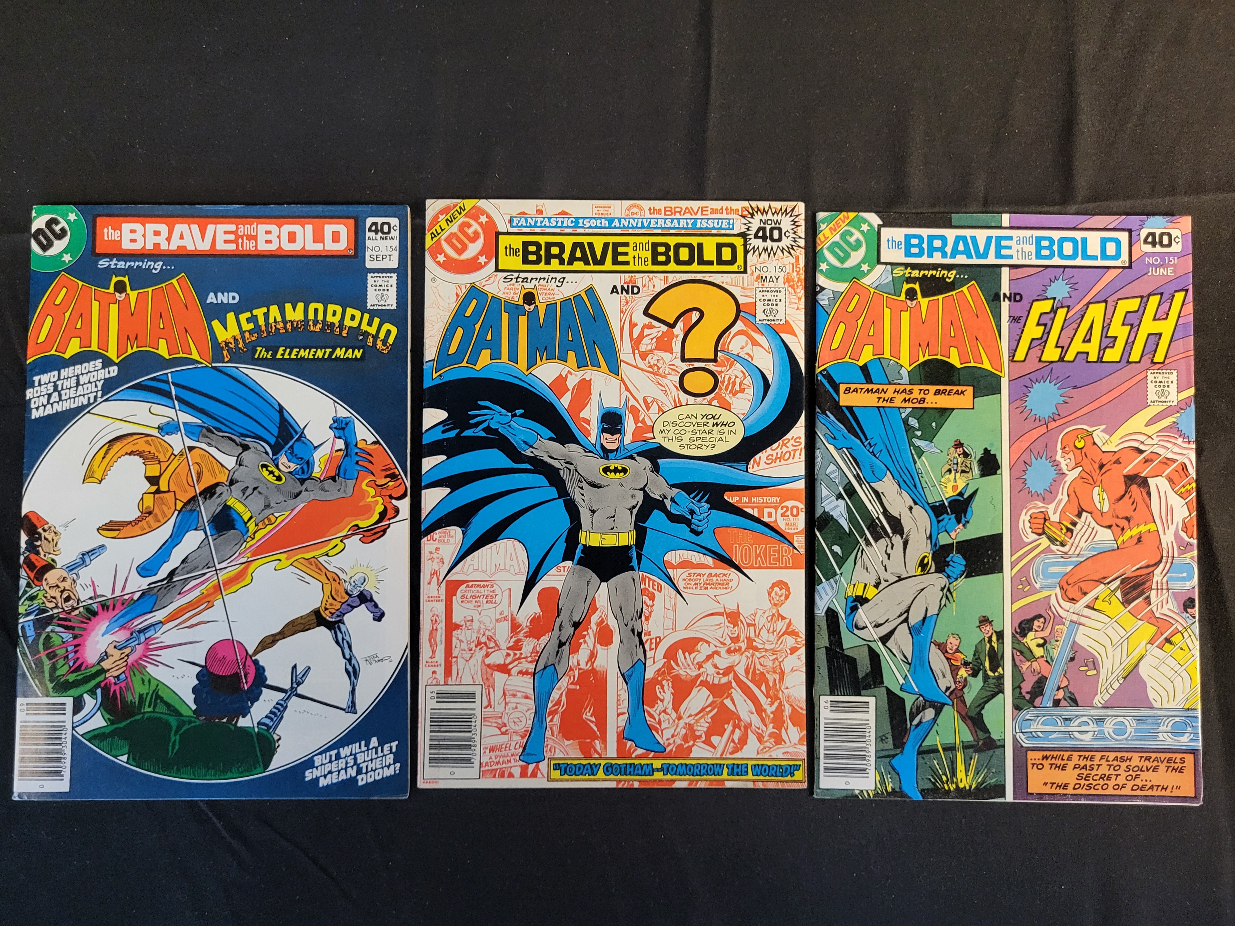 BID PER WHAT YOU SEE IN THE PHOTO, NOT THE AI GENERATED TITLES AND DESCRIPTIONS! A trio of Bronze Age comic books from the DC Comics series The Brave and the Bold. This group includes issue No. 150 (May 1979), identified as the Fantastic 150th Anniversary Issue! featuring Batman and Superman with cover art by Jim Aparo. The lot also contains issue No. 151 (June 1979) featuring Batman and The Flash, and issue No. 154 (September 1979) featuring Batman and Metamorpho. Each publication features a 40-cent cover price, the DC circular logo, and the Comics Code Authority seal. The items are constructed of standard comic book newsprint with stapled wraps.
