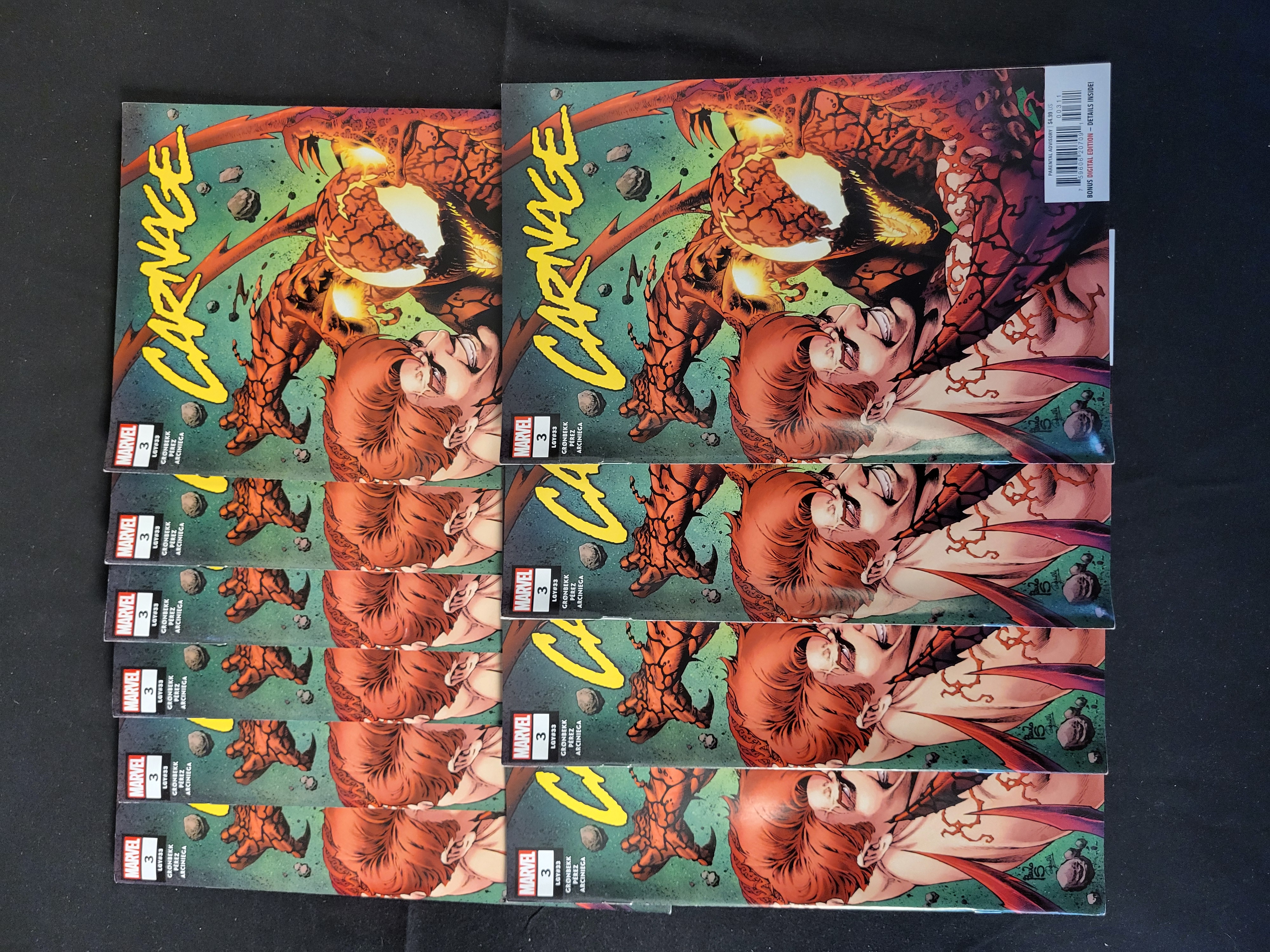 BID PER WHAT YOU SEE IN THE PHOTO, NOT THE AI GENERATED TITLES AND DESCRIPTIONS! A collection of Marvel comic books featuring Carnage issue 3, legacy number 33, from the 2023-2024 series. The cover art depicts a dynamic action scene with the titular character. Credits listed on the cover include writer Torunn Gronbekk, artist Pere Perez, and colorist Erick Arciniega. These modern-era comics include a Parental Advisory warning and a 4.99 US dollar cover price. Each copy displays a uniform barcode and trade dress typical of recent Marvel publications.
