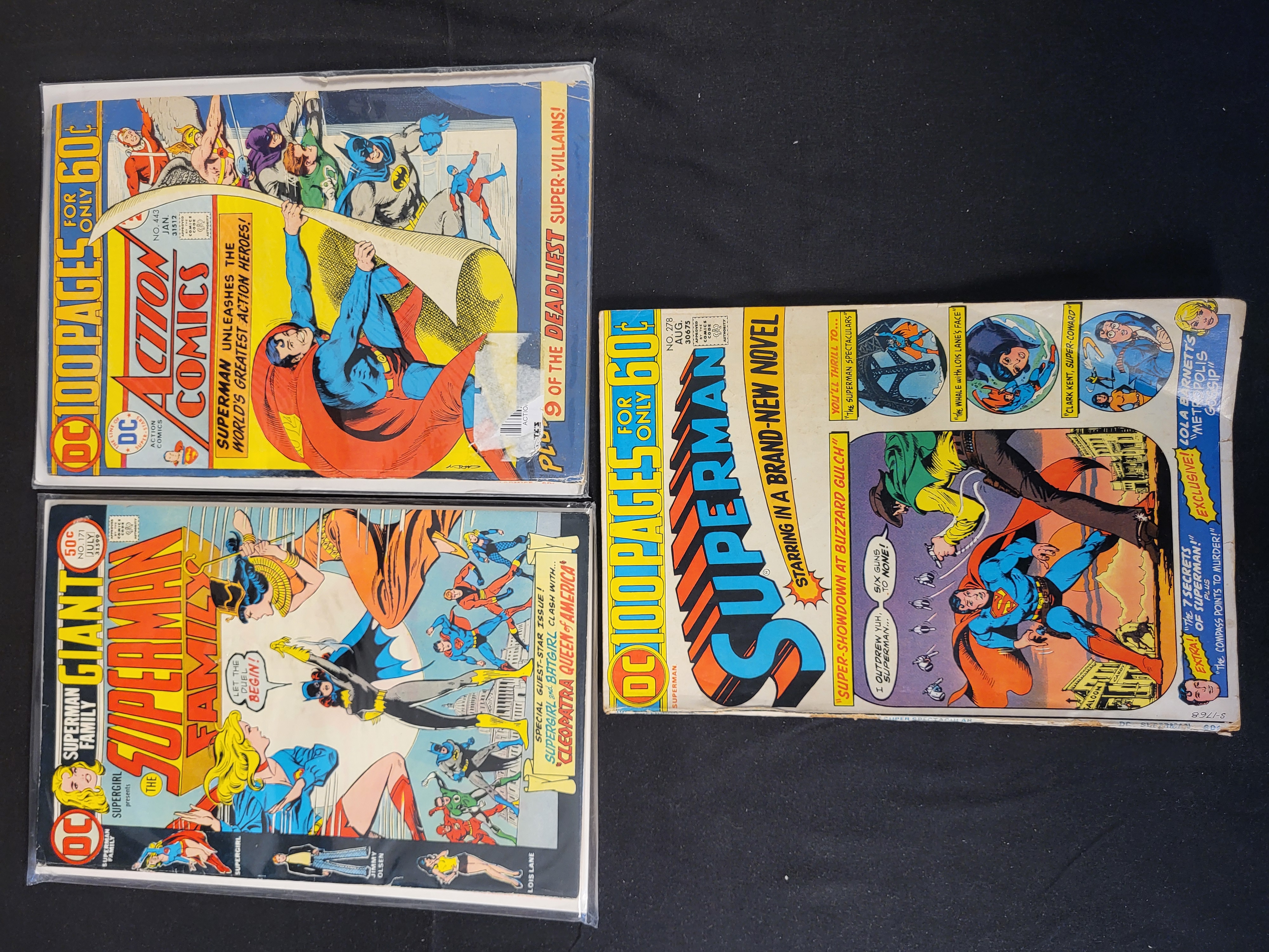 BID PER WHAT YOU SEE IN THE PHOTO, NOT THE AI GENERATED TITLES AND DESCRIPTIONS! This group of DC comic books from the mid-1970s includes Action Comics No. 443 (January 1975), The Superman Family Giant No. 171 (July 1975), and Superman No. 278 (August 1974). The issues are part of the 100-Page Super Spectacular and Giant series, featuring original cover prices of 50 and 60 cents. The cover art depicts various characters including Superman, Batman, Supergirl, Batgirl, and Robin. Two of the comics are housed in protective plastic sleeves with cardboard backing boards.