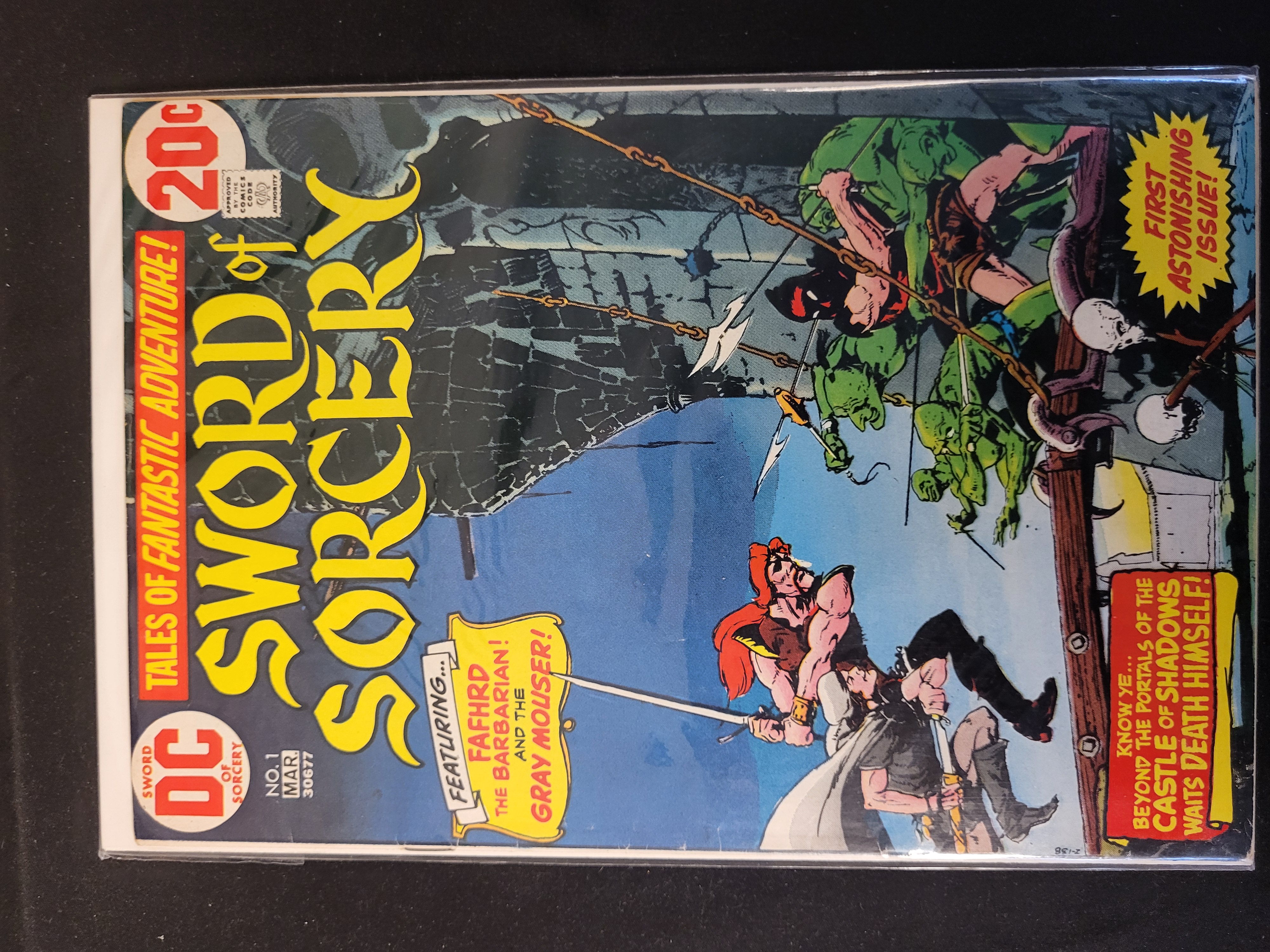BID PER WHAT YOU SEE IN THE PHOTO, NOT THE AI GENERATED TITLES AND DESCRIPTIONS! Sword of Sorcery No. 1, published by DC Comics in March 1973. This debut issue of the series features the first appearance of Fafhrd the Barbarian and the Gray Mouser in DC Comics, adapted from the fantasy stories of Fritz Leiber. The cover includes the text Tales of Fantastic Adventure and First Astonishing Issue. The original retail price of 20 cents is printed in the upper left corner alongside the DC logo, the issue number 1, the date March, the code 30677, and the Comics Code Authority seal. The cover illustration depicts a combat scene between the two protagonists and multiple green-skinned figures. This Bronze Age publication features artistic contributions from Michael Kaluta, Howard Chaykin, and Neal Adams. The item is stored in a clear plastic protective sleeve with a rigid white backing board.