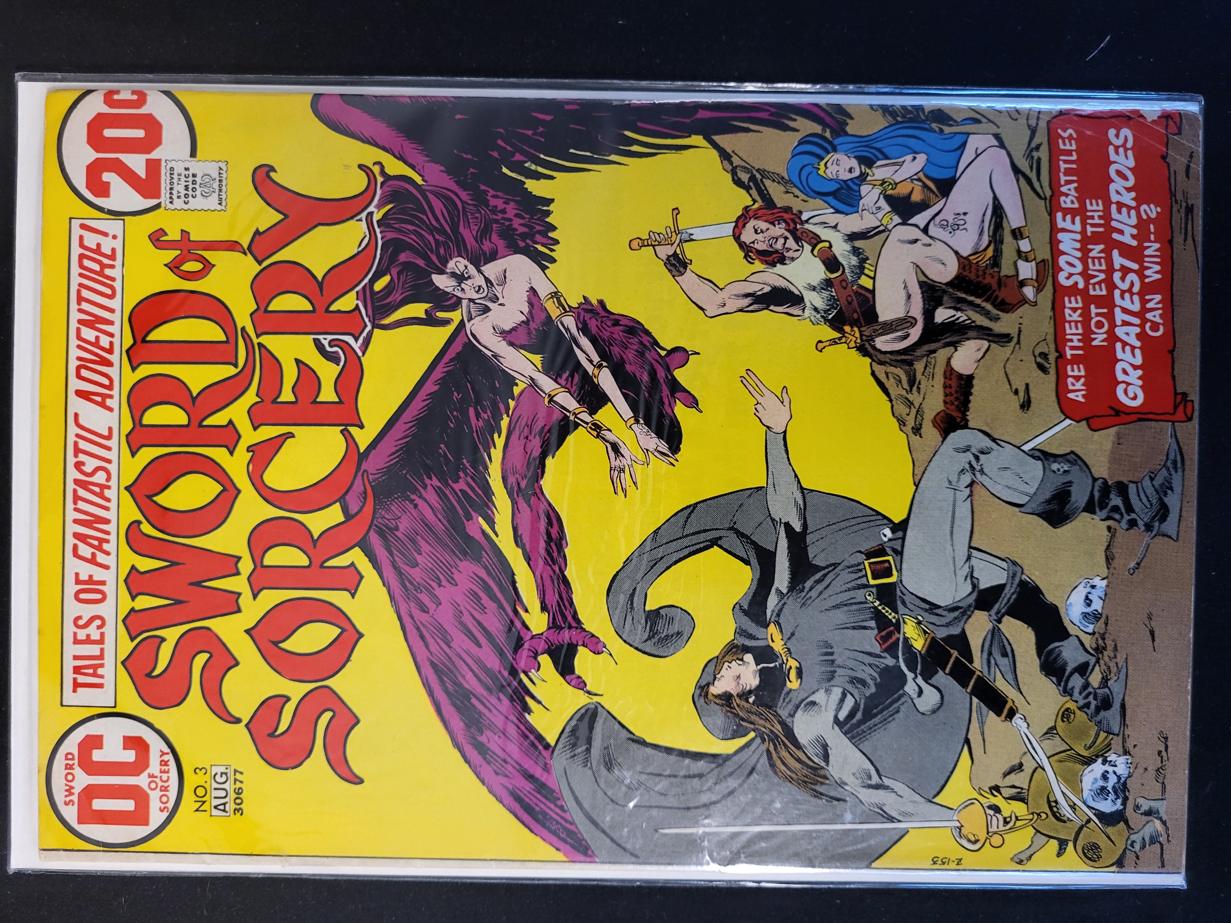 BID PER WHAT YOU SEE IN THE PHOTO, NOT THE AI GENERATED TITLES AND DESCRIPTIONS! A copy of DC Comics Sword of Sorcery issue number 3 from the Tales of Fantastic Adventure series dated August 1973. This Bronze Age fantasy comic features characters Fafhrd and the Gray Mouser. The cover illustration depicts several heroic figures in combat with a winged purple-skinned antagonist set against a yellow background. The front cover displays the DC bullet logo, a 20-cent price point, and the Comics Code Authority seal of approval.