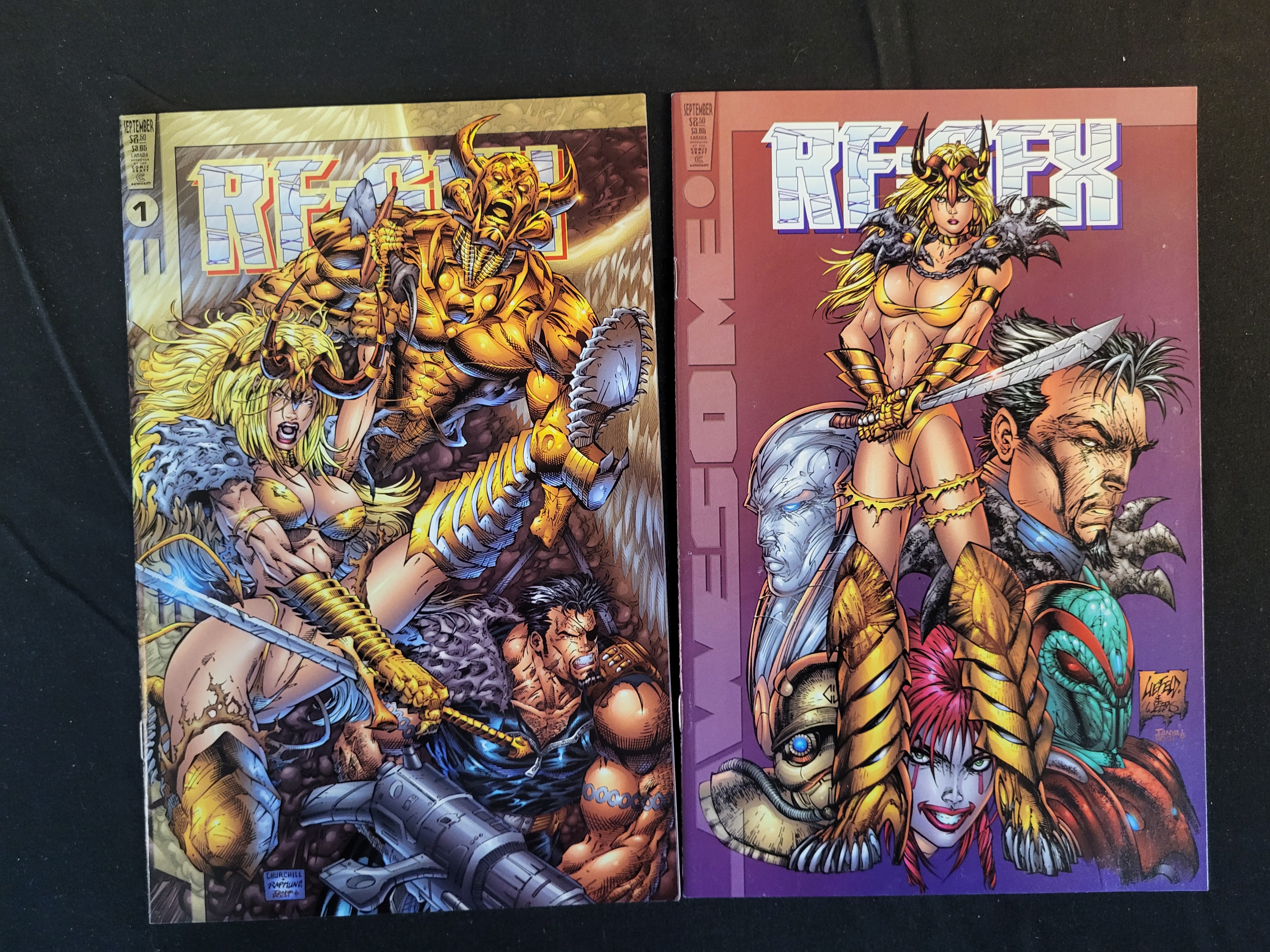 BID PER WHAT YOU SEE IN THE PHOTO, NOT THE AI GENERATED TITLES AND DESCRIPTIONS! A pair of modern-age comic books titled Re:Gex, published by Awesome Entertainment. Both issues are dated September 1998. The issue on the left is identified as No. 1 and features cover art credited to Churchill and Rapmund. The issue on the right features a variant cover with art credited to Rob Liefeld, Danny Miki, and Tanya. The covers are printed with a glossy finish and depict various fantasy and science-fiction characters in dynamic action poses. The illustrations exhibit the highly stylized aesthetic characteristic of late 1990s comic book production.