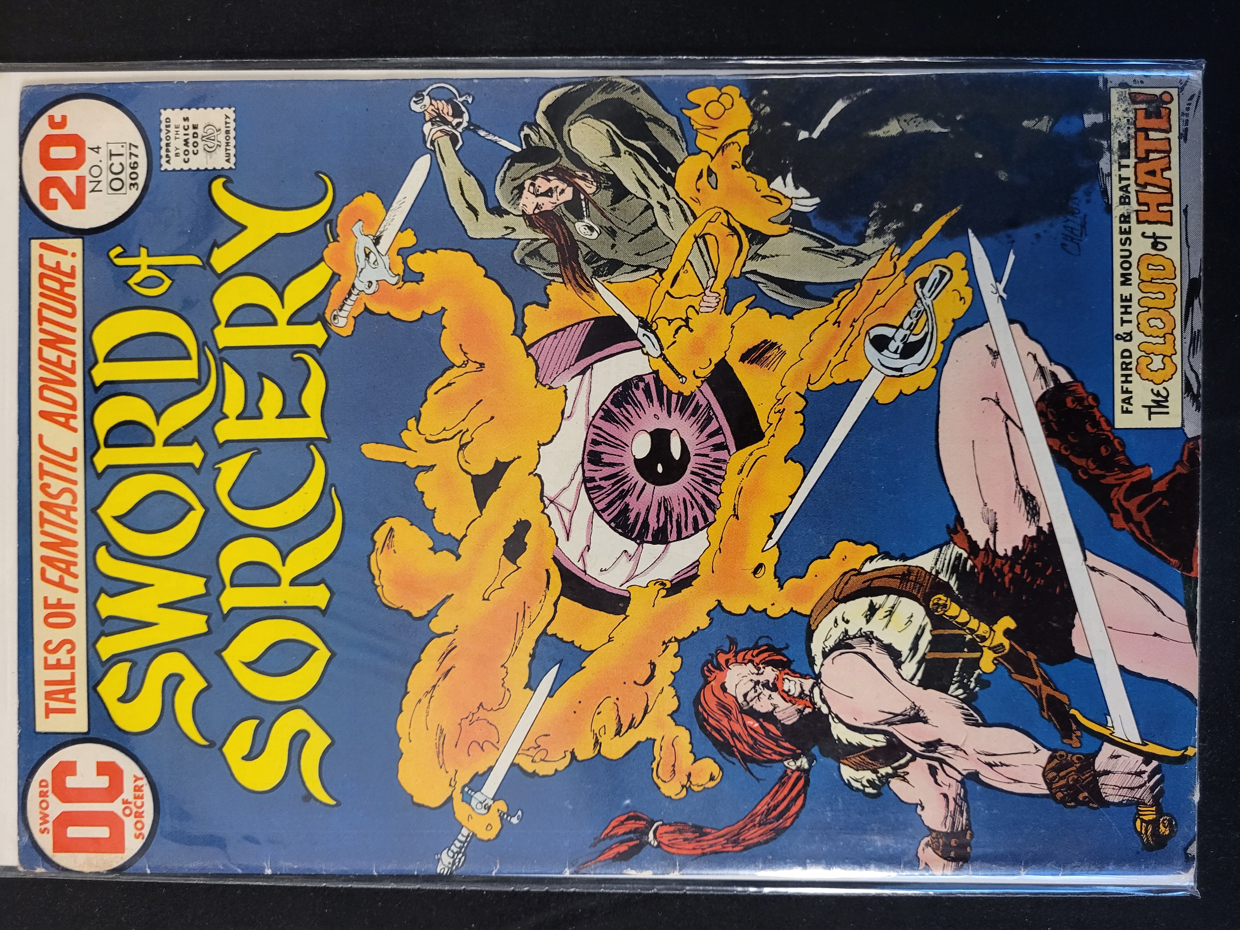 BID PER WHAT YOU SEE IN THE PHOTO, NOT THE AI GENERATED TITLES AND DESCRIPTIONS! DC Comics publication Sword of Sorcery issue number 4, dated October 1973. This vintage comic book features an original 20-cent cover price and the product number 30677. The cover art by Howard Chaykin illustrates the story Fafhrd and the Mouser Battle the Cloud of Hate! depicting the characters Fafhrd and the Gray Mouser in combat with a large central eye enveloped in orange smoke. The front cover displays the Approved by the Comics Code Authority seal. The publication is a staple-bound comic book featuring characters created by Fritz Leiber.
