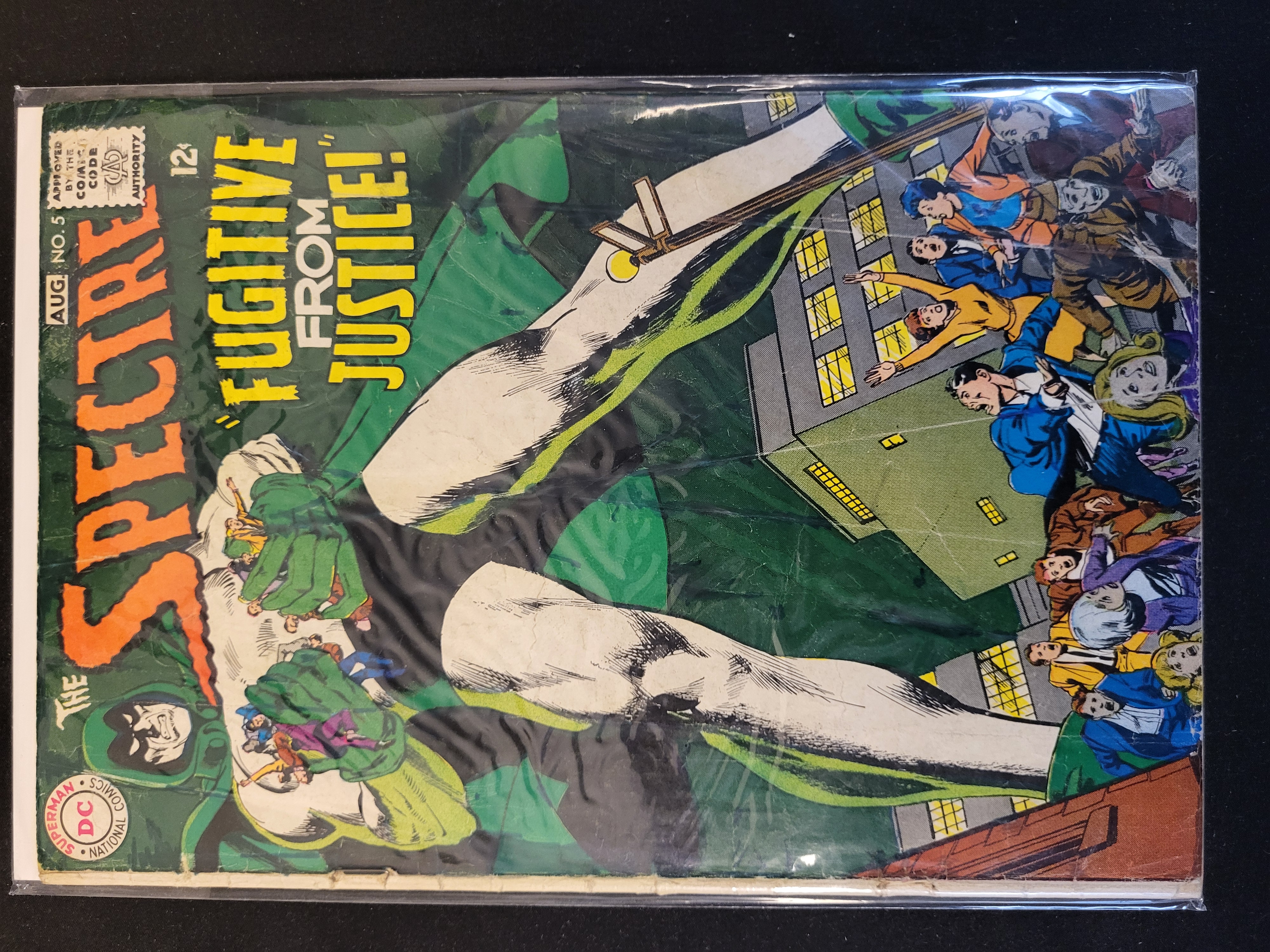 BID PER WHAT YOU SEE IN THE PHOTO, NOT THE AI GENERATED TITLES AND DESCRIPTIONS! This is an issue of The Spectre, No. 5, published by DC National Comics in August 1968. The comic features the story title Fugitive From Justice! and includes cover art and interior illustrations by Neal Adams. The front cover displays the Superman DC National Comics emblem, a 12-cent original price, and the Comics Code Authority seal. The cover illustration depicts a giant-sized Spectre looming over a building and a crowd of people. The publication is a standard Silver Age comic book.