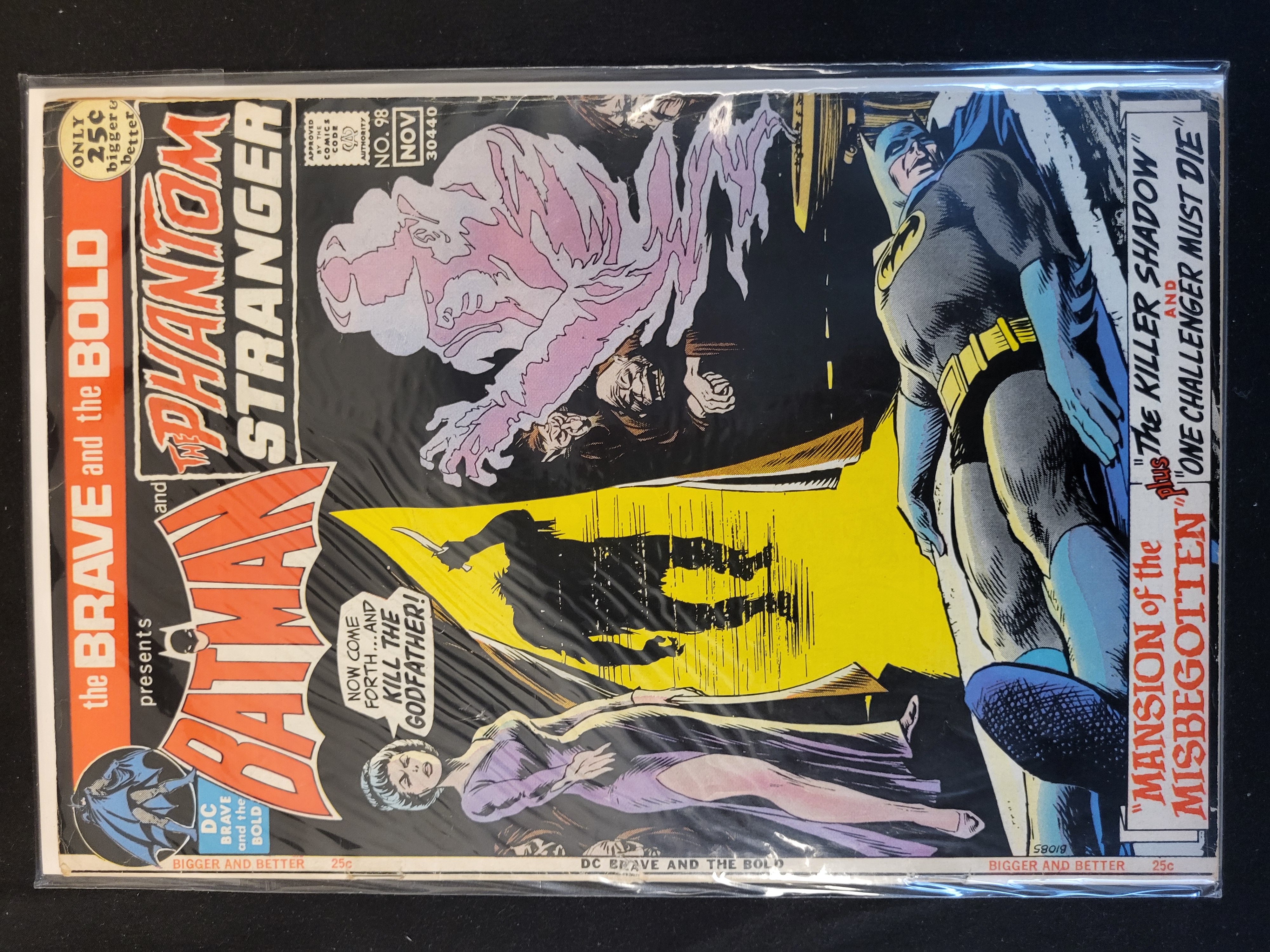 BID PER WHAT YOU SEE IN THE PHOTO, NOT THE AI GENERATED TITLES AND DESCRIPTIONS! This DC Comics publication, The Brave and the Bold issue no. 98, dates from November 1971 and features a collaboration between Batman and The Phantom Stranger. The cover art includes story titles The Killer Shadow, One Challenger Must Die, and Mansion of the Misbegotten. The issue displays an original cover price of 25 cents under the Bigger and Better branding and includes the Comics Code Authority seal. The item is housed in a protective plastic sleeve.