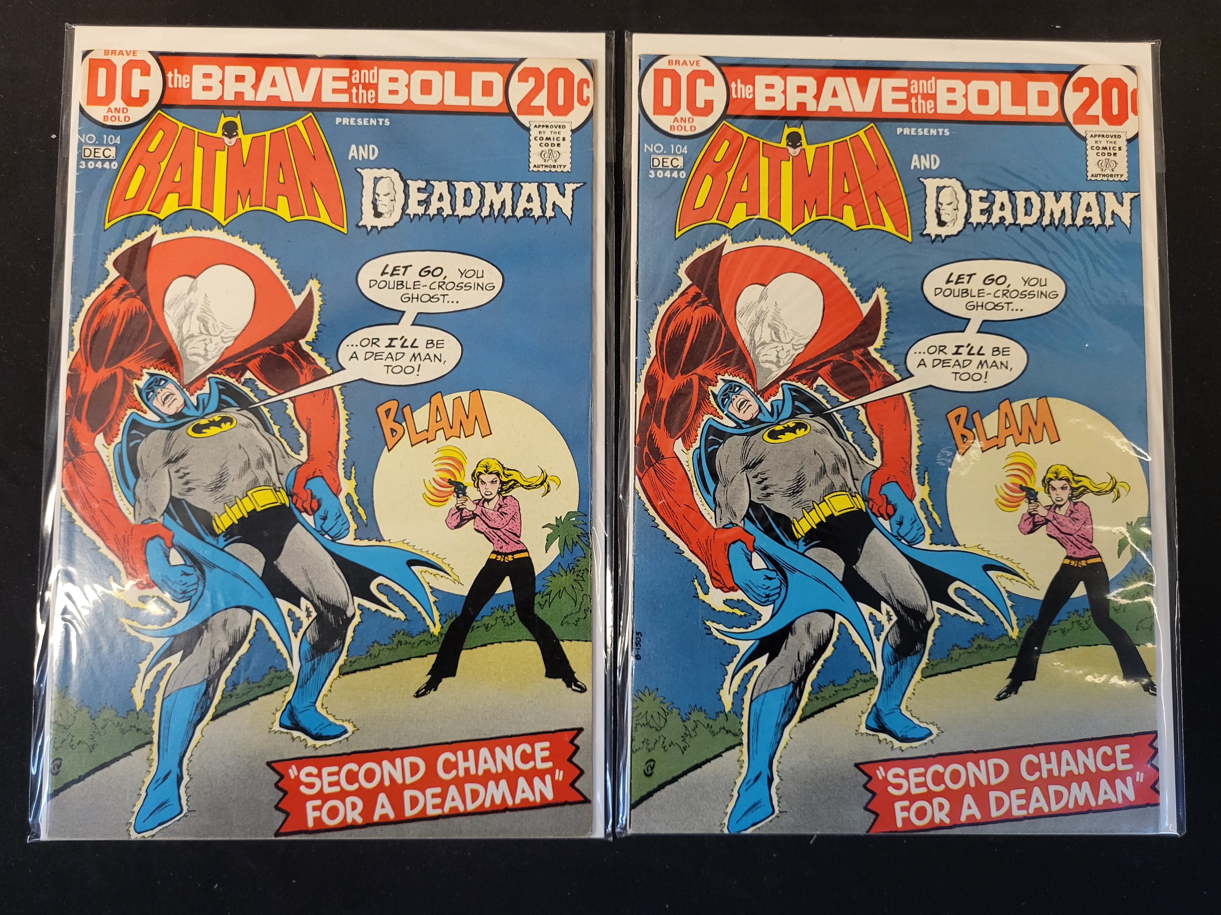 BID PER WHAT YOU SEE IN THE PHOTO, NOT THE AI GENERATED TITLES AND DESCRIPTIONS! A pair of DC Comics The Brave and the Bold No. 104, dated December 1972. These Bronze Age issues feature a collaborative story between Batman and Deadman titled Second Chance for a Deadman. The cover illustration depicts Batman, Deadman, and a female character with a handgun. Each comic displays a 20-cent cover price, the DC logo, and the Comics Code Authority seal. The comics are printed on standard paper stock and are individually presented in protective plastic sleeves with cardboard backing boards.