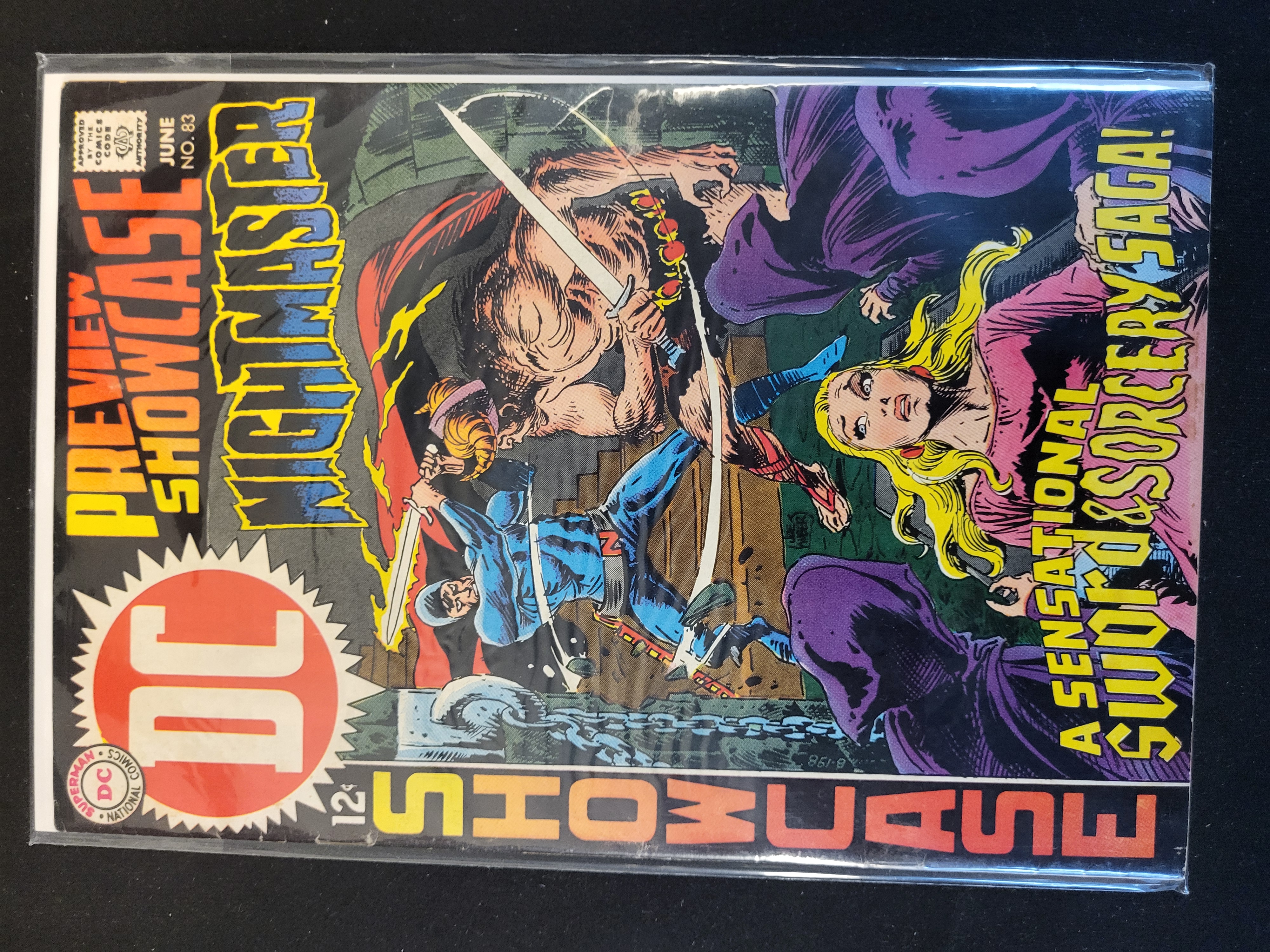 BID PER WHAT YOU SEE IN THE PHOTO, NOT THE AI GENERATED TITLES AND DESCRIPTIONS! DC Comics Showcase issue number 83, published in June 1969. This issue features the origin and first appearance of the character Nightmaster, also known as Jim Rook. The cover art is by Bernie Wrightson and depicts a sword-and-sorcery battle scene between a blue-clad protagonist and a large antagonist. The front cover displays the 12-cent price point, the DC circular logo, and the Comics Code Authority seal. This issue is noted in the series history as the final 12-cent issue of Showcase. The comic is a standard American comic book format printed on newsprint.