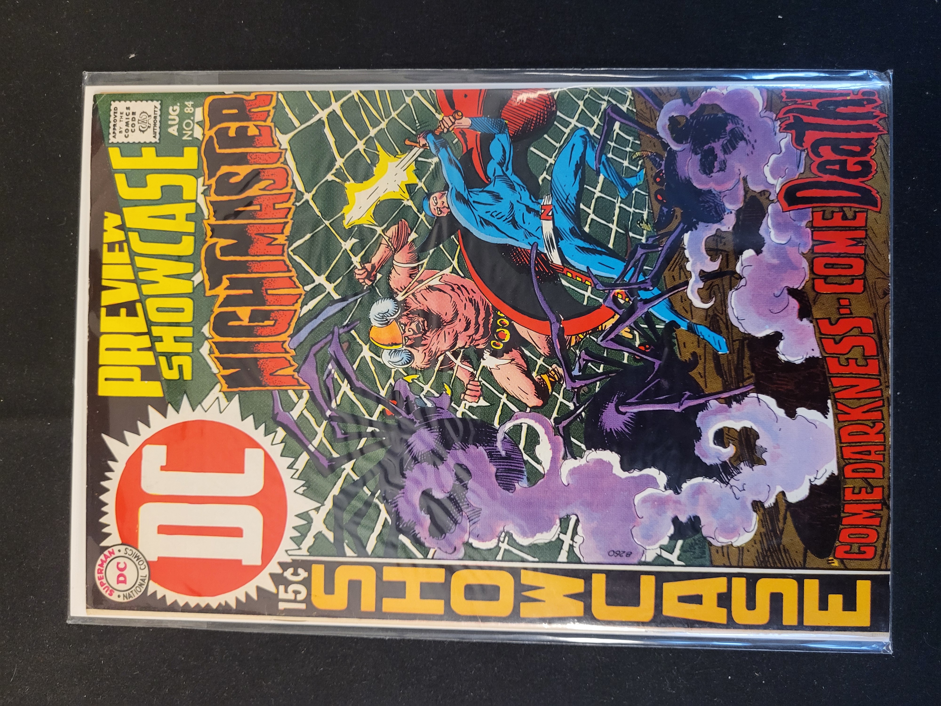 BID PER WHAT YOU SEE IN THE PHOTO, NOT THE AI GENERATED TITLES AND DESCRIPTIONS! A Silver Age comic book, Showcase No. 84, published by DC Comics with an August 1969 cover date. This issue features the character Nightmaster in the story titled Come Darkness—Come Death!. The cover art, attributed to Bernie Wrightson, depicts the protagonist in a blue costume battling a multi-eyed creature on a webbed surface. The cover displays the 15-cent price, the circular DC logo, the Superman DC National Comics seal, and the Comics Code Authority seal. This is a staple-bound paper publication. The item is stored in a protective plastic sleeve with a backing board.