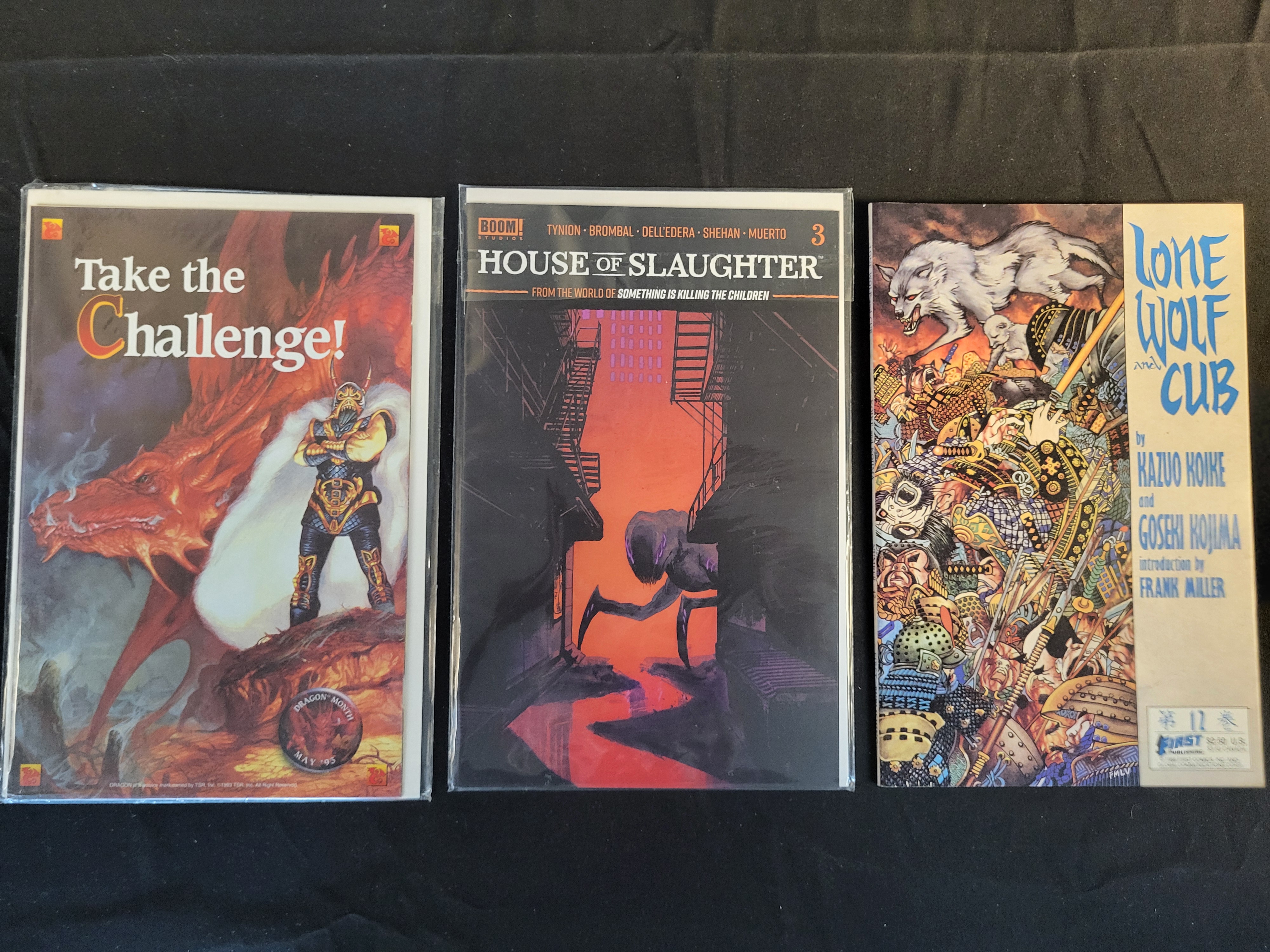 BID PER WHAT YOU SEE IN THE PHOTO, NOT THE AI GENERATED TITLES AND DESCRIPTIONS! A trio of printed items comprising two comic books and one promotional piece. The first item is a TSR, Inc. promotional flyer for Dragon Month May 1993 titled Take the Challenge!, featuring a red dragon and a knight in armor. The second item is House of Slaughter issue number 3, published by BOOM! Studios, set in the world of Something is Killing the Children. The third item is a First Publishing English edition of Lone Wolf and Cub Volume 12 by Kazuo Koike and Goseki Kojima, featuring an introduction by Frank Miller and a cover illustration of a battle scene. The items are printed on paper and cardstock.