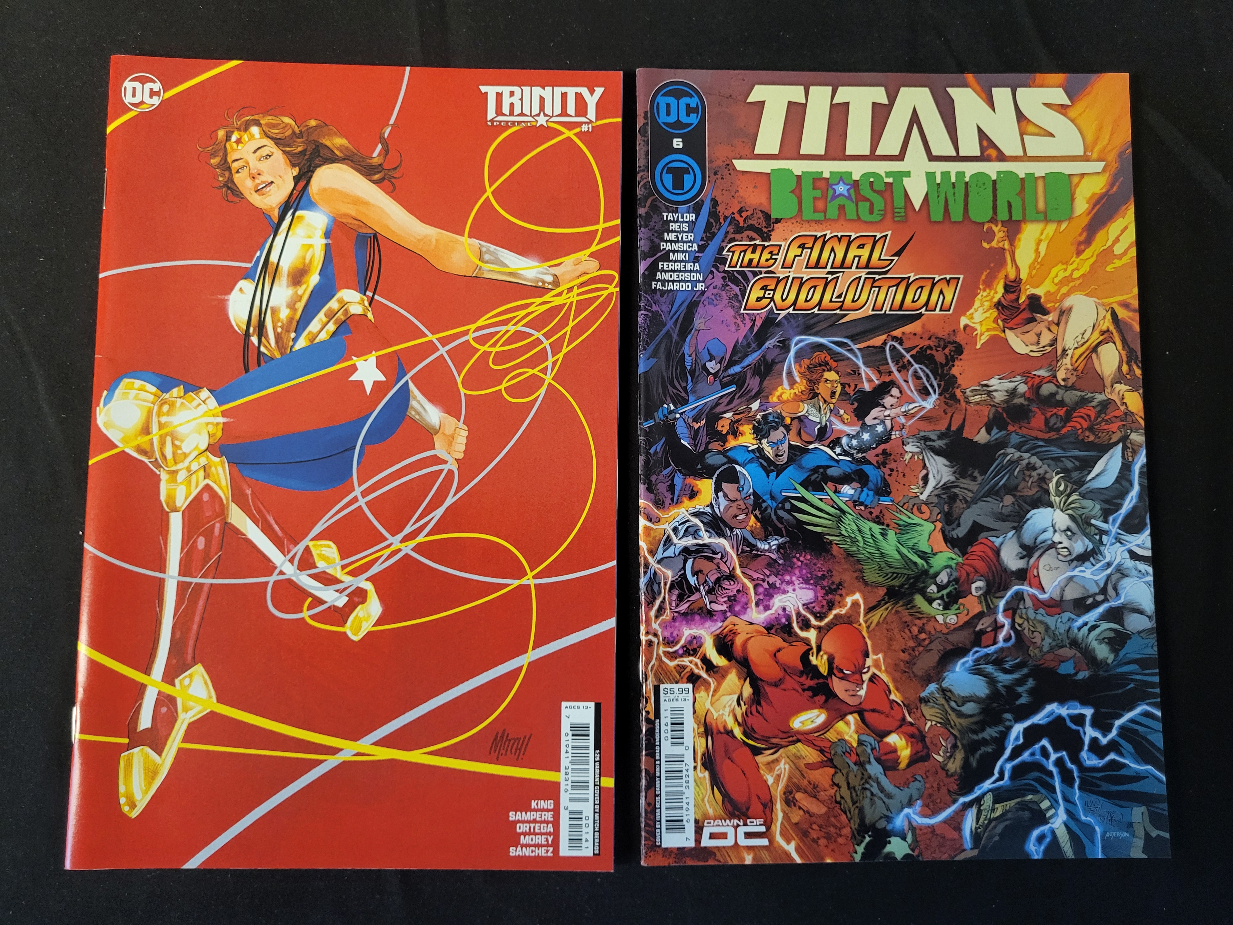 BID PER WHAT YOU SEE IN THE PHOTO, NOT THE AI GENERATED TITLES AND DESCRIPTIONS! Two modern-era staple-bound comic books published by DC Comics. The first item is Trinity Special #1, featuring a 1:25 variant cover by artist Mitch Gerads. The cover illustration depicts the character Trinity against a solid red background with yellow lasso graphics. Creative credits for King, Sampere, Ortega, Morey, and Sanchez are printed on the lower right. The second item is Titans: Beast World #6, subtitled The Final Evolution. The cover features a multi-character action scene including Nightwing, The Flash, Cyborg, and Raven. Creative credits for Taylor, Reis, Meyer, Pansica, Miki, Ferreira, Anderson, and Fajardo Jr. are visible on the left. Both publications feature glossy covers and include printed barcodes, issue numbers, and the DC logo.