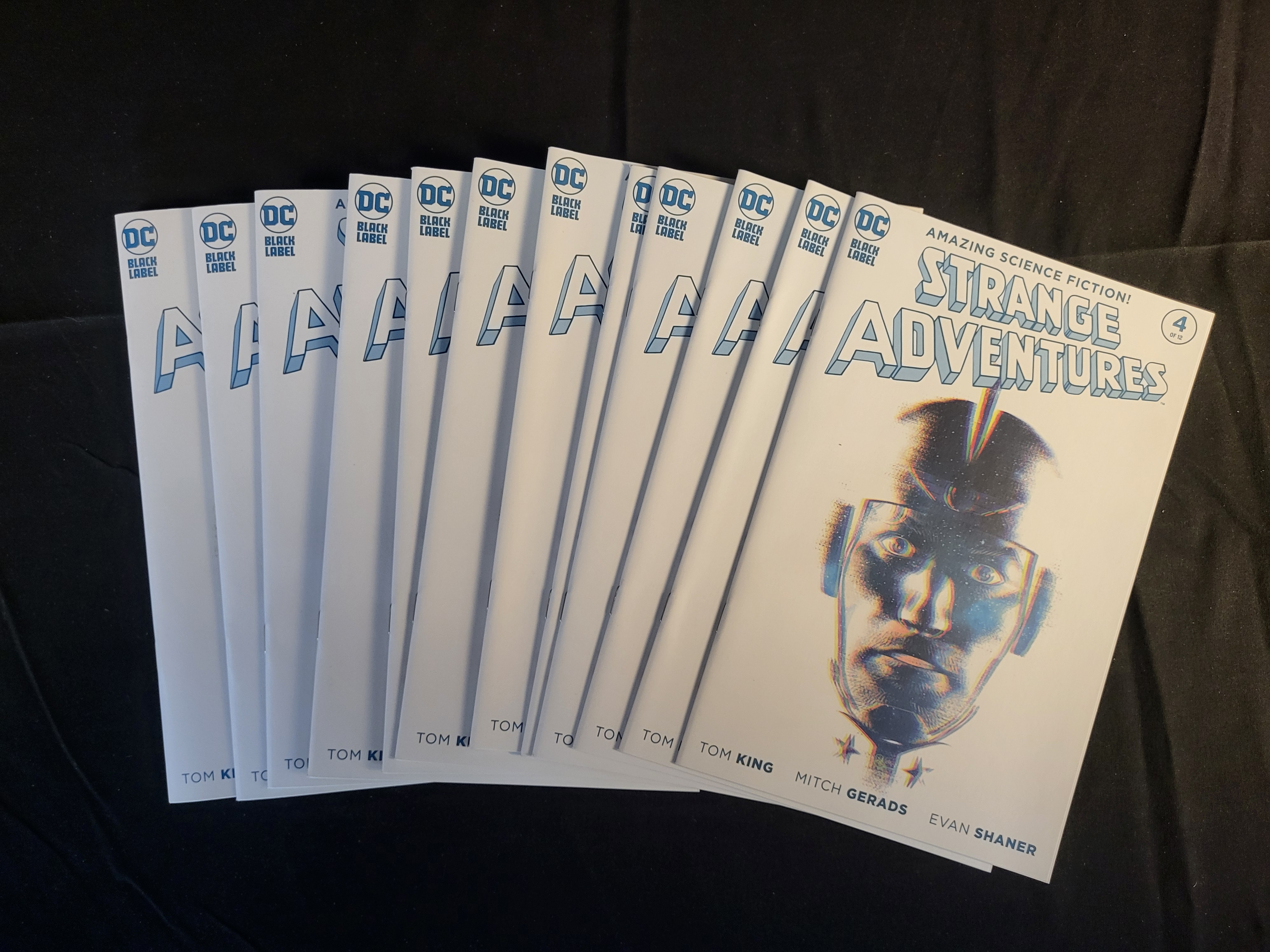 BID PER WHAT YOU SEE IN THE PHOTO, NOT THE AI GENERATED TITLES AND DESCRIPTIONS! A group of modern comic books from the DC Black Label limited series Strange Adventures, issue number 4 of 12, published in 2020. These copies feature the Cover B variant design by artist Evan Doc Shaner. The cover art displays a white background with a central portrait of a character in a futuristic helmet, utilizing a chromatic aberration effect. Text on the cover includes the title Strange Adventures, the tagline Amazing Science Fiction!, and credits for writer Tom King and artists Mitch Gerads and Evan Shaner. The DC Black Label logo is situated in the upper left corner.