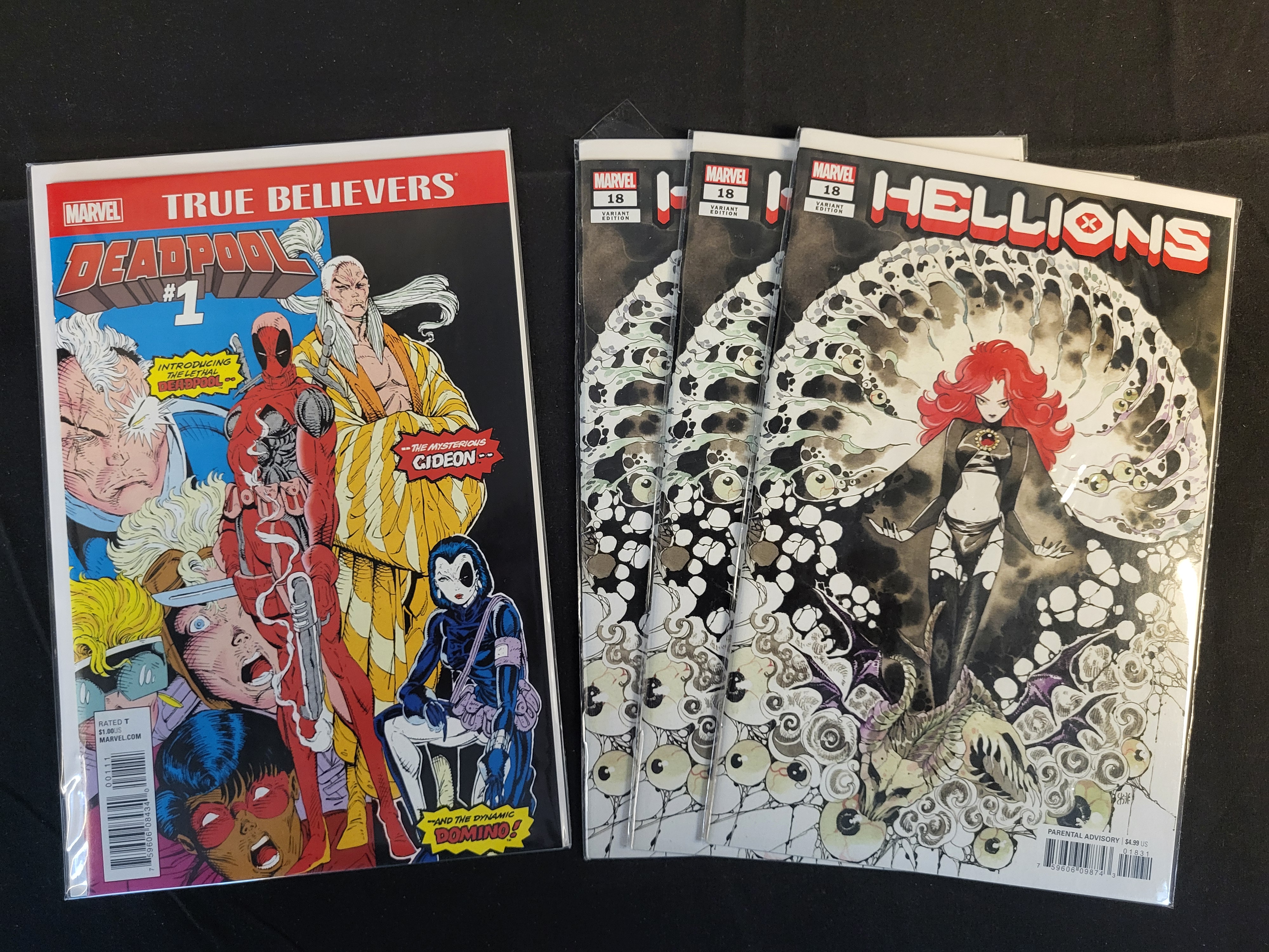 BID PER WHAT YOU SEE IN THE PHOTO, NOT THE AI GENERATED TITLES AND DESCRIPTIONS! A collection of modern-era Marvel comic books including several copies of Hellions #18 and a copy of True Believers Deadpool #1. The Hellions issues feature the Peach Momoko variant cover depicting Madelyne Pryor. The True Believers Deadpool #1 issue features character art of Deadpool, Gideon, and Domino. The comics are constructed with standard staple-bound paper covers and interiors. Visible markings include the Marvel logo, issue numbers, UPC codes, and original retail pricing.