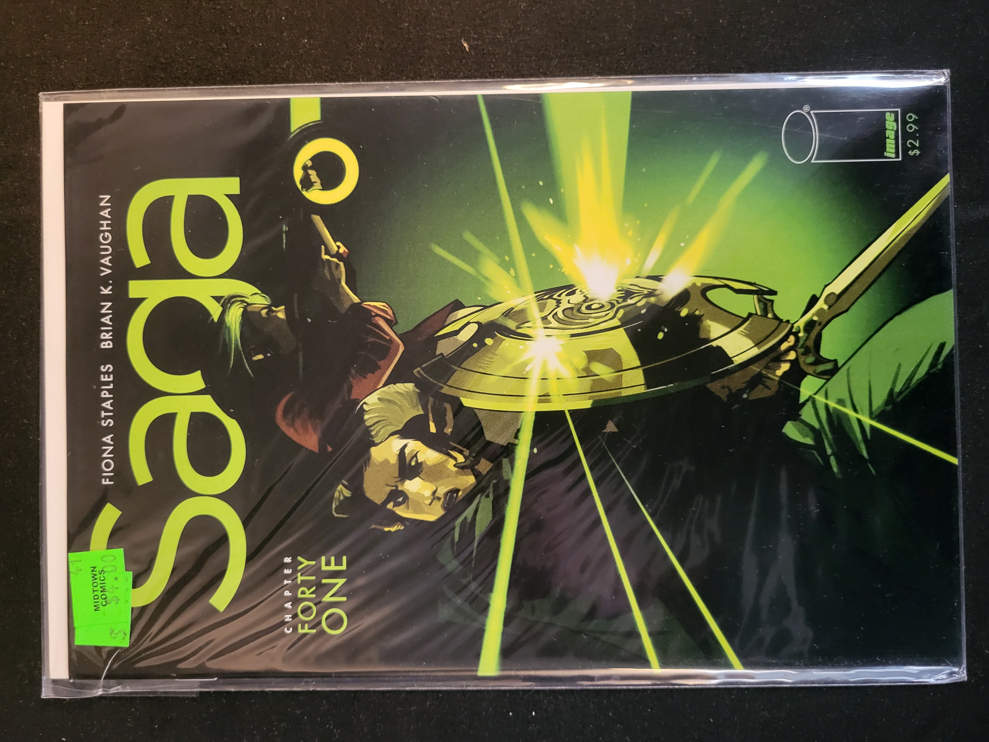 BID PER WHAT YOU SEE IN THE PHOTO, NOT THE AI GENERATED TITLES AND DESCRIPTIONS! This comic book is Saga Chapter Forty One, published by Image Comics. Based on market consensus, this specific issue is the recalled version, which was noted for a coloring error on the cover. The book features a story by Brian K. Vaughan and cover artwork by Fiona Staples. The cover illustration depicts two characters in a dynamic scene where one character holds a shield that is being struck by beams of light. Printed text on the cover includes the title Saga, the creators names, the designation Chapter Forty One, the Image publisher logo, and an original retail price of $2.99. The comic is housed in a clear plastic protective sleeve with a white backing board. A green Midtown Comics price sticker is present on the exterior of the plastic sleeve.
