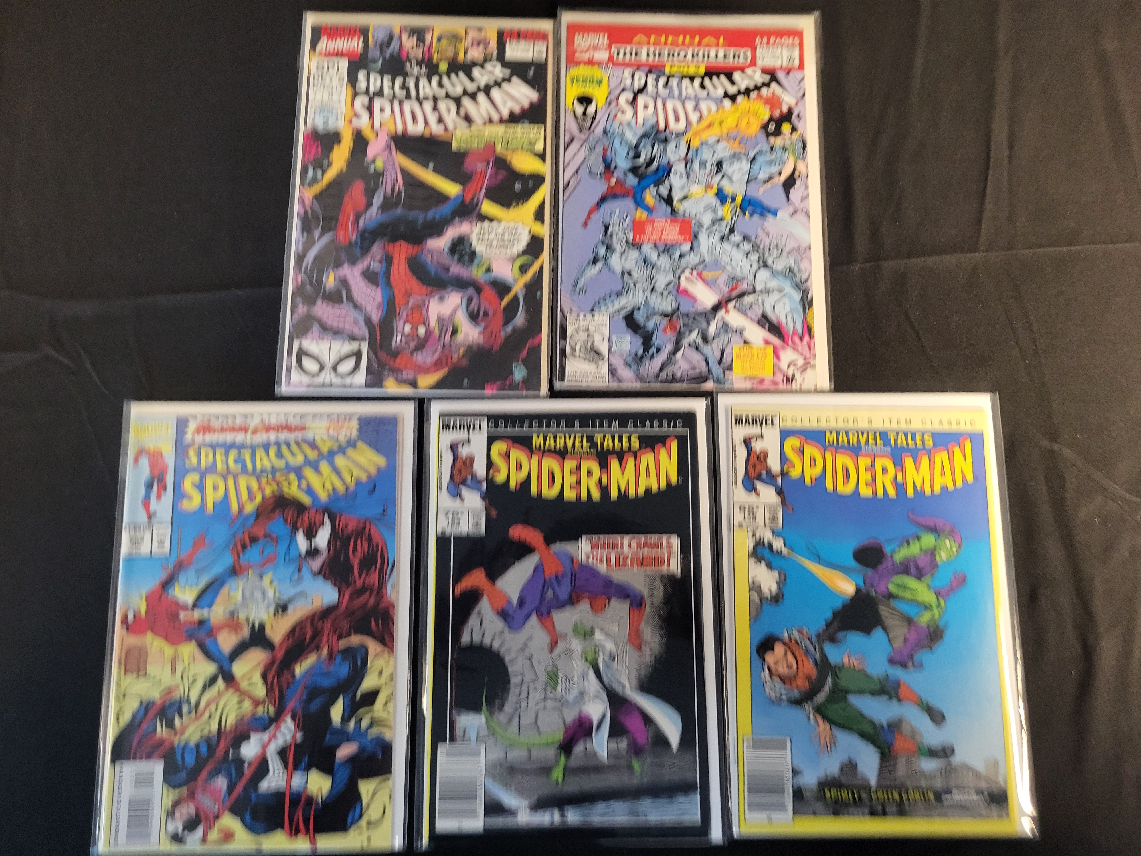 BID PER WHAT YOU SEE IN THE PHOTO, NOT THE AI GENERATED TITLES AND DESCRIPTIONS! A collection of Marvel comic books featuring Spider-Man, primarily published during the late 1980s and early 1990s. The group includes titles such as The Spectacular Spider-Man and Marvel Tales Starring Spider-Man. Specific issues include The Spectacular Spider-Man Annual #11, The Spectacular Spider-Man Annual #12, The Spectacular Spider-Man #189 featuring Carnage, Marvel Tales #184 (reprinting Amazing Spider-Man #44 featuring the Lizard), and Marvel Tales #235 featuring the Green Goblin. Each comic book is individually housed in a protective plastic sleeve with a cardboard backing board.