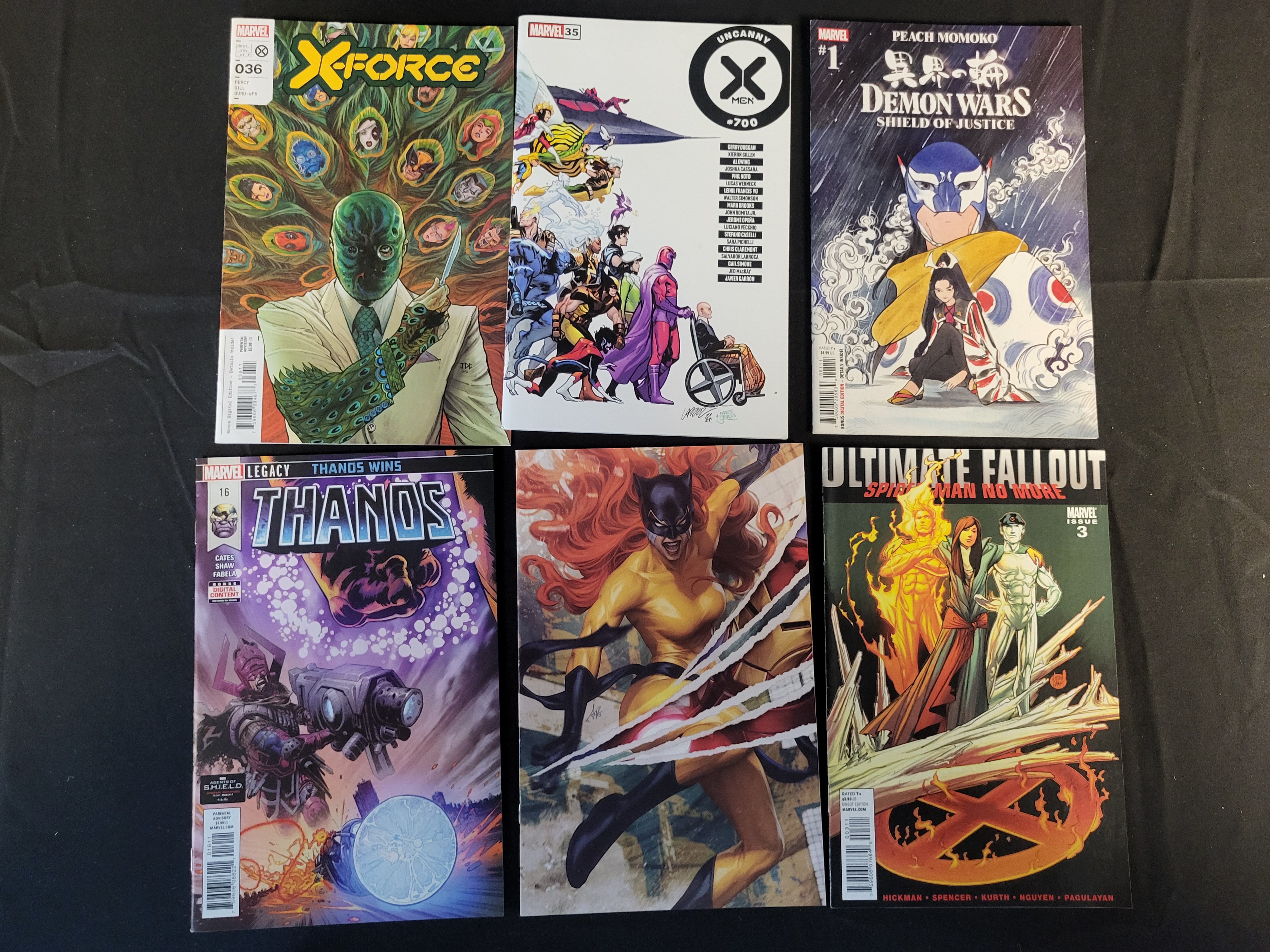 BID PER WHAT YOU SEE IN THE PHOTO, NOT THE AI GENERATED TITLES AND DESCRIPTIONS! A group of modern Marvel comic books featuring various titles and characters from the X-Men, Thanos, and Ultimate Spider-Man franchises. The collection includes Demon Wars: Shield of Justice #1 (2022) with cover art by Peach Momoko, X-Force #036, X-Men #35 (Legacy #700), Thanos #16, and Ultimate Fallout #3. Also included is a variant cover featuring Jean Grey in a yellow and black costume. The comics are printed in color on glossy paper. Notable creators credited on the covers include Donny Cates, Peach Momoko, and Jonathan Hickman. The text is primarily in English, with Japanese characters featured on the Peach Momoko cover.