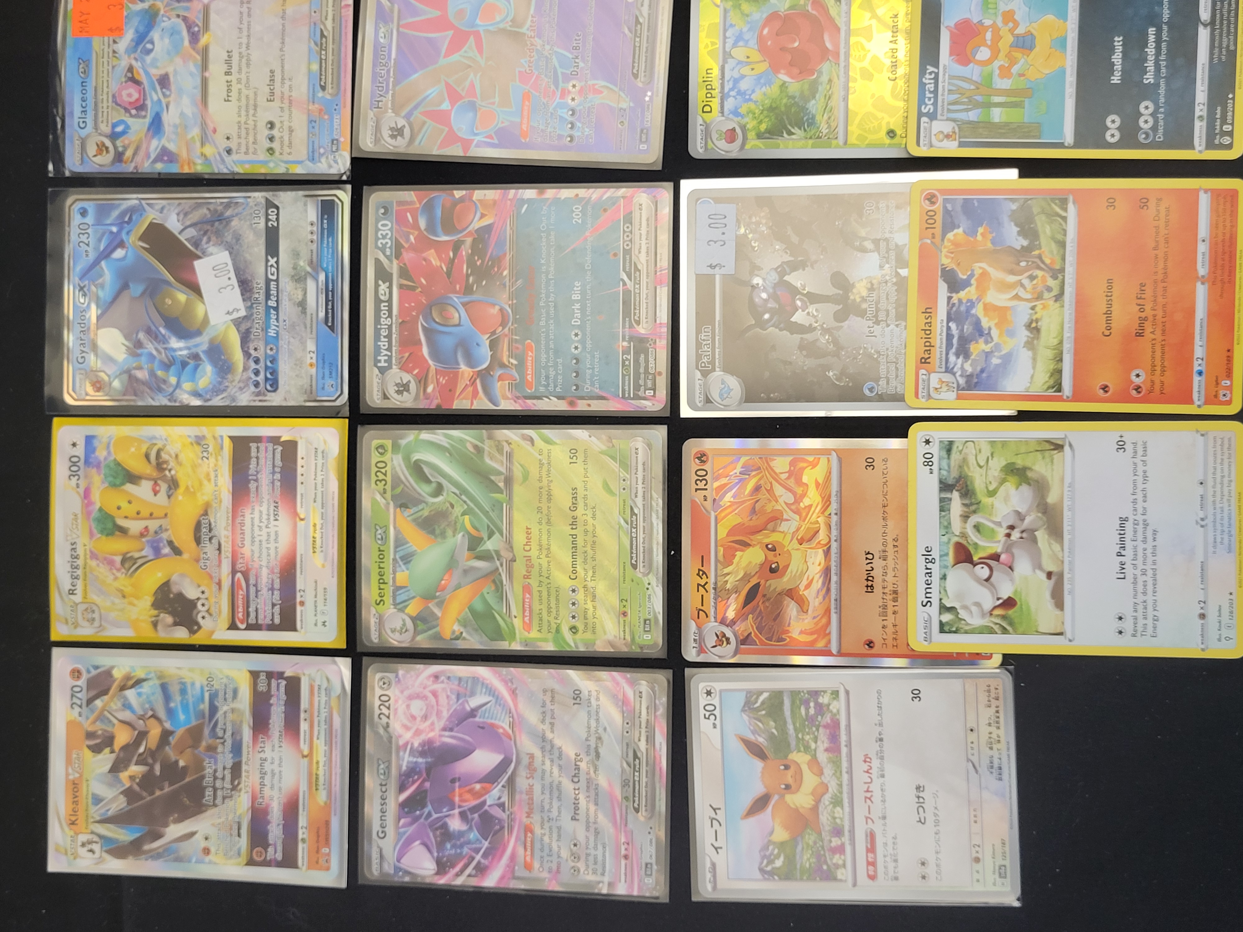 BID PER WHAT YOU SEE IN THE PHOTO, NOT THE AI GENERATED TITLES AND DESCRIPTIONS! A collection of modern Pokemon Trading Card Game (TCG) cards featuring a variety of specialty rarities and holographic finishes. The group includes several high-rarity cards such as Kleavor VSTAR, Regigigas VSTAR, Gyarados GX, and Glaceon GX. Also present are multiple ex-series cards including Whimsicott, Genesect, Serperior, Hydreigon, and Zekrom. The collection further contains standard and holographic cards such as Palafin, Dipplin, Milcery, Smeargle, Rapidash, and Scrafty. Two Japanese-language cards are included, featuring Eevee (イーブイ) and Flareon (ブースター). The cards are printed on standard cardstock with various foil, textured, and matte finishes consistent with modern TCG production.