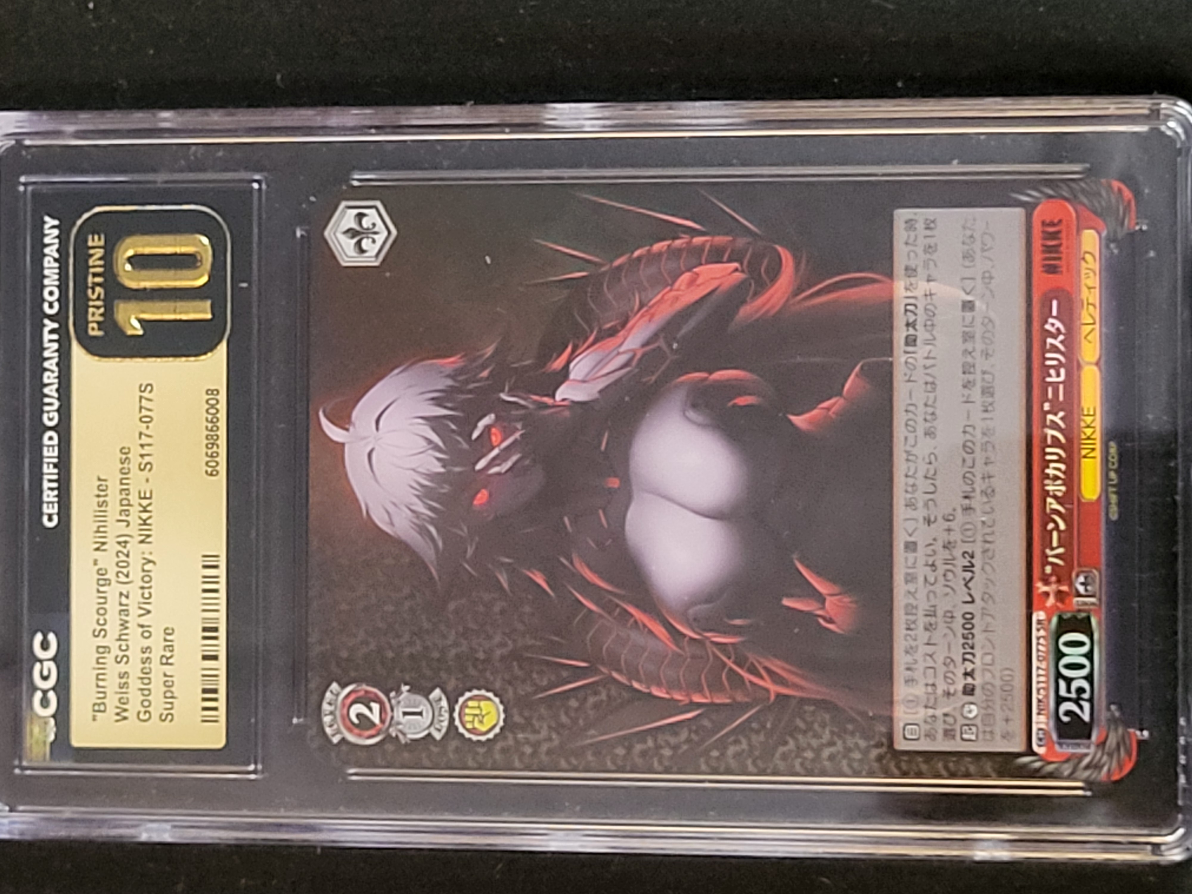 BID PER WHAT YOU SEE IN THE PHOTO, NOT THE AI GENERATED TITLES AND DESCRIPTIONS! A Japanese language Bushiroad Weiss Schwarz trading card from the 2024 Goddess of Victory: NIKKE booster set. The card features the character Nihilister, titled Burning Scourge, with the identification number S117-077S and a Super Rare (SR) rarity designation. The artwork depicts the character in a dark, stylized composition with metallic elements. The reverse side displays the standard Weiss Schwarz logo and design. The card is professionally encapsulated in a Certified Guaranty Company (CGC) protective holder featuring a gold label. The slab includes a unique serial number 6069866008 and a QR code for authenticity verification on the reverse.