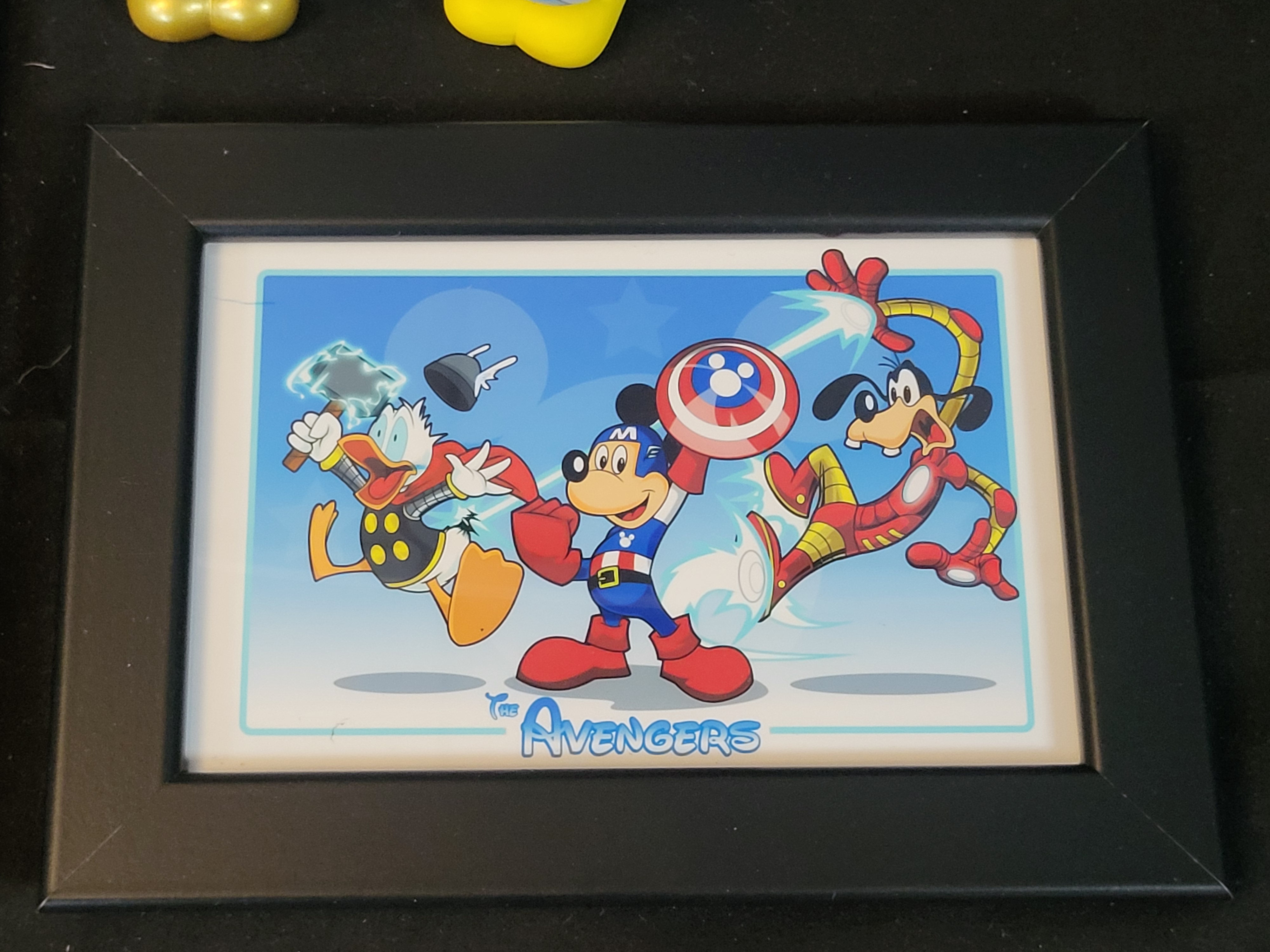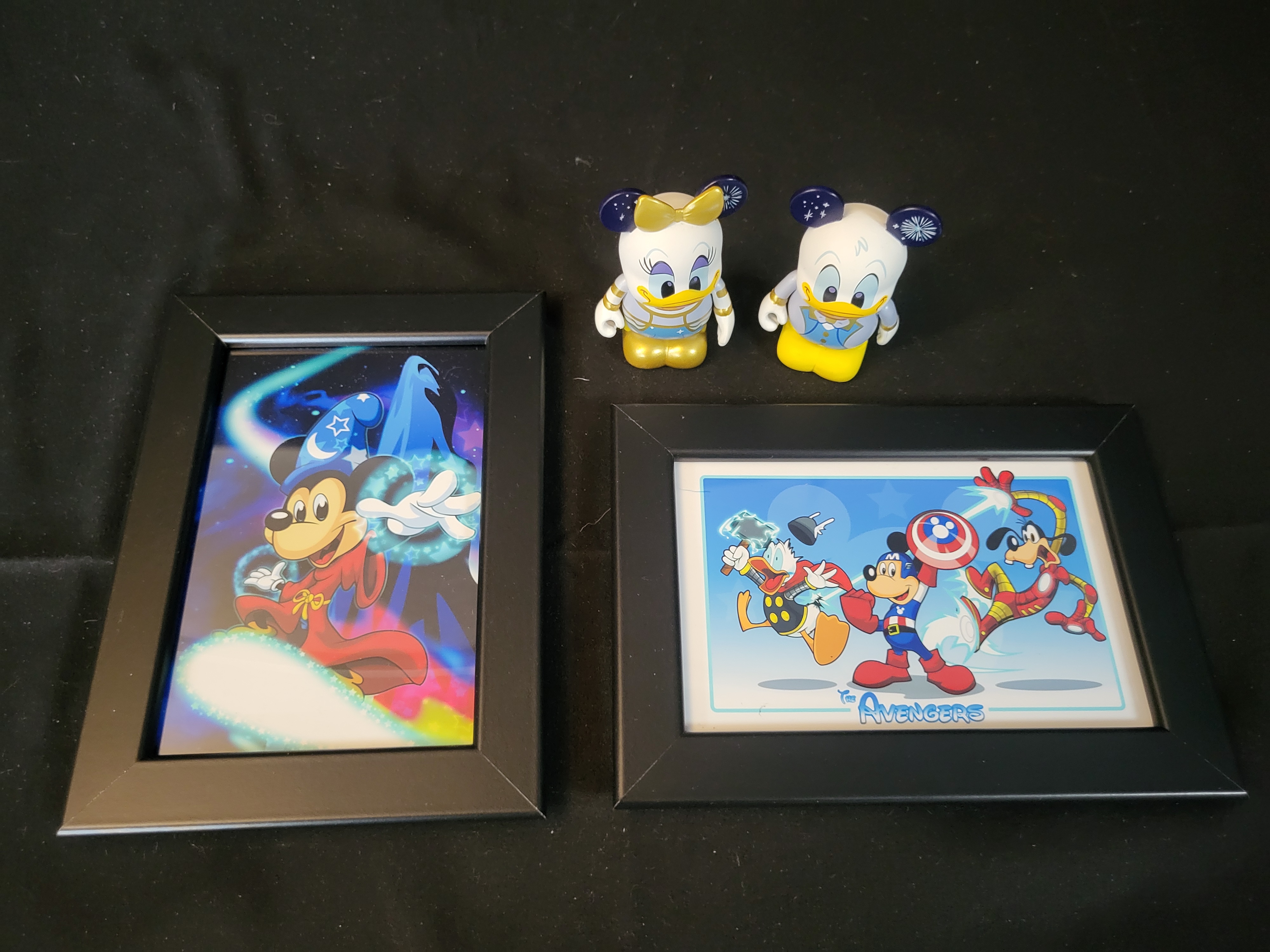 BID PER WHAT YOU SEE IN THE PHOTO, NOT THE AI GENERATED TITLES AND DESCRIPTIONS! A collection of contemporary Disney-themed collectibles featuring characters from the Mickey Mouse and Friends franchise. The group includes framed prints, one depicting Mickey Mouse as the Sorcerer Apprentice and another featuring a crossover illustration titled The Avengers. This second print depicts Mickey Mouse as Captain America, Donald Duck as Thor, and Goofy as Iron Man, consistent with the Disney celebratory variant series for the Avengers 60th anniversary. Both prints are presented in black frames under glazing. The collection also includes molded plastic vinyl figures of Donald Duck and Daisy Duck. These figures are styled with the characteristic Mickey Mouse ear silhouette, decorated with star and firework patterns. The figures are finished in a celebratory color palette of white, blue, and gold.
