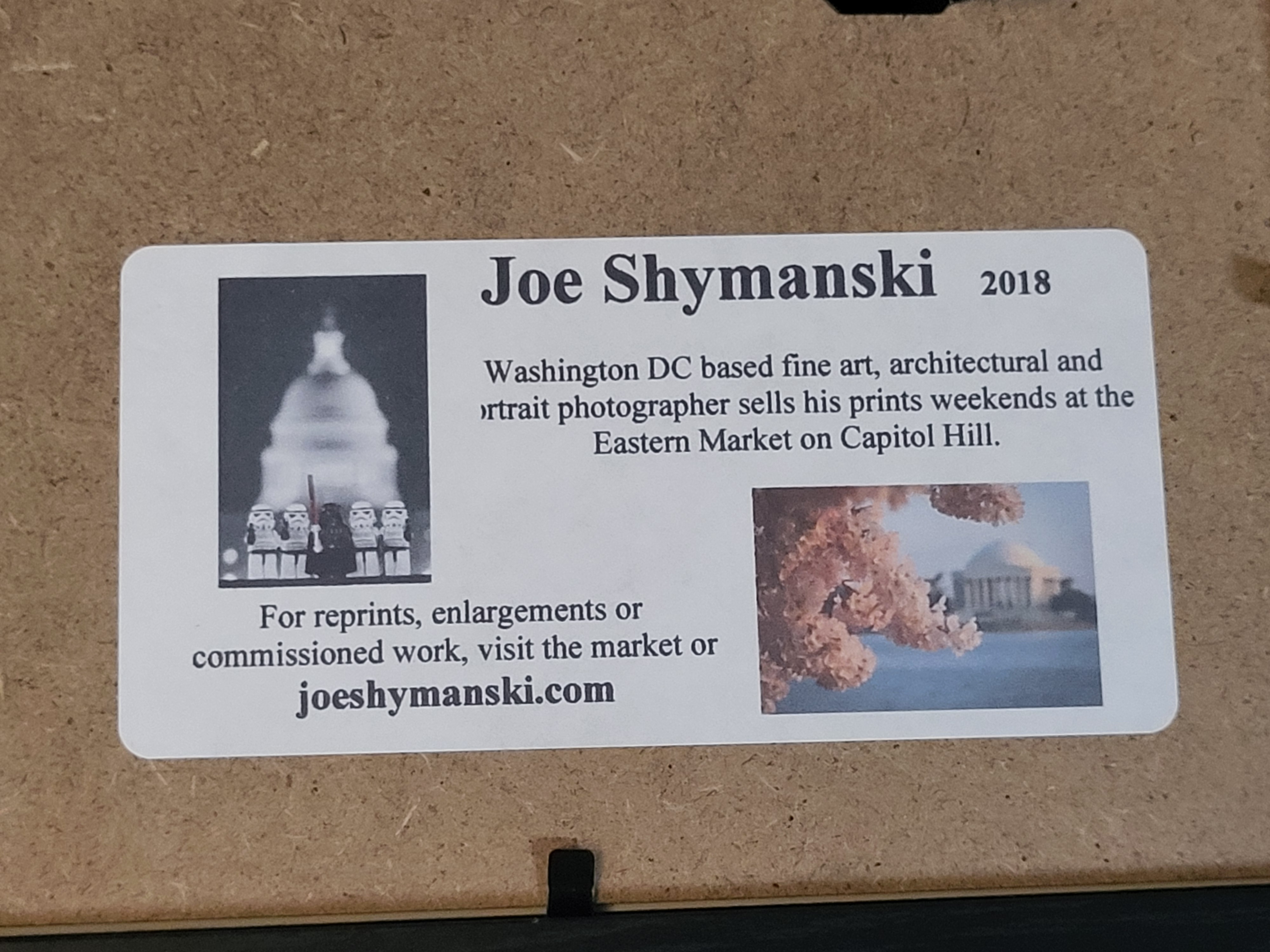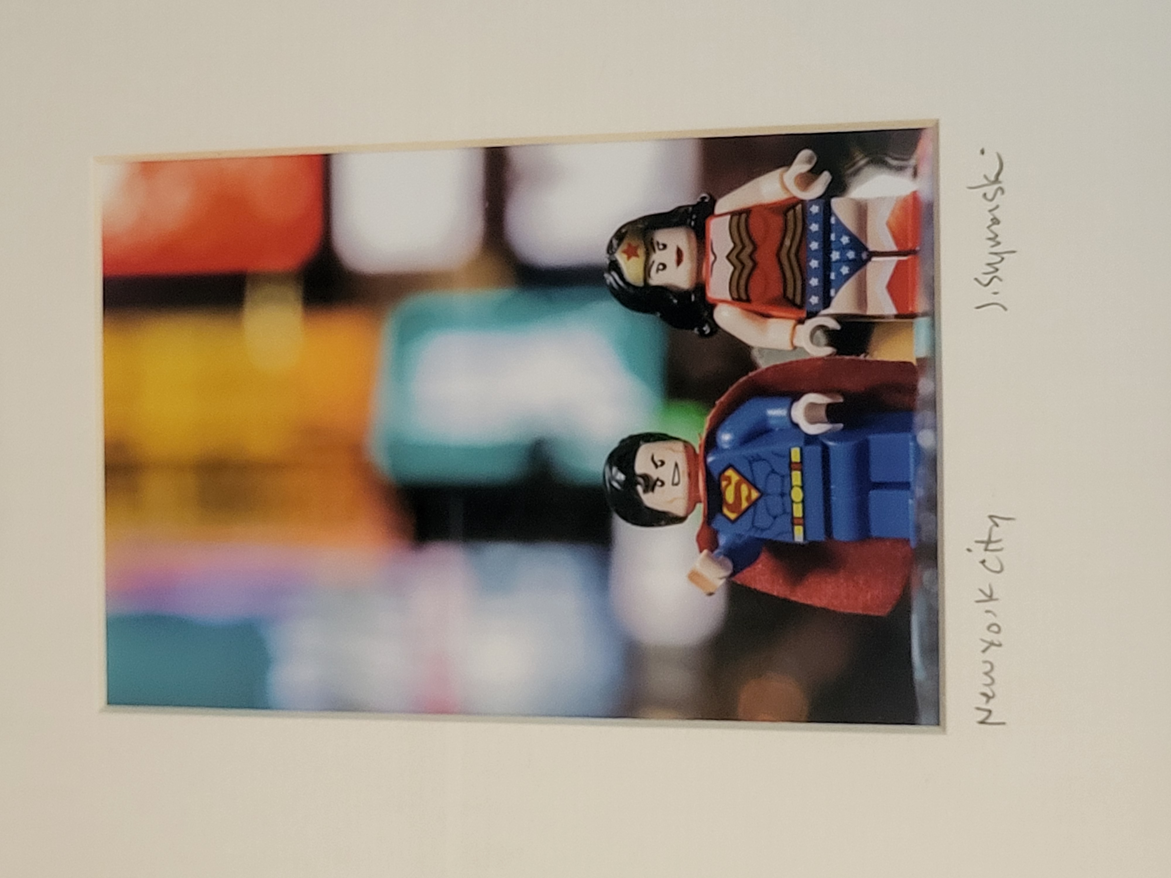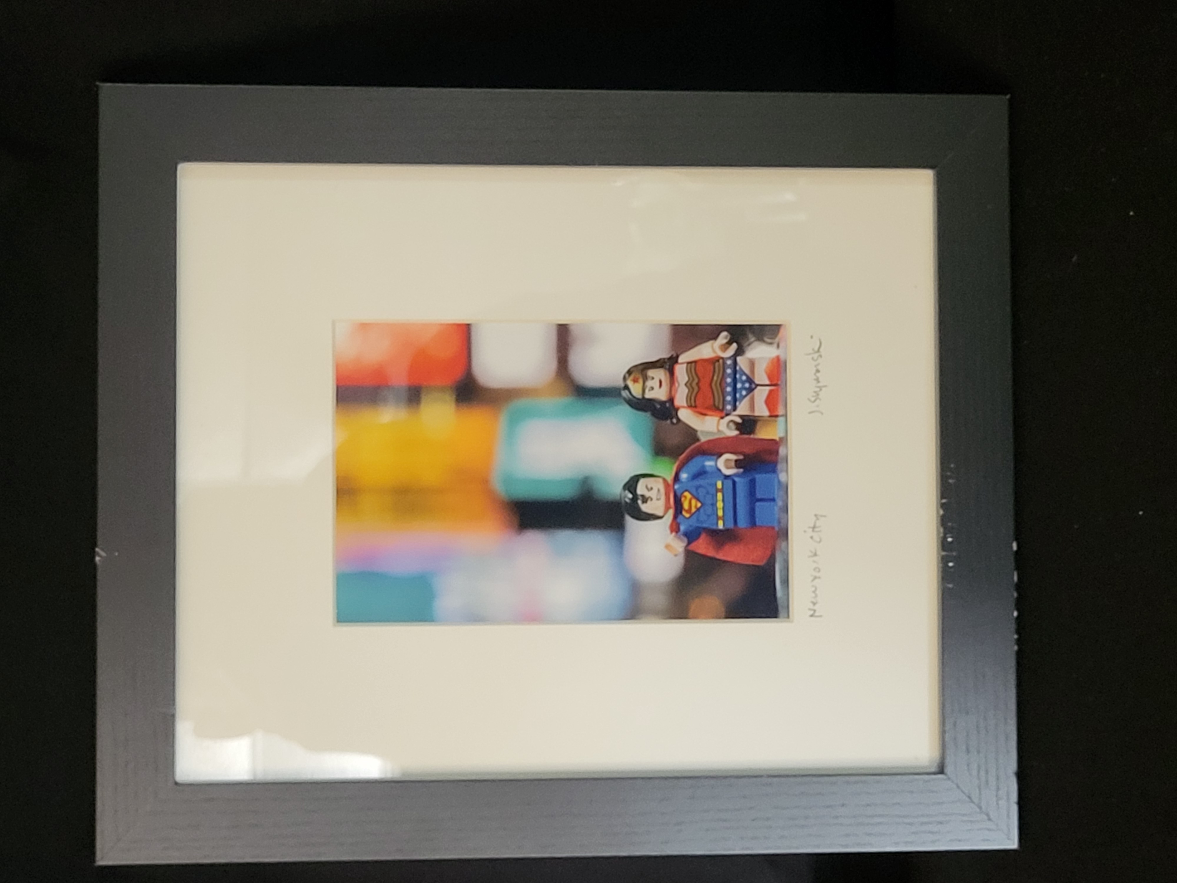 BID PER WHAT YOU SEE IN THE PHOTO, NOT THE AI GENERATED TITLES AND DESCRIPTIONS! This contemporary color photograph by artist Joe Shymanski, dated 2018, features LEGO minifigures of the DC Comics characters Superman and Wonder Woman set against a shallow-focus, colorful urban backdrop. The print is professionally mounted within a white mat and housed in a dark, wood-grain finished frame under glass. The mat is hand-inscribed in pencil with the title New York City on the lower left and the artist signature J. Shymanski on the lower right. A biographical label for the photographer is affixed to the reverse of the frame, identifying him as a Washington D.C. based artist.