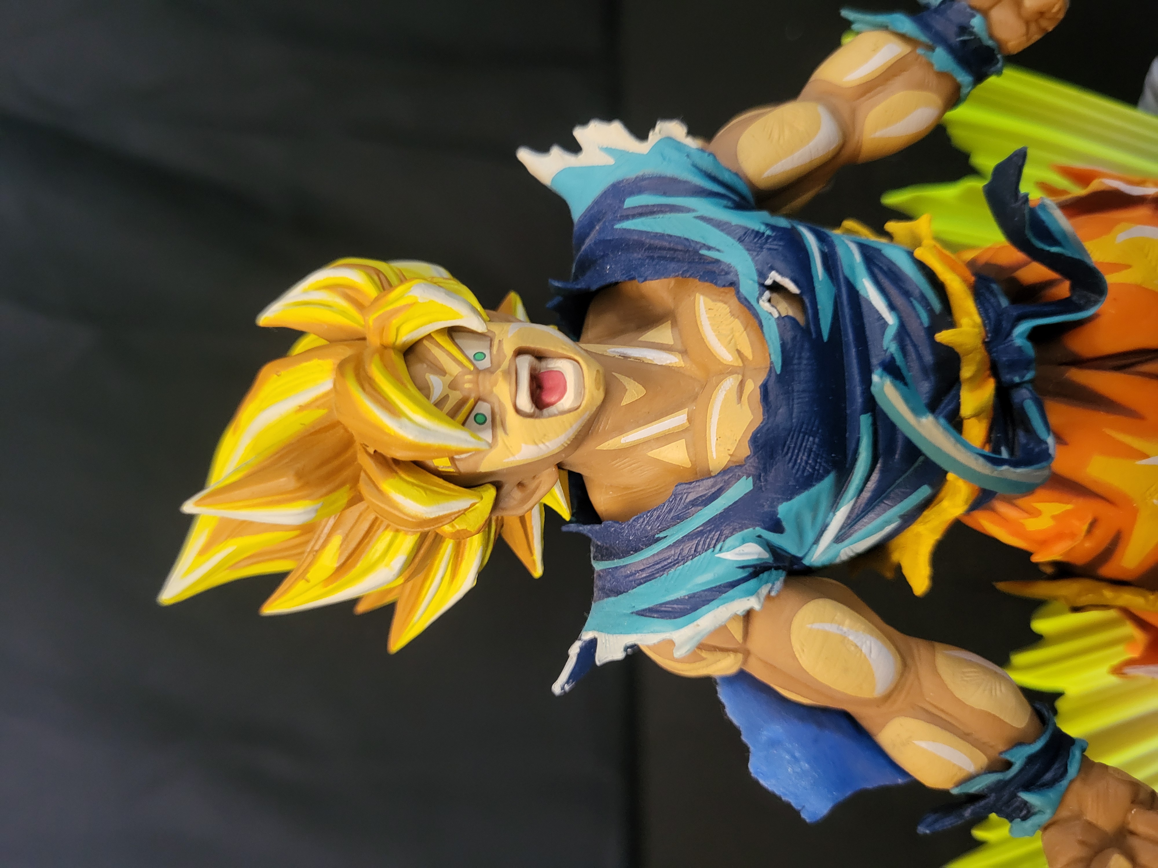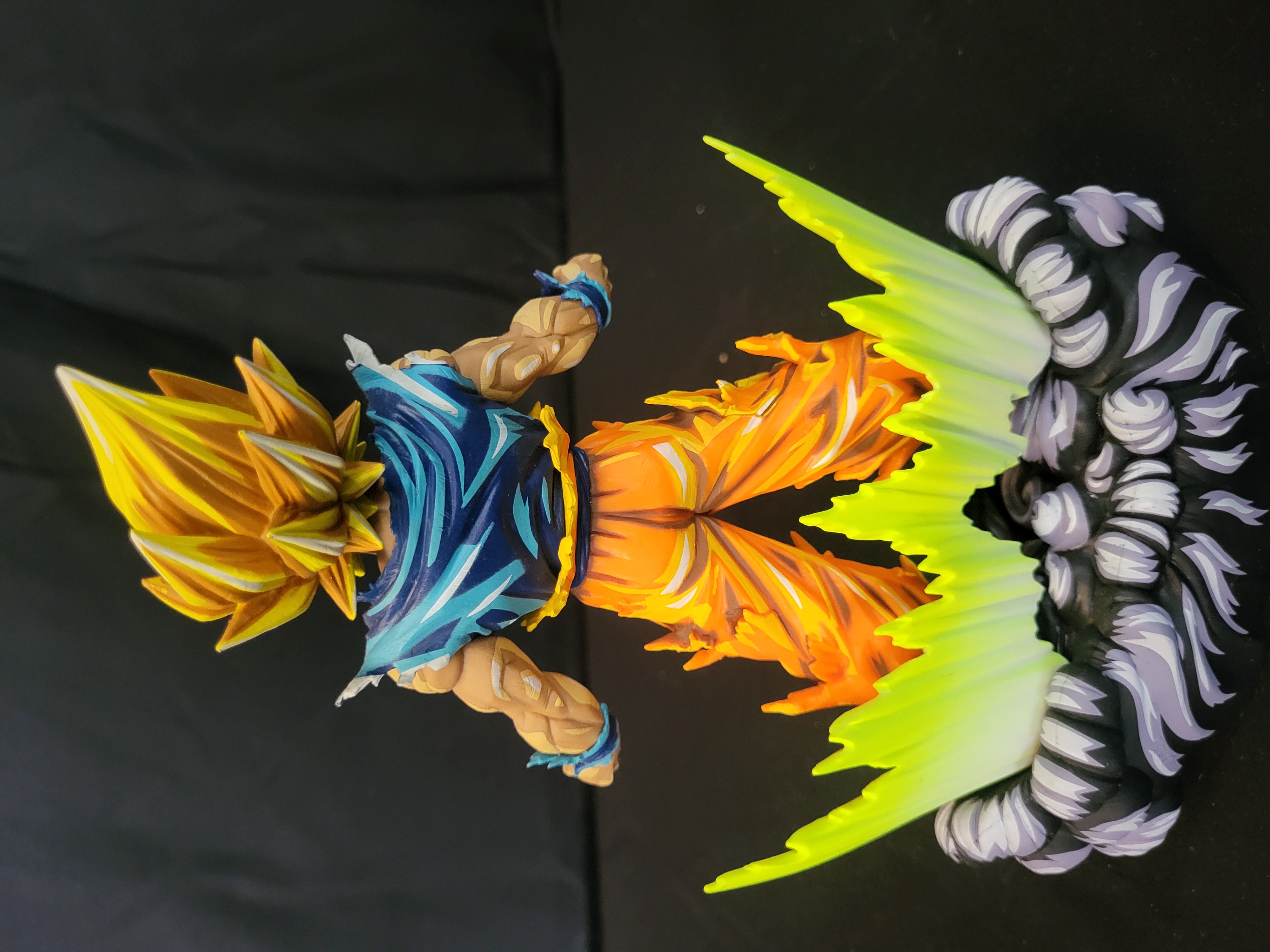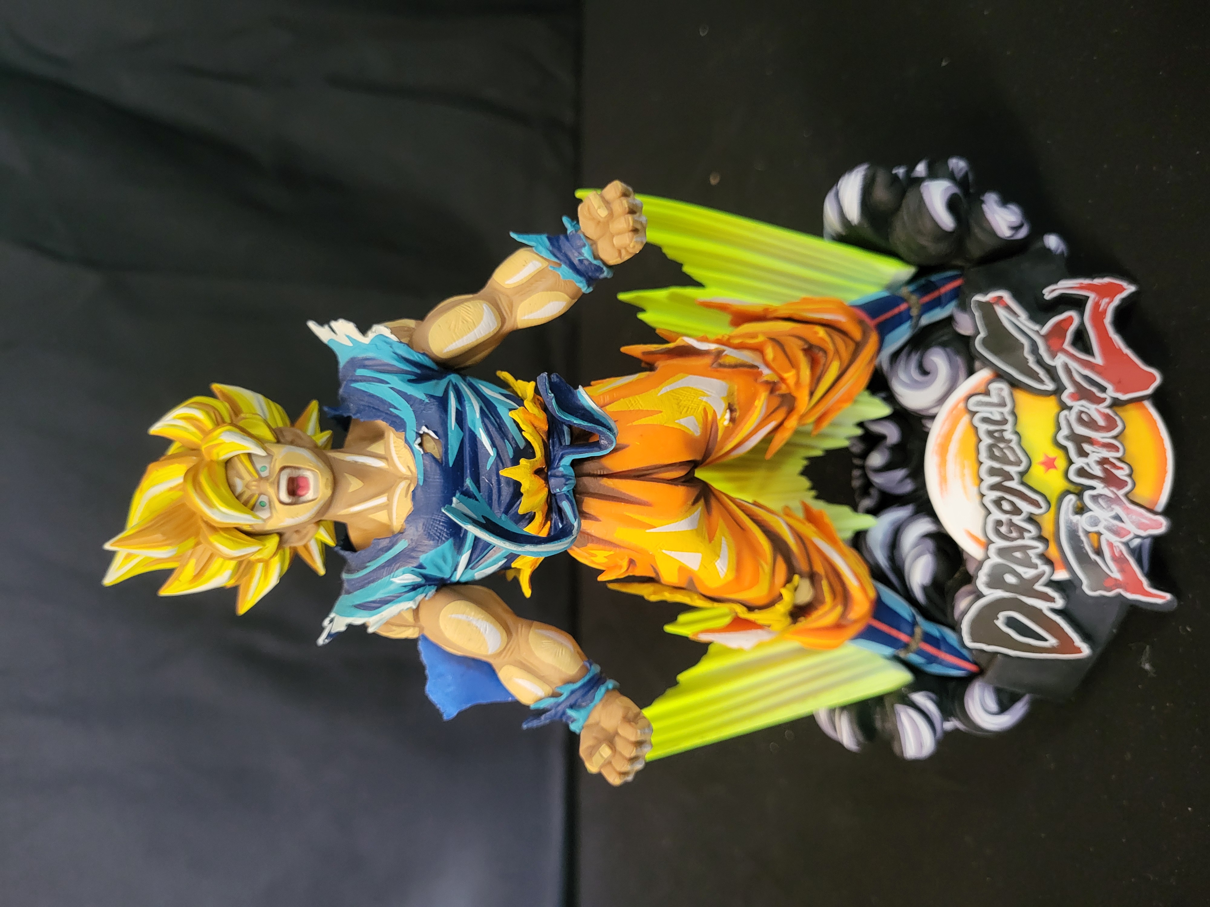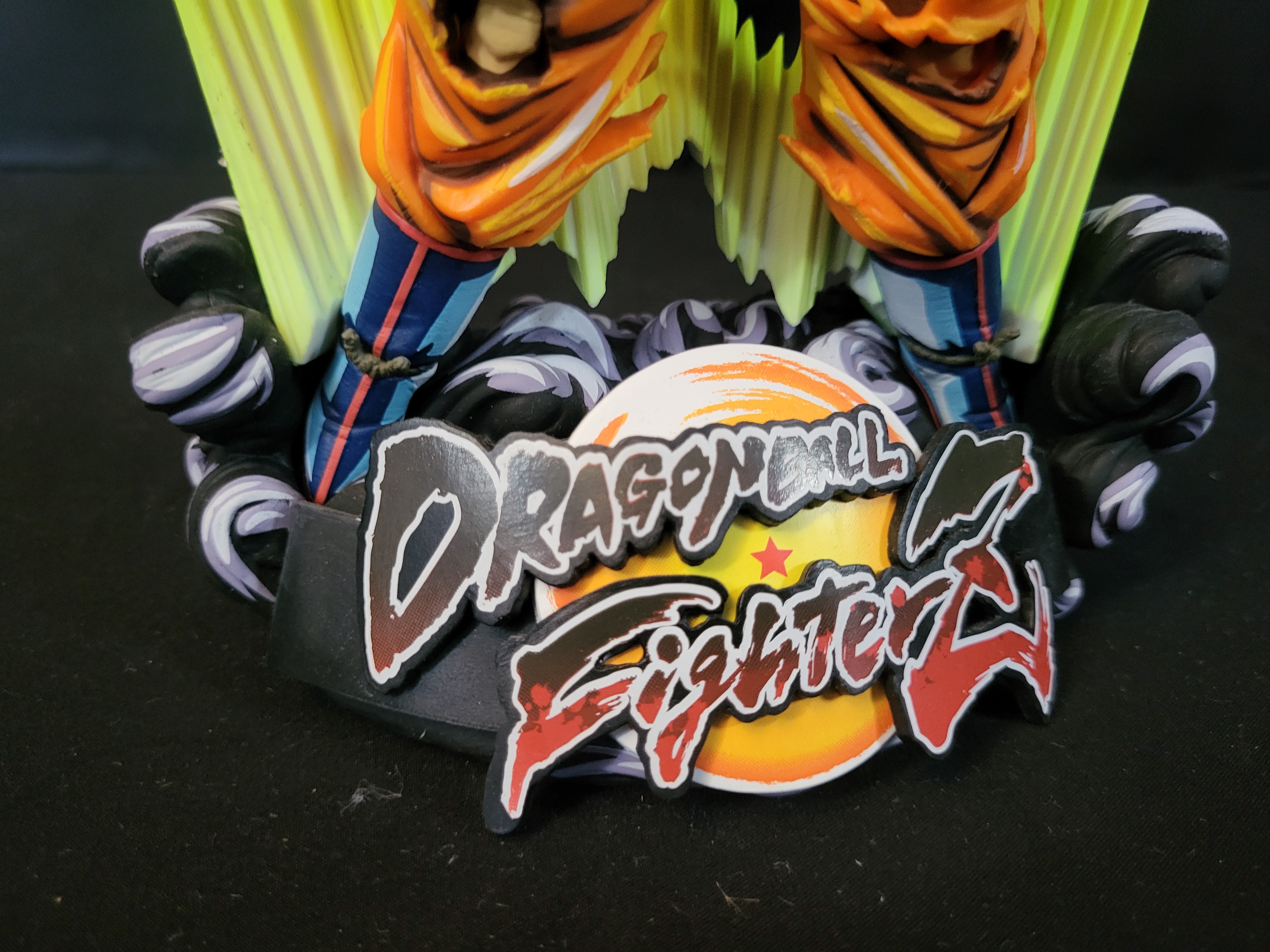 BID PER WHAT YOU SEE IN THE PHOTO, NOT THE AI GENERATED TITLES AND DESCRIPTIONS! This Dragon Ball FighterZ Collector Edition Super Saiyan Goku statue is a stylized collectible figure featuring a distinct two-dimensional or manga-style paint application. The cel-shaded finish utilizes high-contrast highlights and shadows to emulate the appearance of a flat illustration. The figure depicts the character Goku in a battle-damaged state, characterized by torn clothing, clenched fists, and a shouting facial expression. Constructed from molded PVC, the figure is permanently mounted to an integrated diorama base. The base includes stylized purple and white smoke plumes and jagged yellow-green energy aura effects. The front of the base features a raised Dragon Ball FighterZ logo.