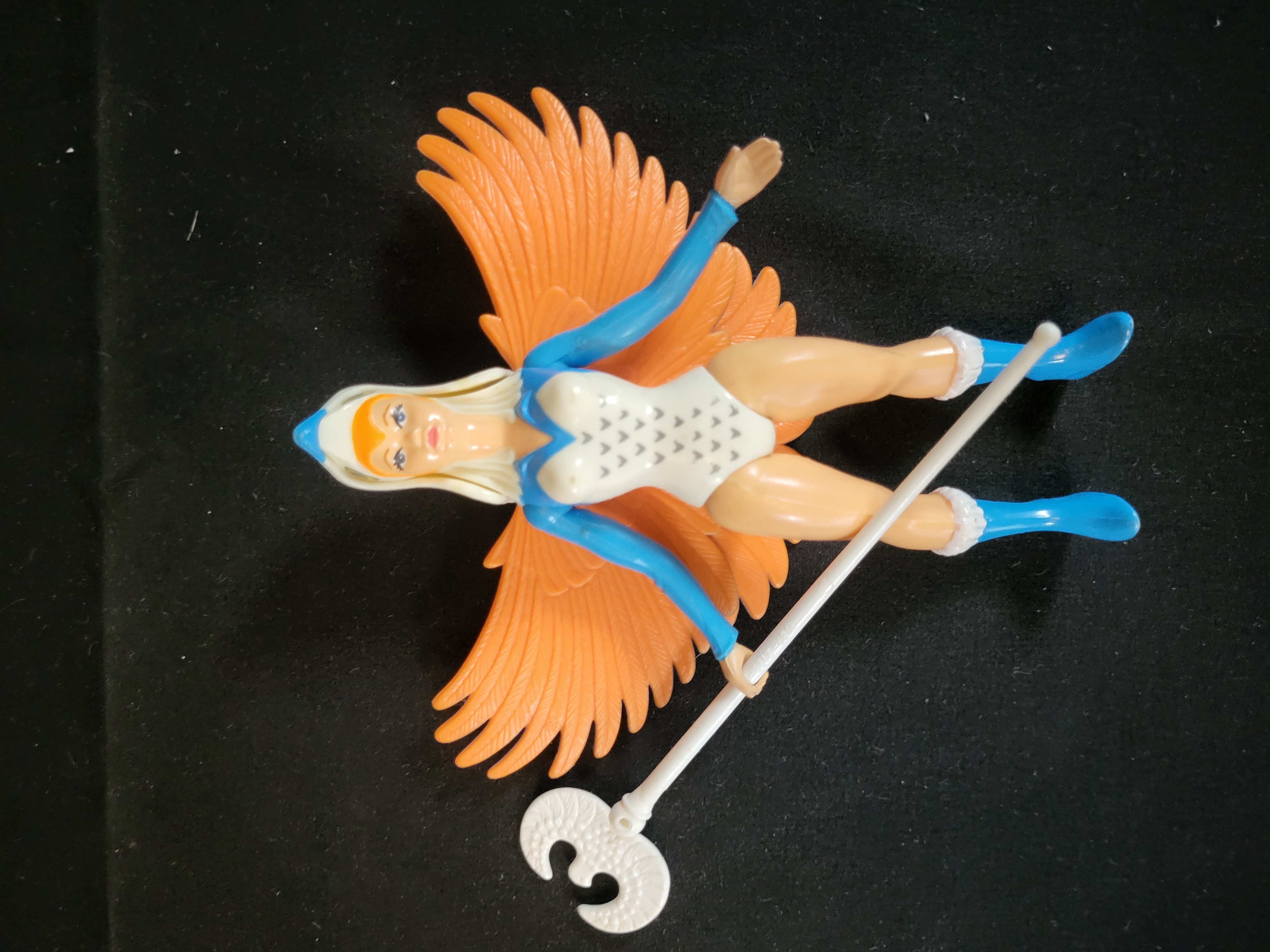 BID PER WHAT YOU SEE IN THE PHOTO, NOT THE AI GENERATED TITLES AND DESCRIPTIONS! A Mattel Masters of the Universe Sorceress action figure. This molded plastic figure features a white and blue patterned leotard, articulating orange wings with blue-painted tips, and a white bird-form headdress over blonde hair. The figure is accompanied by a white plastic staff accessory. The reverse of the wings is embossed with the markings © Mattel, Inc. 1986 and HONG KONG.