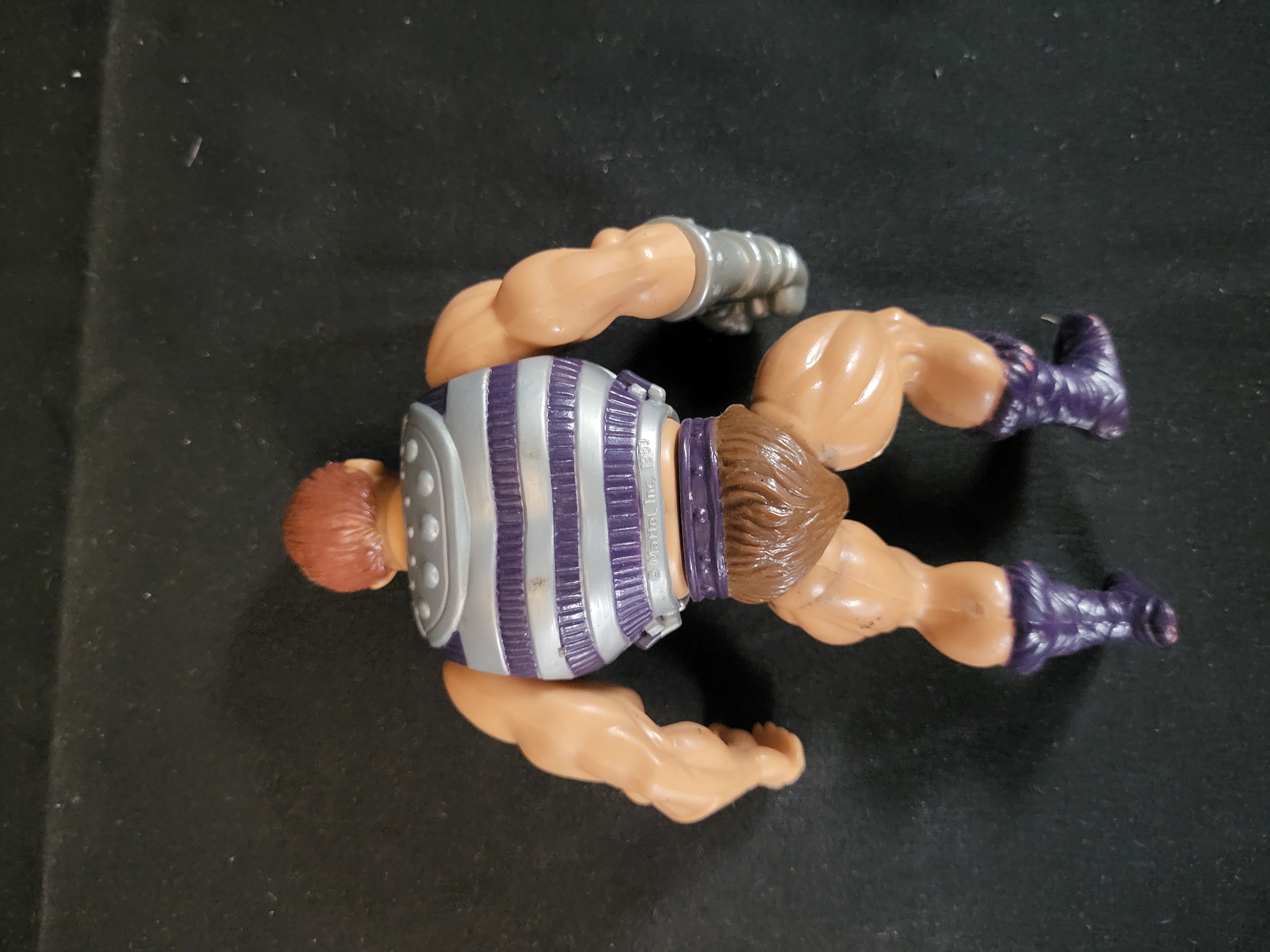 BID PER WHAT YOU SEE IN THE PHOTO, NOT THE AI GENERATED TITLES AND DESCRIPTIONS! A vintage molded plastic action figure of the character Fisto from the Masters of the Universe line, manufactured by Mattel. The figure features an oversized silver-toned gauntlet on the right hand and a removable silver and purple striped breastplate. The character is detailed with sculpted red hair and a beard, a brown textured loincloth, and purple boots. The reverse of the removable chest armor is marked with the copyright inscription © Mattel, Inc. 1983. This lot includes the figure and armor only.