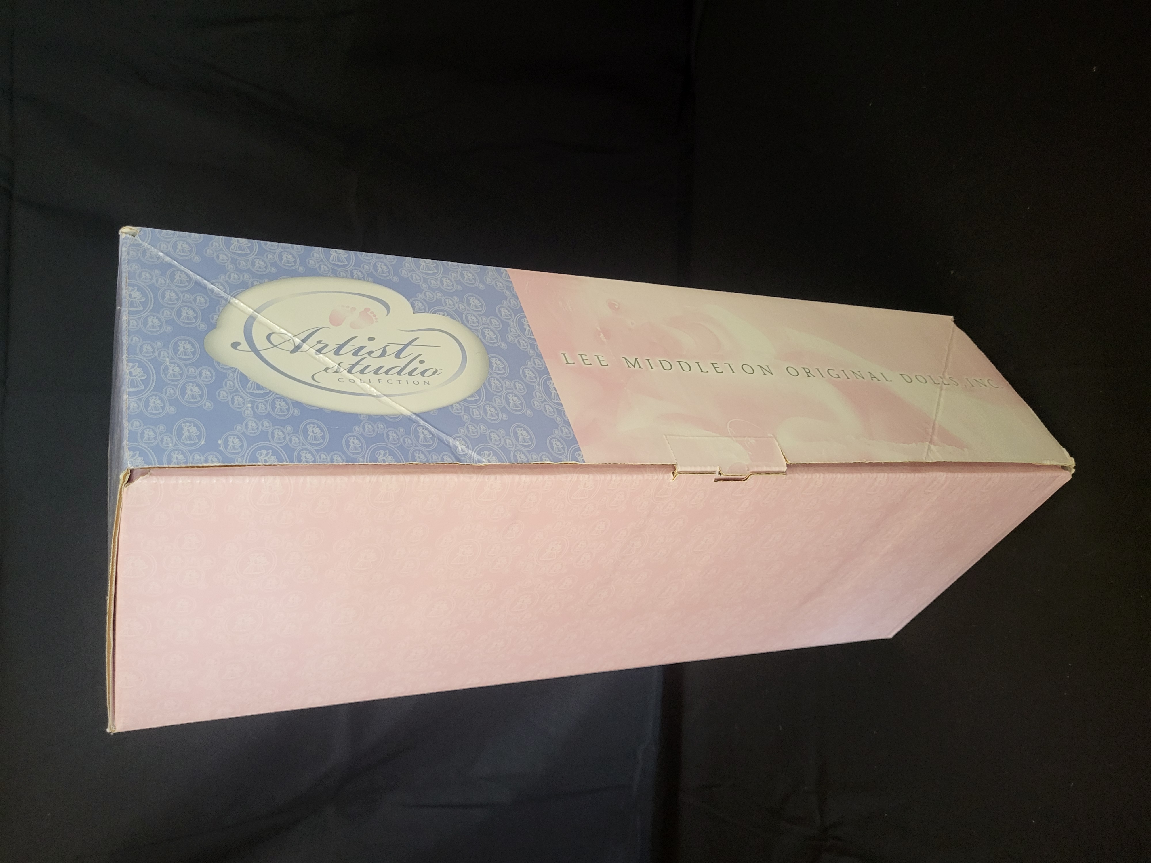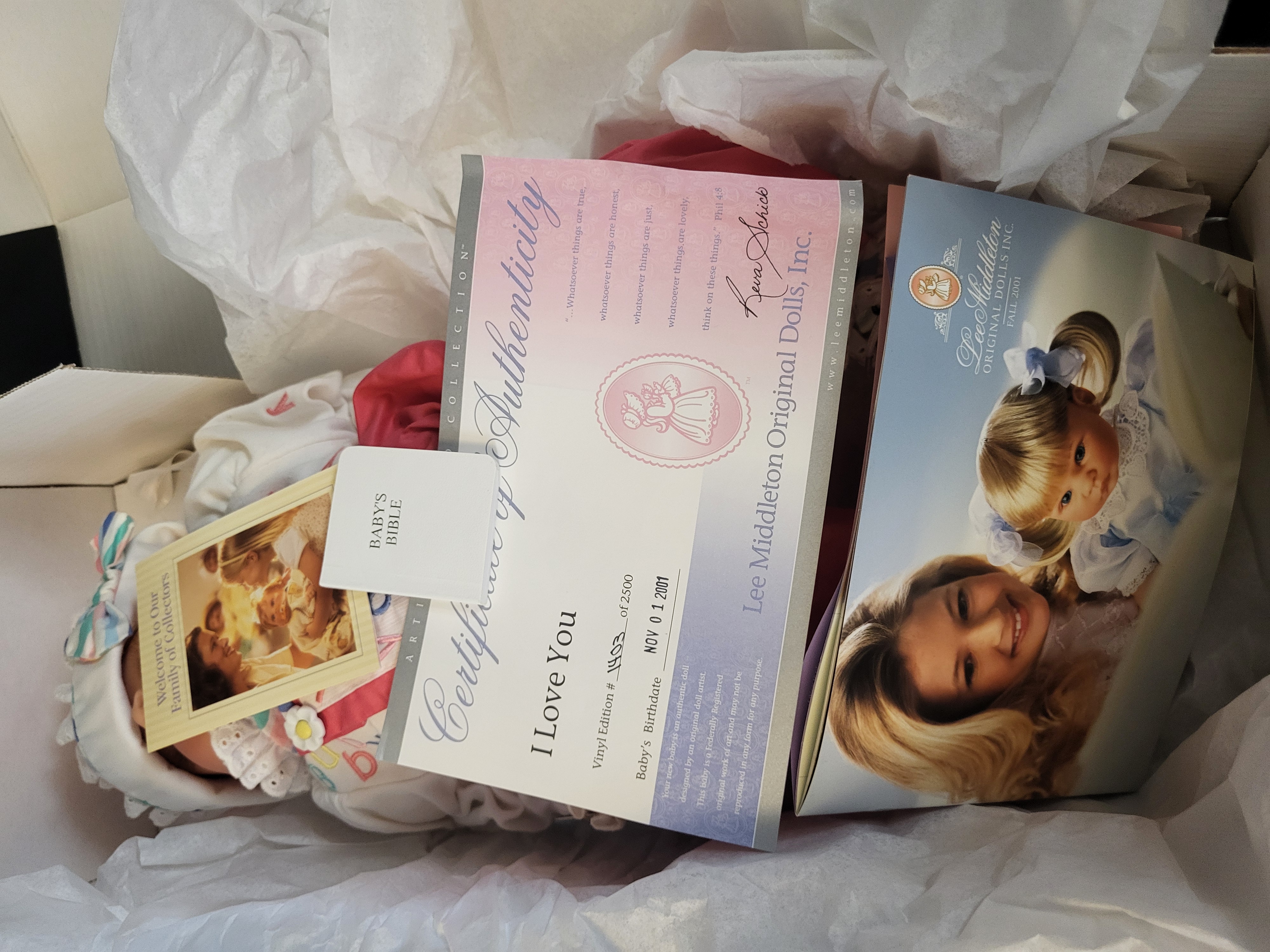 BID PER WHAT YOU SEE IN THE PHOTO, NOT THE AI GENERATED TITLES AND DESCRIPTIONS! This lot features a collectible vinyl baby doll from Lee Middleton Original Dolls, Inc., titled I Love You (Model 00479) from the Artist Studio Collection. Designed by artist Reva Schick, the infant doll is constructed with vinyl limbs and a soft fabric body. The doll is dressed in a pink and white embroidered I Love You bibbed outfit with a matching bonnet and white lacy shoes. The item is housed in its original retail box and includes a Certificate of Authenticity identifying it as edition number 1403 of 2500 with a recorded birthdate of November 1, 2001. Additional included materials consist of a miniature Baby’s Bible and a Fall 2001 promotional catalog.