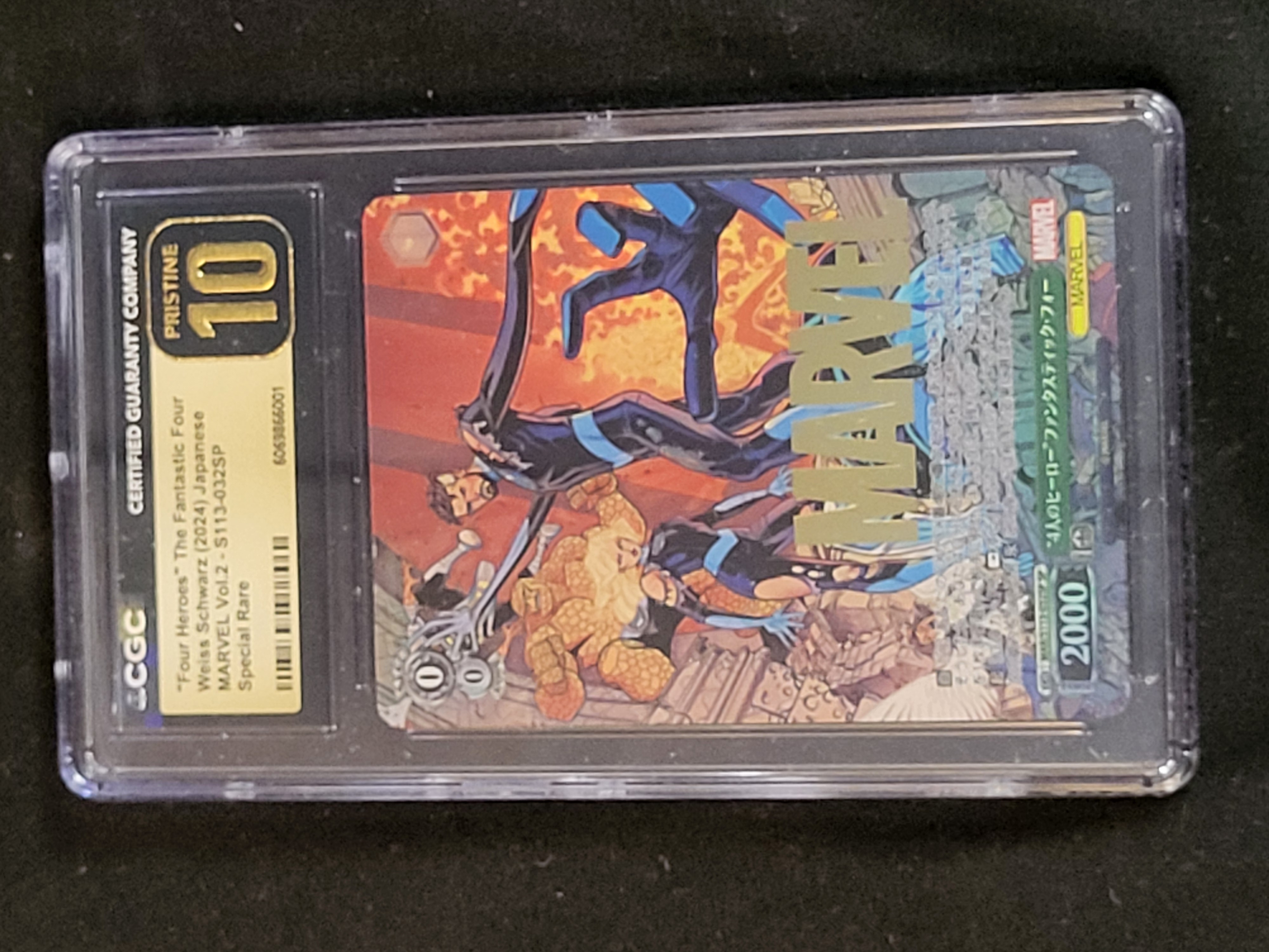 BID PER WHAT YOU SEE IN THE PHOTO, NOT THE AI GENERATED TITLES AND DESCRIPTIONS! A 2024 Weiss Schwarz Japanese Marvel Vol.2 trading card featuring the Fantastic Four, titled Four Heroes. This card is identified by the number S113-032SP and is designated as a Special Rare (SP) rarity. The front displays a full-art color illustration of the superhero team with gold-toned foil lettering. The reverse of the card features a large red Marvel logo set against a dark gray background with a repeating pattern of various hero insignias. The item is professionally encapsulated and graded by the Certified Guaranty Company (CGC).