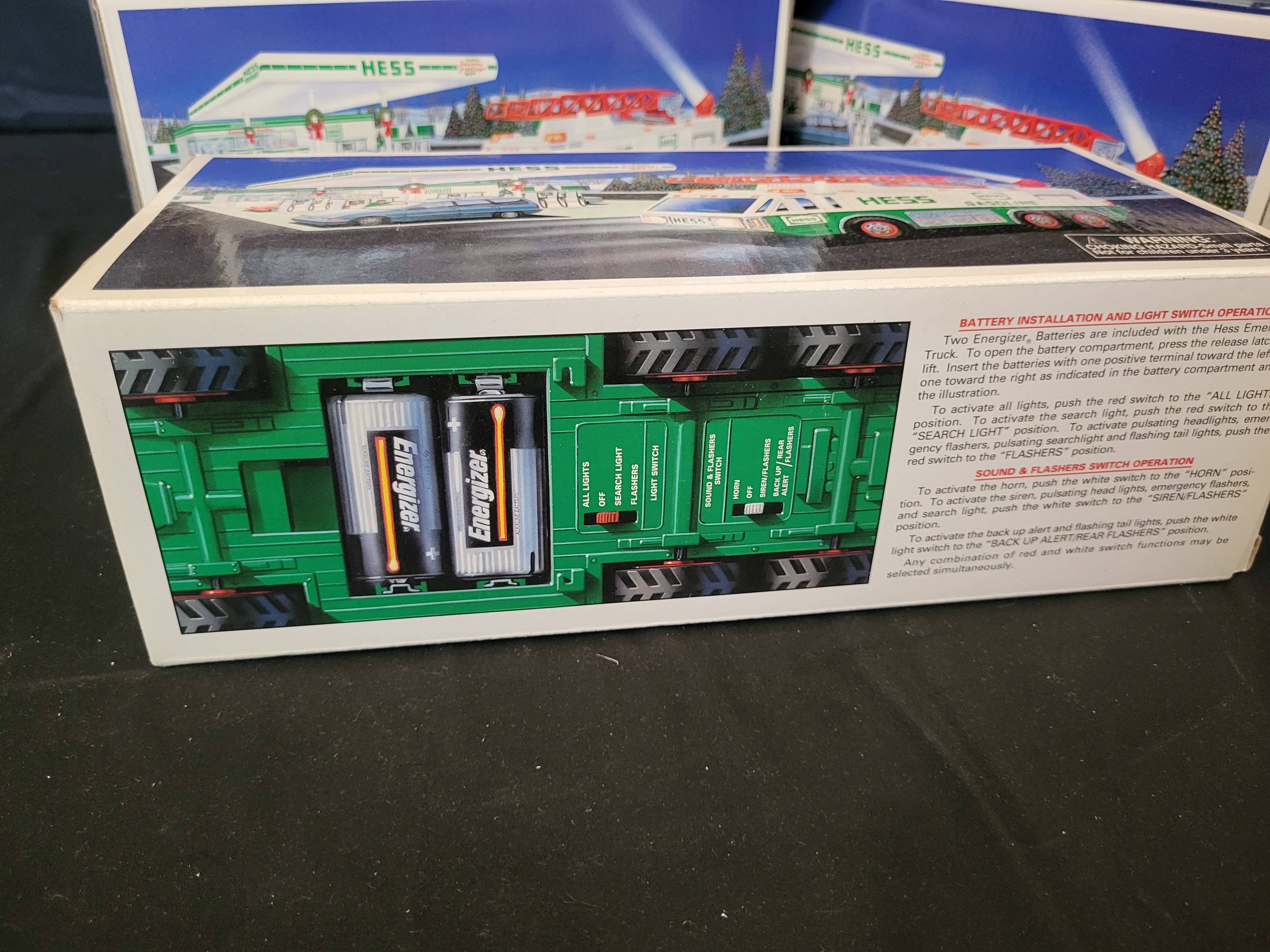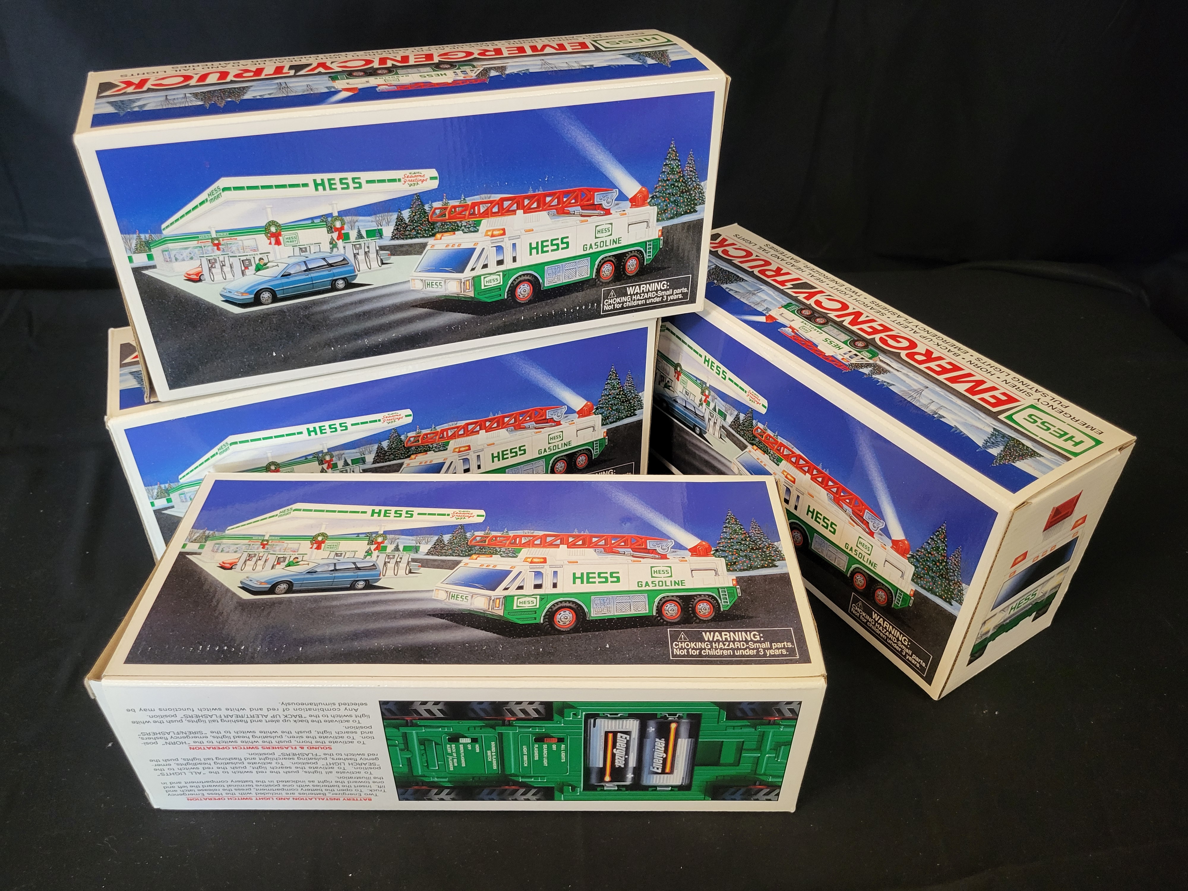 BID PER WHAT YOU SEE IN THE PHOTO, NOT THE AI GENERATED TITLES AND DESCRIPTIONS! A collection of Hess Emergency Truck collectible toy vehicles, manufactured in 1996. Each unit is contained within its original cardboard packaging, which displays colorful graphics of the vehicle in a winter setting at a Hess gasoline station. The vehicles are finished in a white, green, and red color palette. According to the packaging, these models feature multiple electronic functions including an emergency siren, horn, back-up alert, search light, and pulsating lights. The underside of the trucks includes specific switches for operating the light and sound components. The boxes also note the inclusion of two Energizer batteries and provide detailed operating instructions.