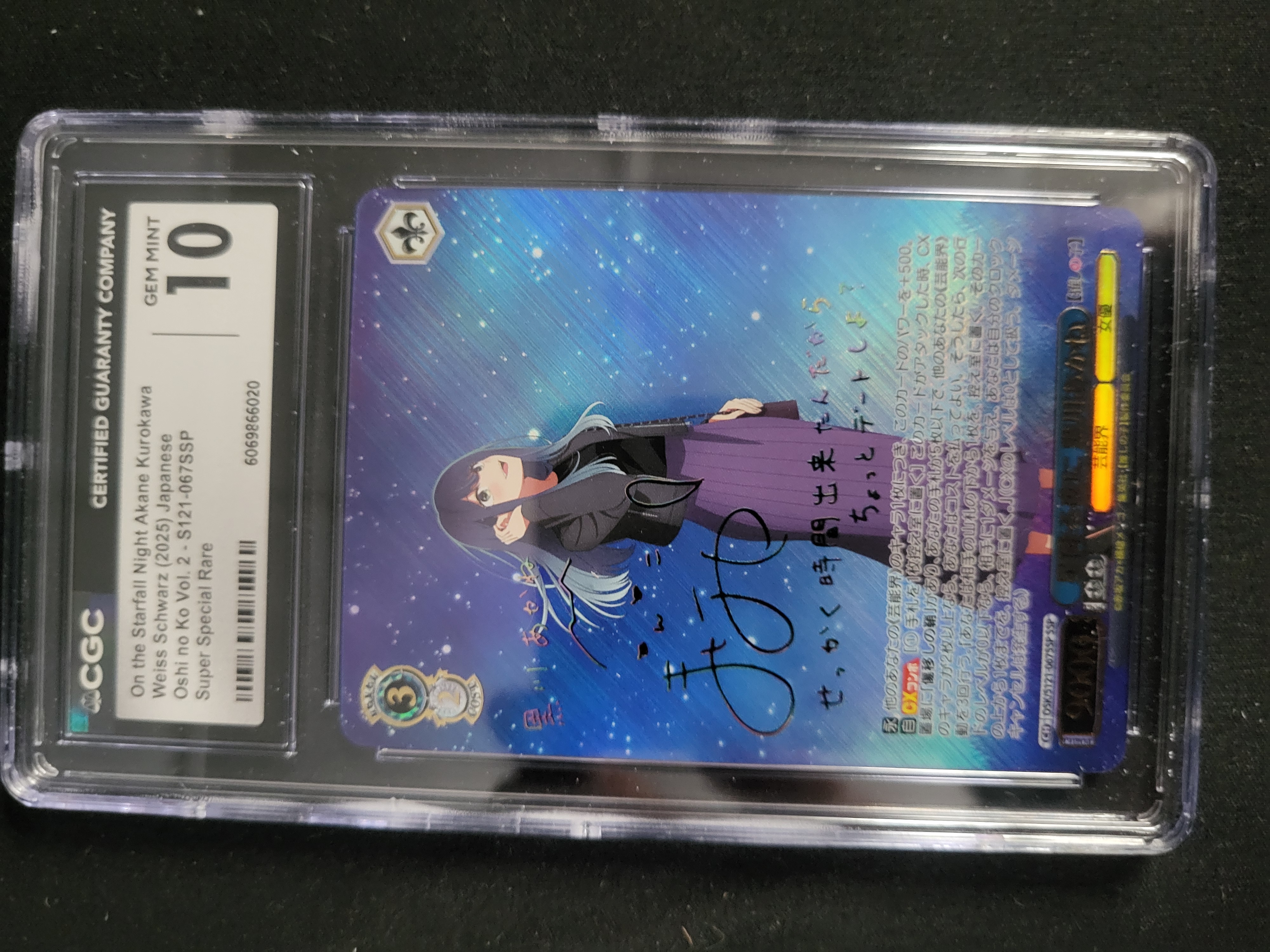 BID PER WHAT YOU SEE IN THE PHOTO, NOT THE AI GENERATED TITLES AND DESCRIPTIONS! A professionally graded Japanese Weiss Schwarz trading card featuring the character Akane Kurokawa from the Oshi no Ko Vol. 2 collection. This Super Special Rare (SSP) card, designated S121-067SSP, is constructed with a textured foil finish and a full-bleed illustration depicting the character against a starry night background. The card includes a facsimile character signature. The reverse side displays the standard Weiss Schwarz branding and copyright information for Bushiroad. The item is authenticated and graded Gem Mint 10 by the Certified Guaranty Company (CGC), identified by serial number 6069866020. It is housed in a clear, tamper-evident protective holder.