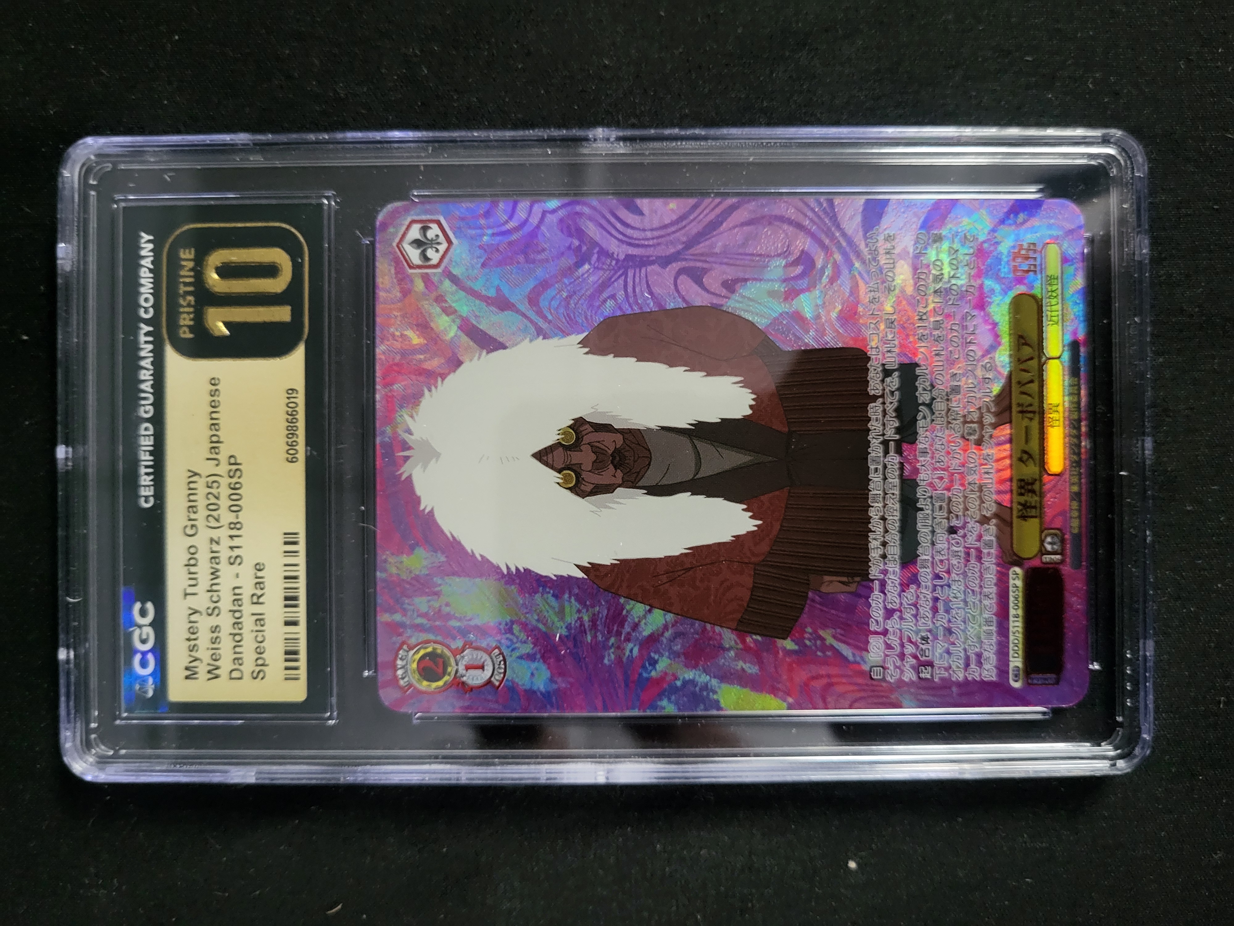 BID PER WHAT YOU SEE IN THE PHOTO, NOT THE AI GENERATED TITLES AND DESCRIPTIONS! A Japanese Weiss Schwarz trading card from the Dandadan series featuring the character Strange Entity, Turbo Granny. This card is a Special Rare (SP) edition, identified as card number S118-006SP. The card features a holographic foil finish and stylized character artwork. It is dated 2025 and is housed in a clear, sonically sealed plastic protective slab from the Certified Guaranty Company (CGC). The CGC label identifies the character as Mystery Turbo Granny and displays the certificate number 6069866019.