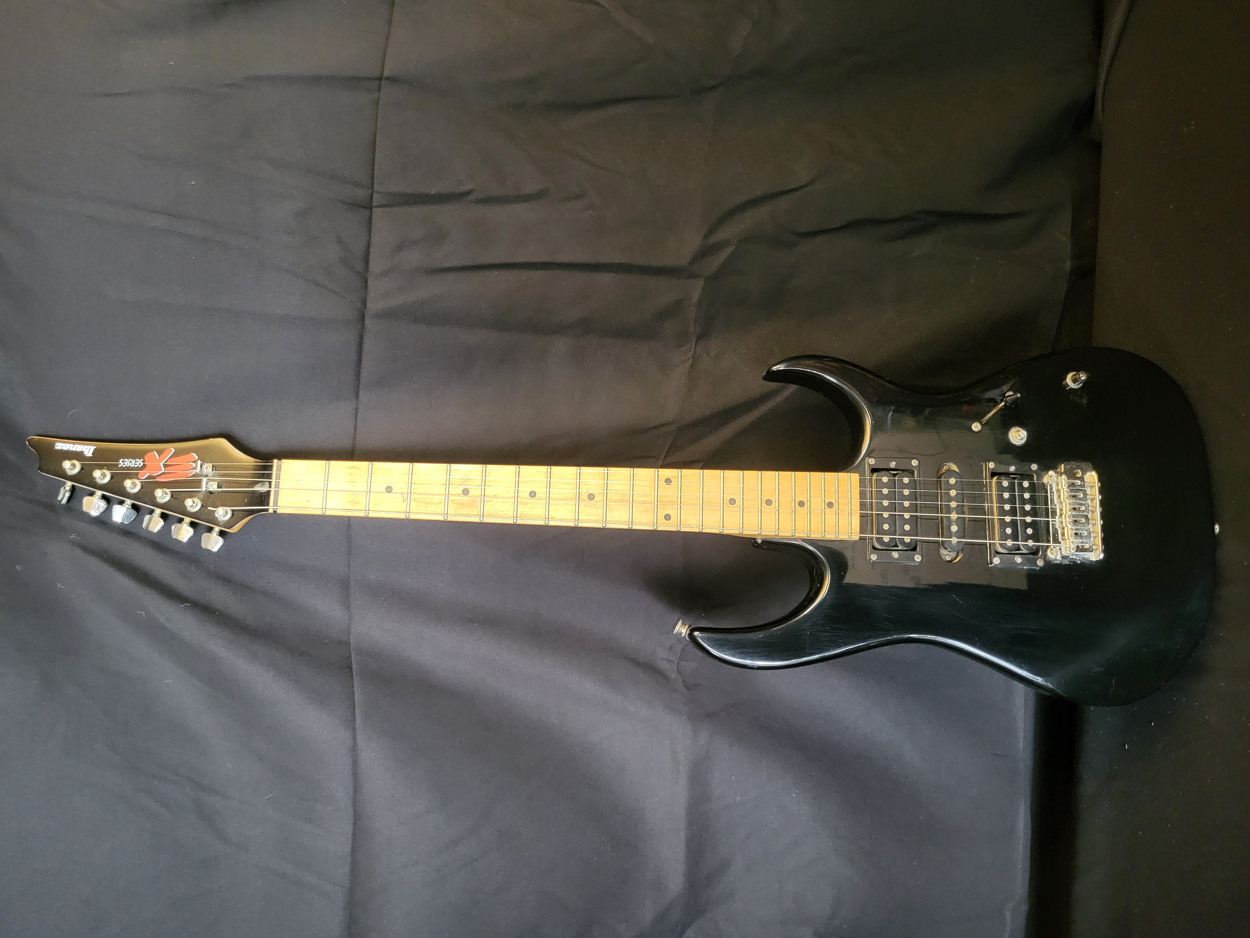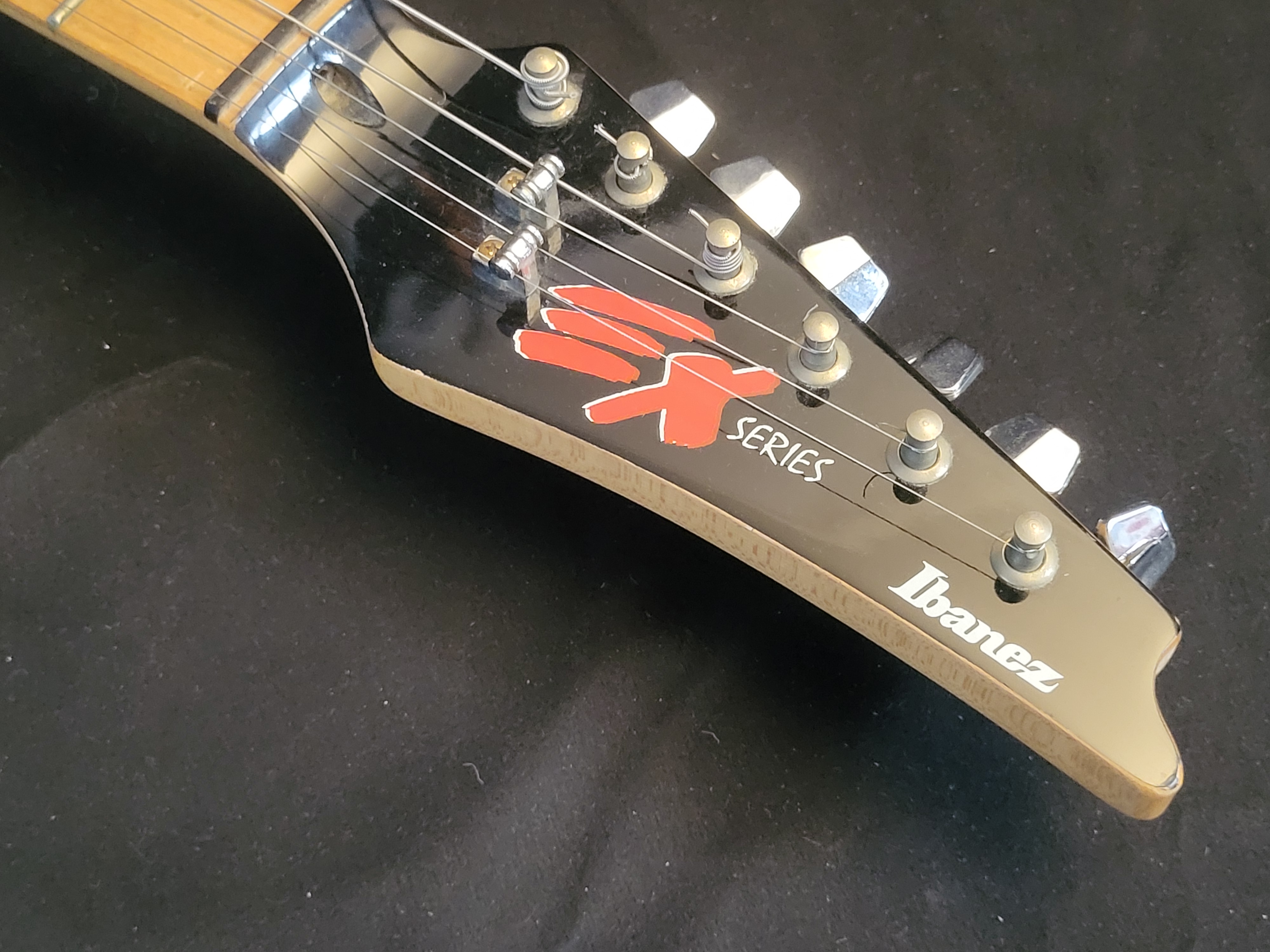 BID PER WHAT YOU SEE IN THE PHOTO, NOT THE AI GENERATED TITLES AND DESCRIPTIONS! An Ibanez EX Series electric guitar featuring a solid double-cutaway body in a gloss black finish. The instrument is constructed with a maple neck and a maple fretboard featuring dot position inlays. The electronics consist of a humbucker-single-humbucker (HSH) pickup configuration, a five-way selector switch, and two control pots. The pointed headstock displays the Ibanez logo and EX Series branding. The reverse features a chrome neck plate stamped with the Ibanez logo, serial number 9206613, and MADE IN KOREA.