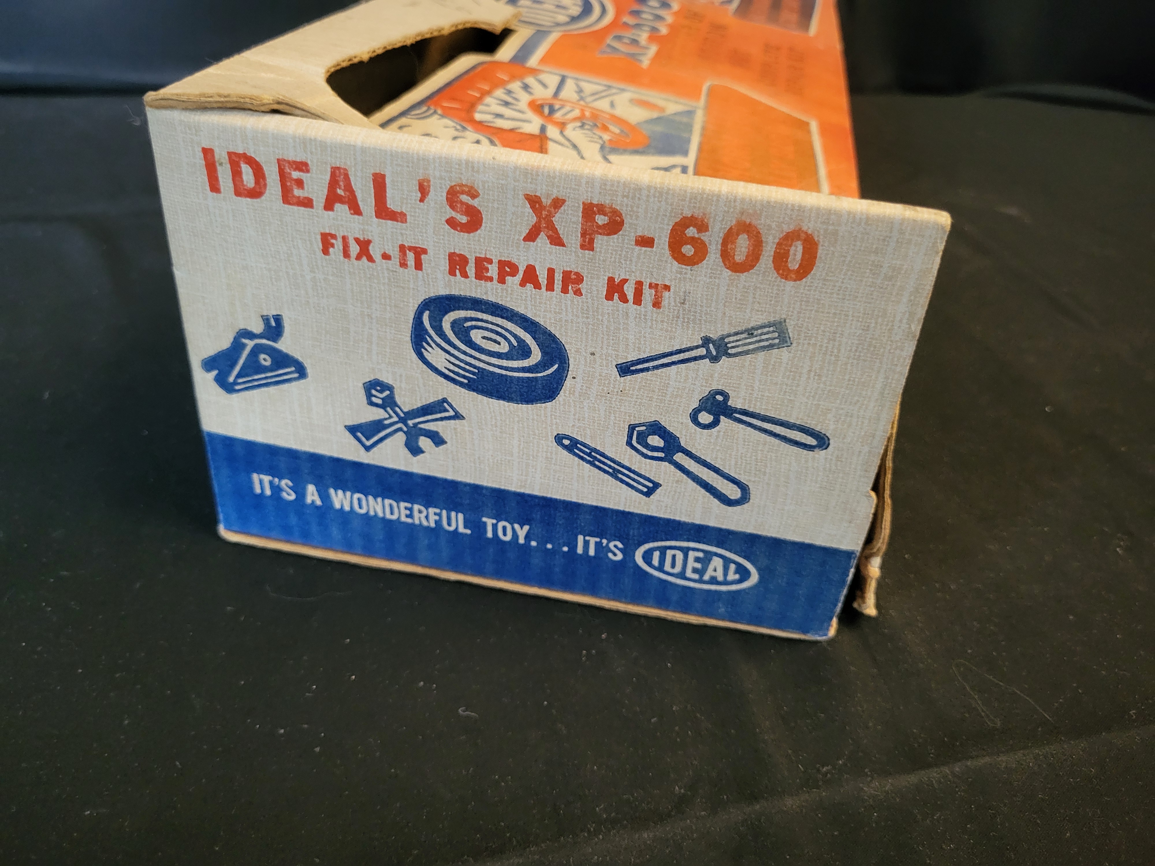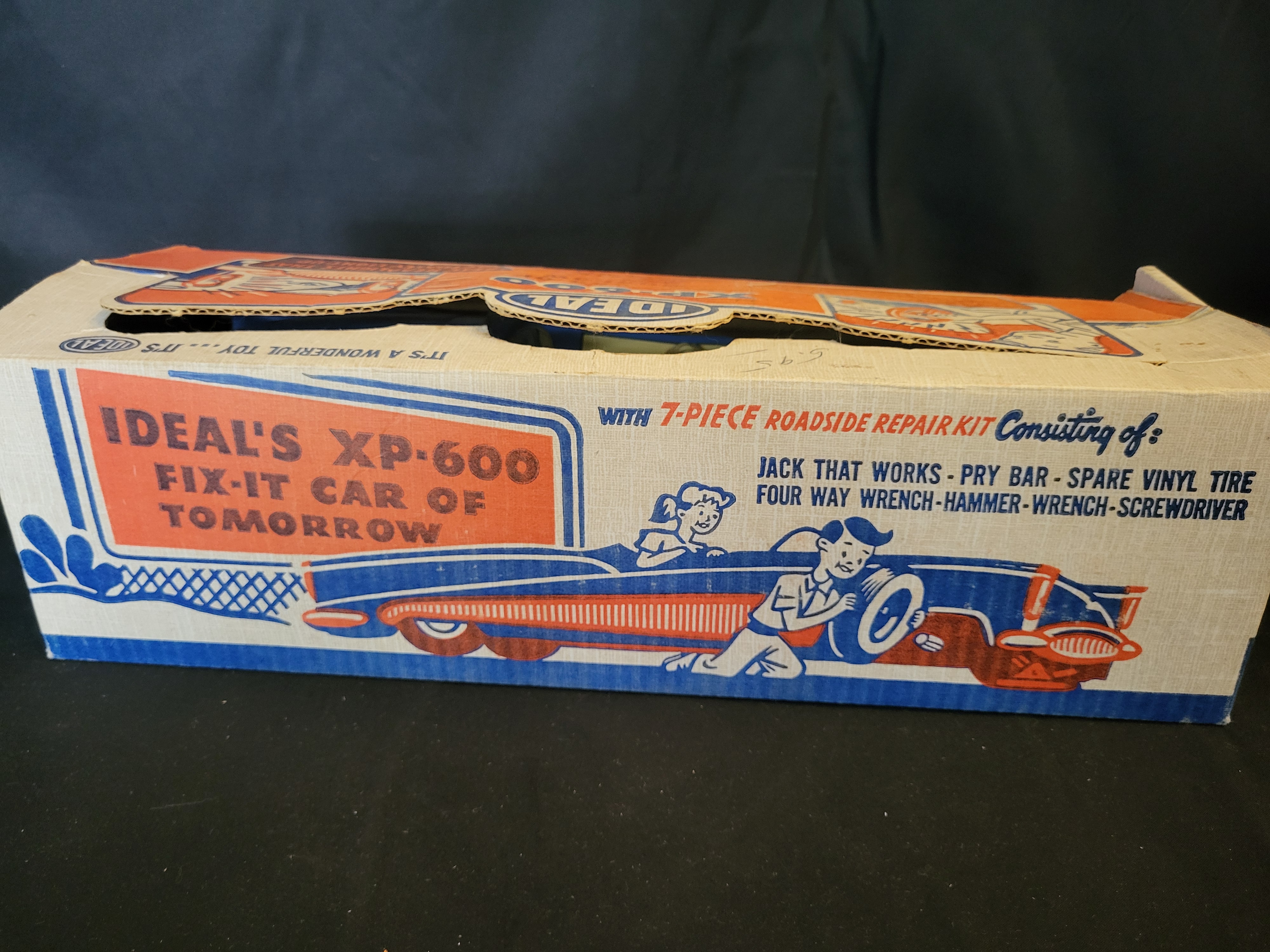 BID PER WHAT YOU SEE IN THE PHOTO, NOT THE AI GENERATED TITLES AND DESCRIPTIONS! An Ideal Toy Company XP-600 Fix-It Car of Tomorrow vintage toy set. The vehicle is constructed of blue molded plastic with a yellow interior and chrome-tone accents. This mid-century convertible features a functional horn and headlights as indicated by the original packaging. The item is housed in its original illustrated cardboard box, which identifies a seven-piece roadside repair kit including a jack, pry bar, spare vinyl tire, four-way wrench, hammer, wrench, and screwdriver. The box carries the manufacturer mark for the Creative Packaging Division of Atlantic Container Corp., Long Island City. Visible markings include the Ideal logo on both the vehicle and the packaging.