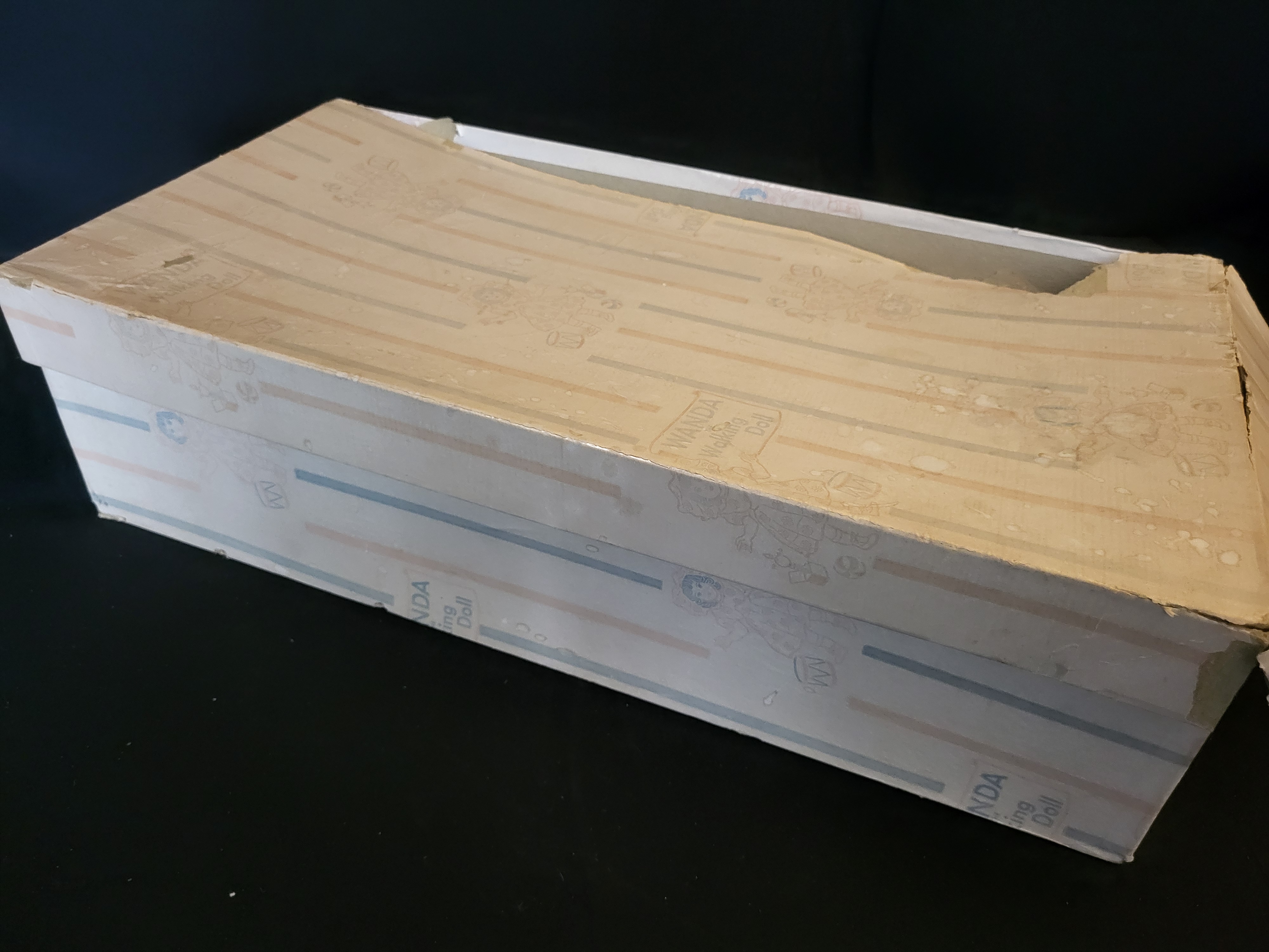 The doll is in generally good condition with minor surface wear to the nose. The original cardboard box shows significant age-related wear, including prominent water staining, fading, and structural damage to the lid.
