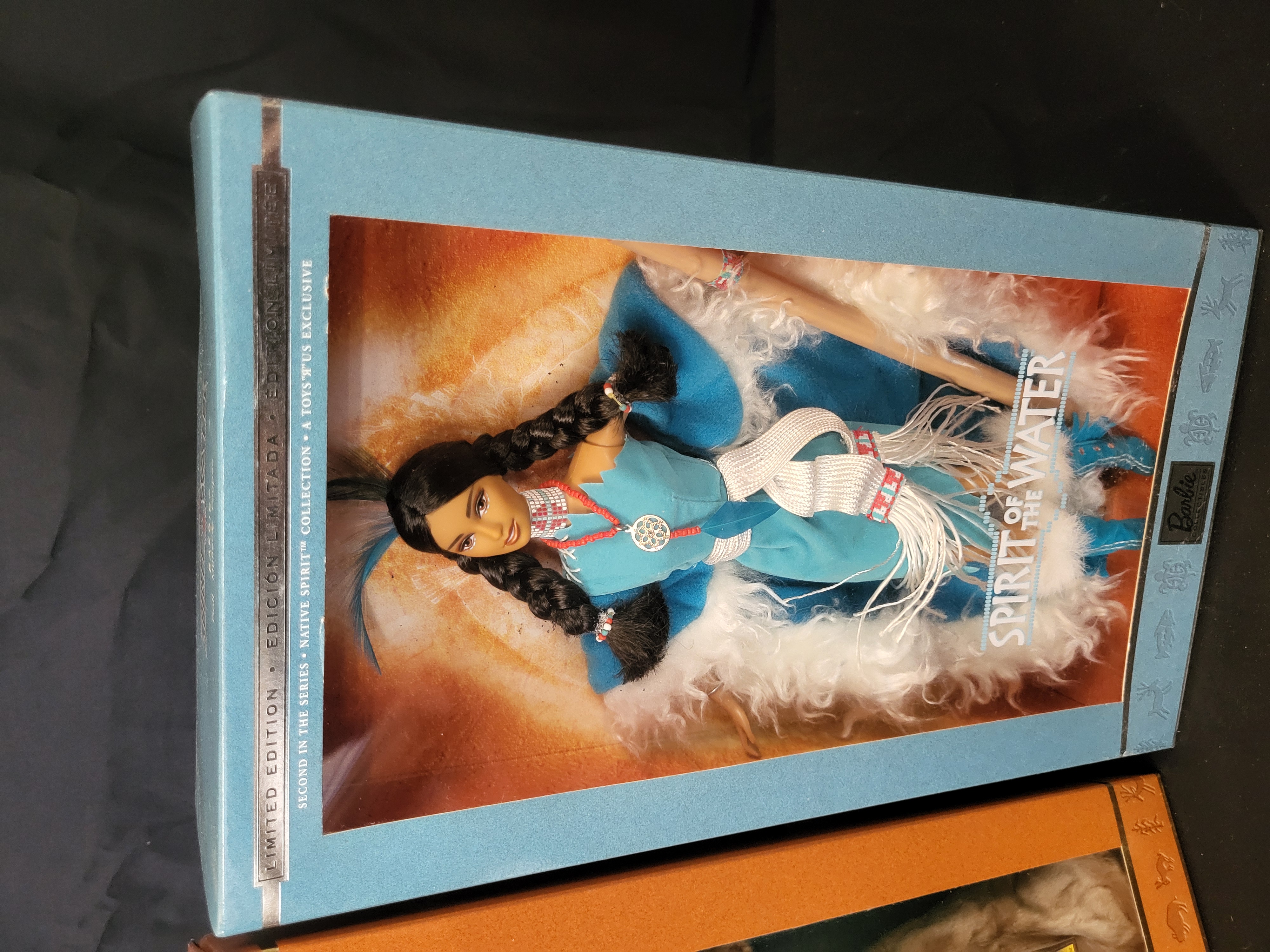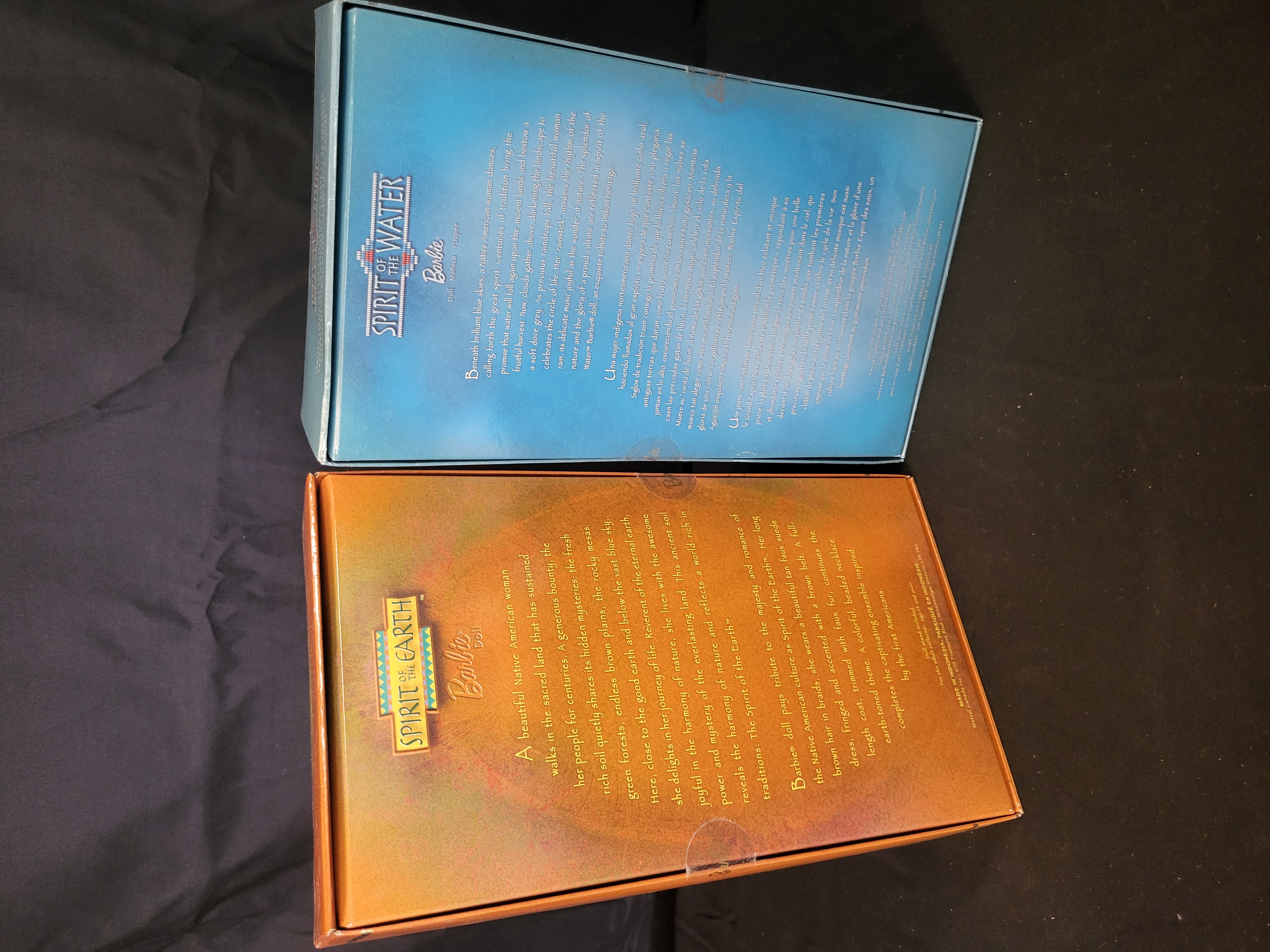 BID PER WHAT YOU SEE IN THE PHOTO, NOT THE AI GENERATED TITLES AND DESCRIPTIONS! This pair of limited edition Barbie dolls from the Native Spirit Collection was produced by Mattel as Toys”R”Us exclusives. The group includes Spirit of the Earth (2001), designated as the first in the series, and Spirit of the Water (2002), the second in the series. The Spirit of the Earth doll is dressed in a tan faux suede dress and a full-length coat featuring white faux fur trim and beaded accents. The Spirit of the Water doll wears a turquoise dress with a fringed white shawl, a beaded necklace, and includes a rainstick accessory. Both dolls feature dark braided hair and are housed in their original color-coded window boxes, orange for Earth and blue for Water. The reverse of each box contains thematic descriptions in English, Spanish, and French.