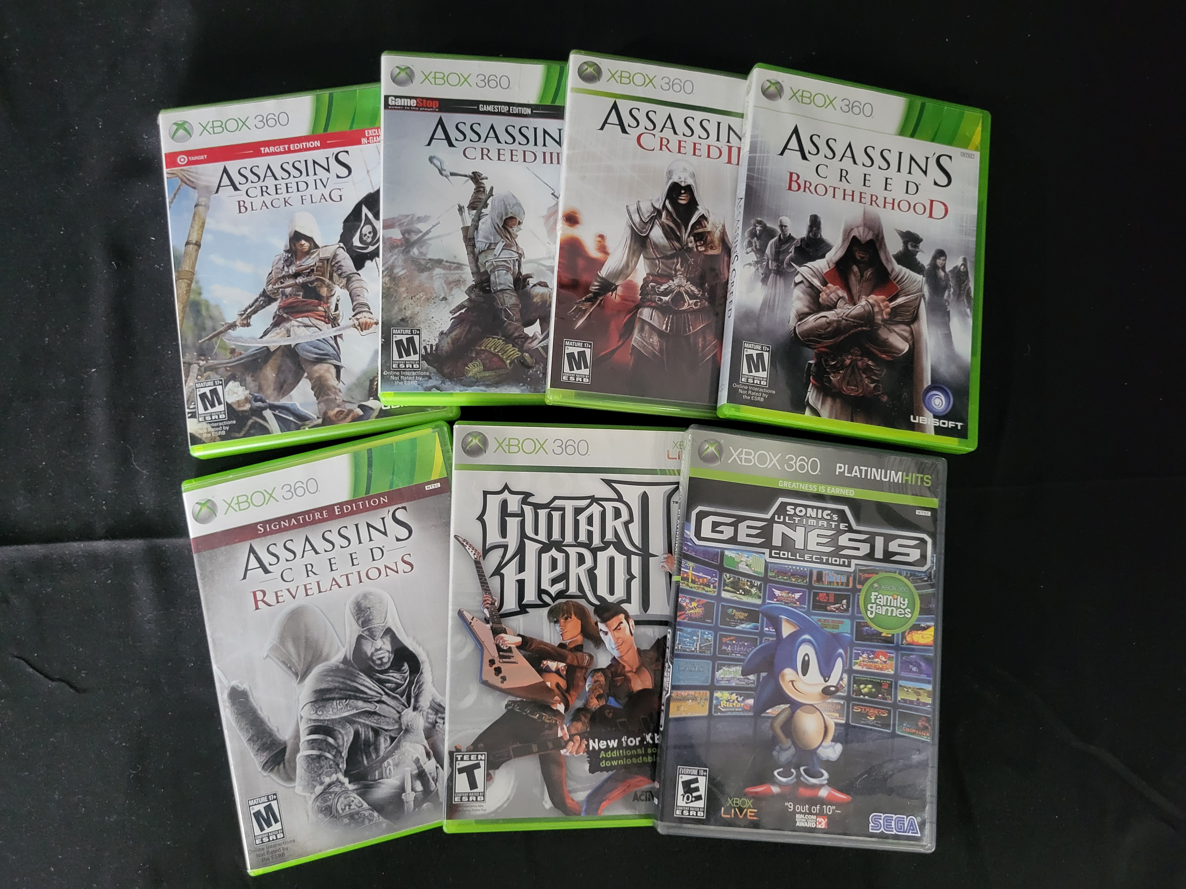 BID PER WHAT YOU SEE IN THE PHOTO, NOT THE AI GENERATED TITLES AND DESCRIPTIONS! A collection of video games for the Microsoft Xbox 360 console featuring several titles from the Assassin’s Creed franchise and other popular releases. The group includes Assassin’s Creed II, Assassin’s Creed III (GameStop Edition), Assassin’s Creed IV: Black Flag (Target Edition), Assassin’s Creed Brotherhood, and Assassin’s Creed Revelations (Signature Edition). Also present are Guitar Hero II (2007) and Sonic’s Ultimate Genesis Collection (Platinum Hits). Each game is housed in a standard green plastic case with original printed cover art. Visible markings include ESRB ratings ranging from Everyone 10+ to Mature, along with publisher branding for Ubisoft, Activision, and Sega.