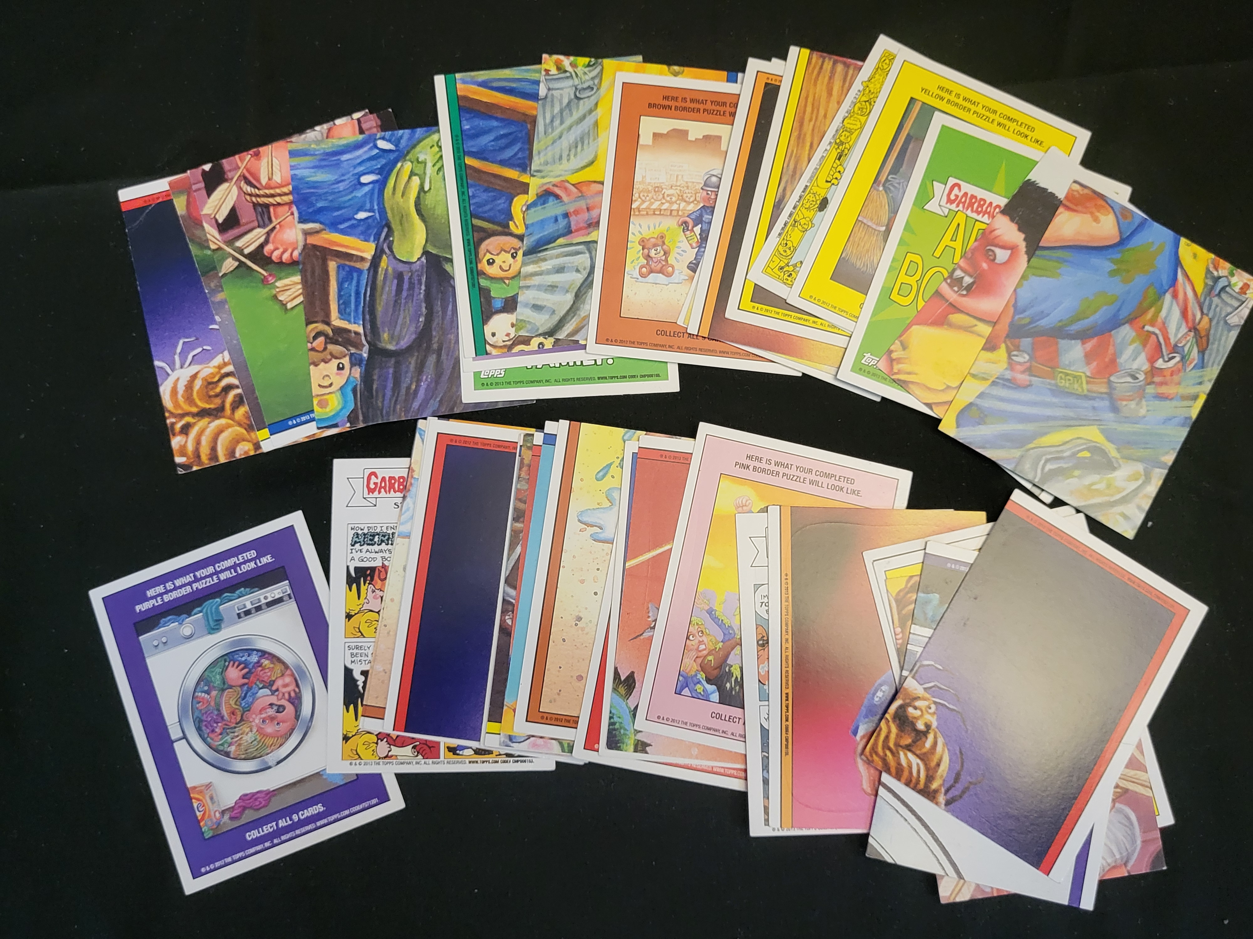 BID PER WHAT YOU SEE IN THE PHOTO, NOT THE AI GENERATED TITLES AND DESCRIPTIONS! A collection of Topps Garbage Pail Kids trading cards, featuring copyright markings from circa 2013. The cards are constructed from printed cardstock and depict various characters in the franchise’s signature illustrative style, including Sawing Sal and Ear Bud. The reverse sides of the cards display puzzle pieces and instructional text for completing specific sets, including the purple, brown, and pink border puzzles.