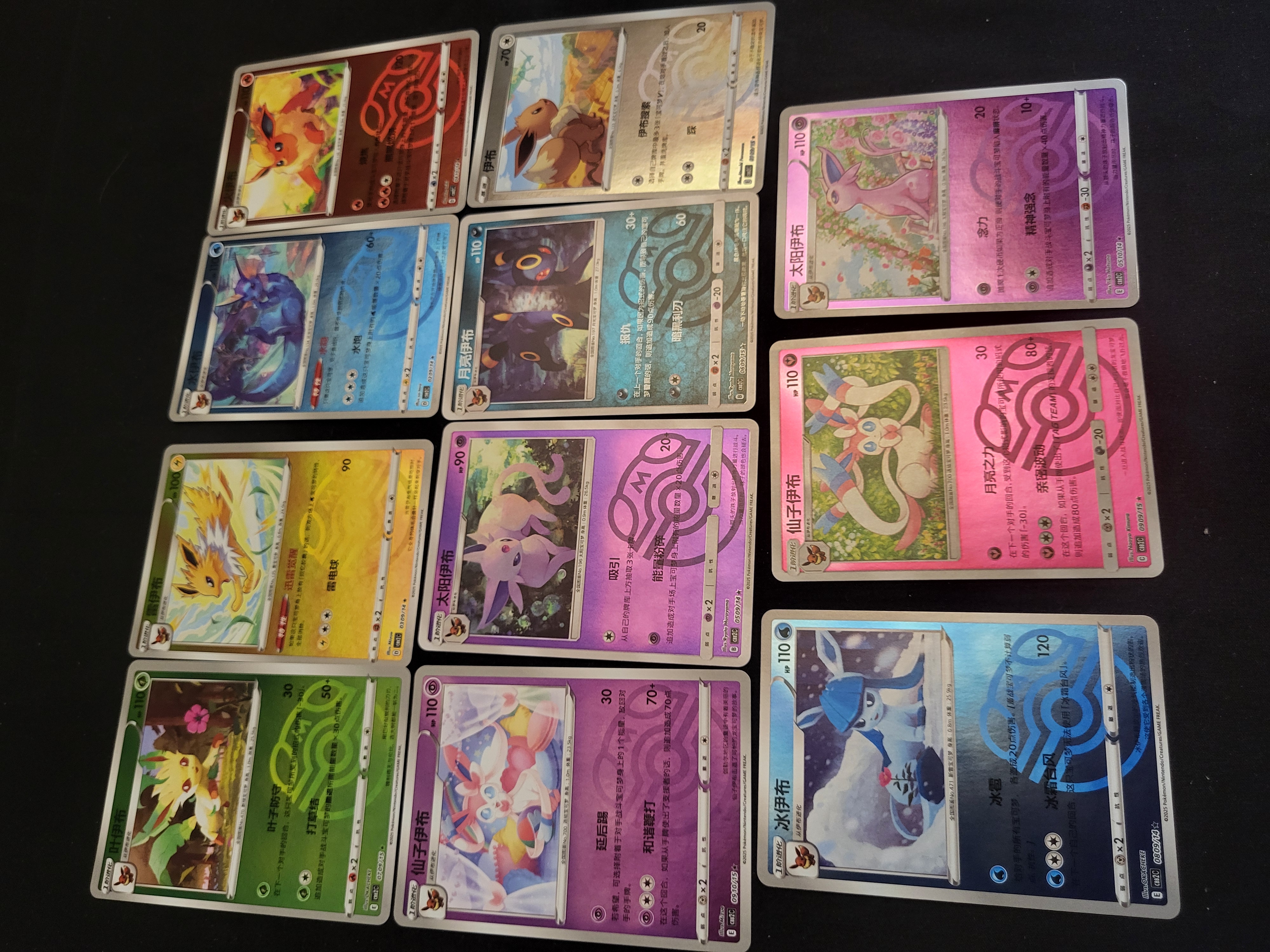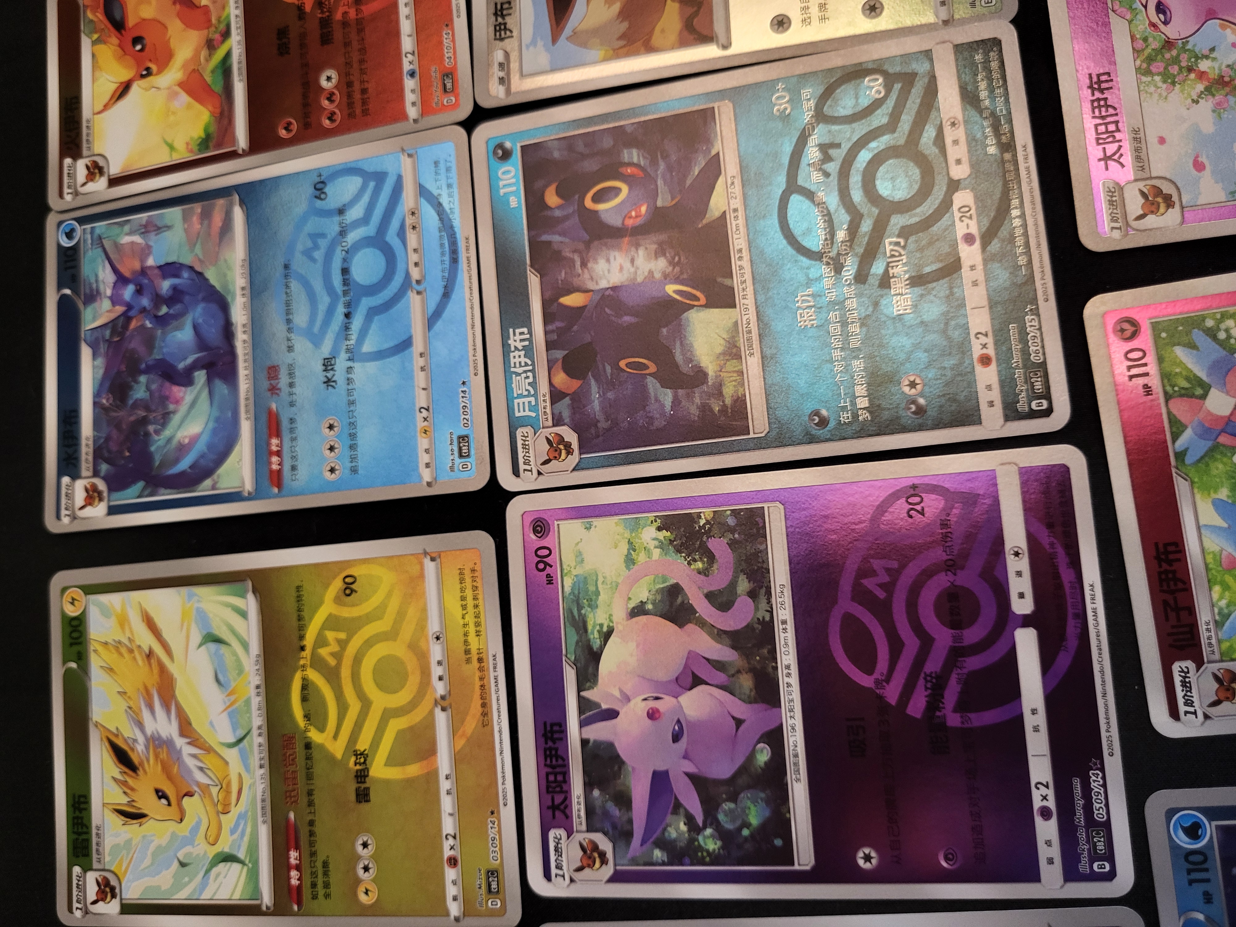 BID PER WHAT YOU SEE IN THE PHOTO, NOT THE AI GENERATED TITLES AND DESCRIPTIONS! A collection of Pokemon Trading Card Game cards from the Simplified Chinese Gem Pack Vol. 2 Eevee series. The cards feature the character Eevee alongside its various evolutionary forms, including Jolteon, Vaporeon, Flareon, Sylveon, Espeon, Umbreon, Leafeon, and Glaceon. Each card is finished with a holographic mirror foil displaying the Master Ball pattern. The cards contain standard gameplay text in Simplified Chinese and bear the set identification code CS2C. The items are printed on standard cardstock with a high-gloss holographic finish.