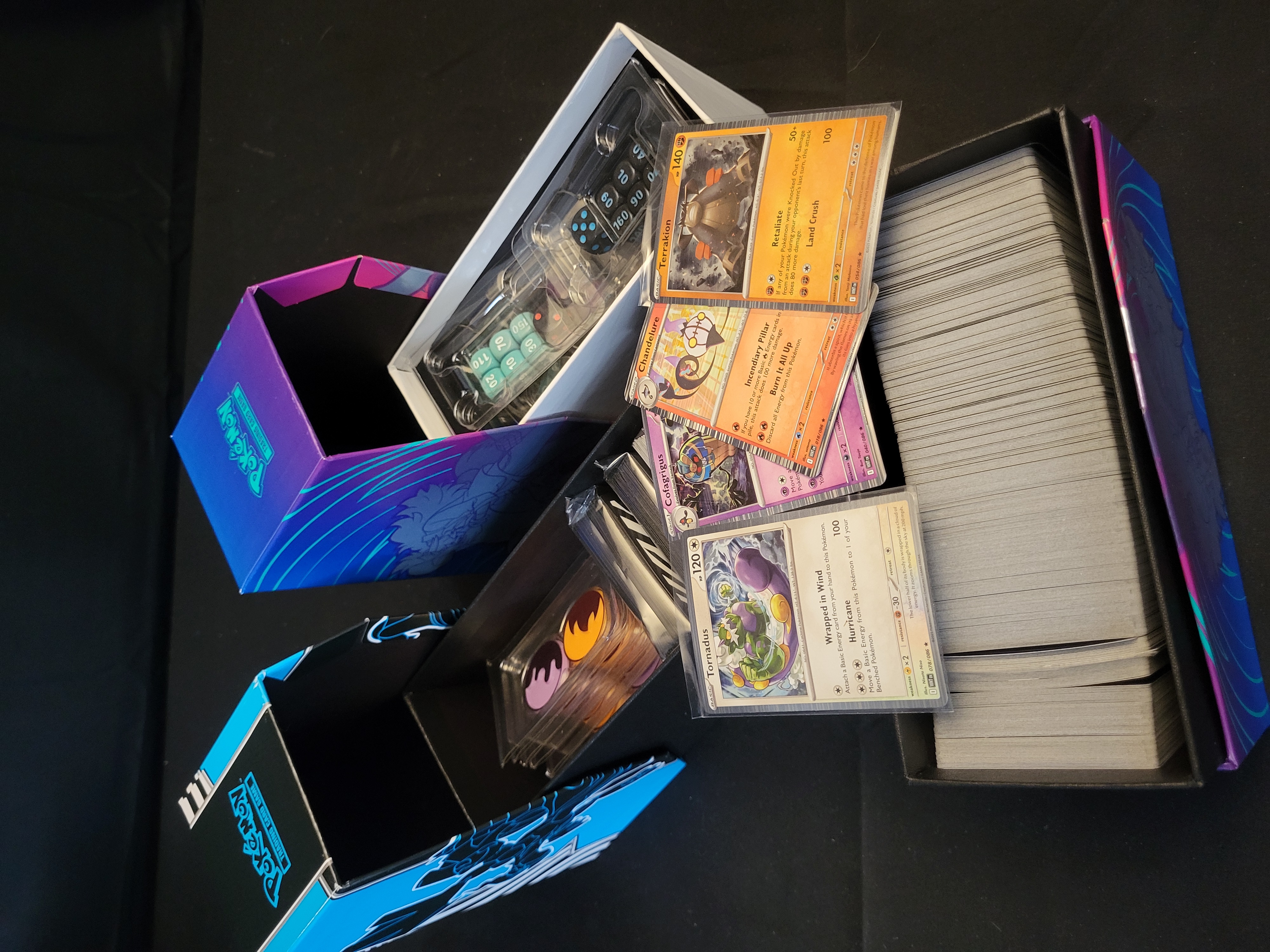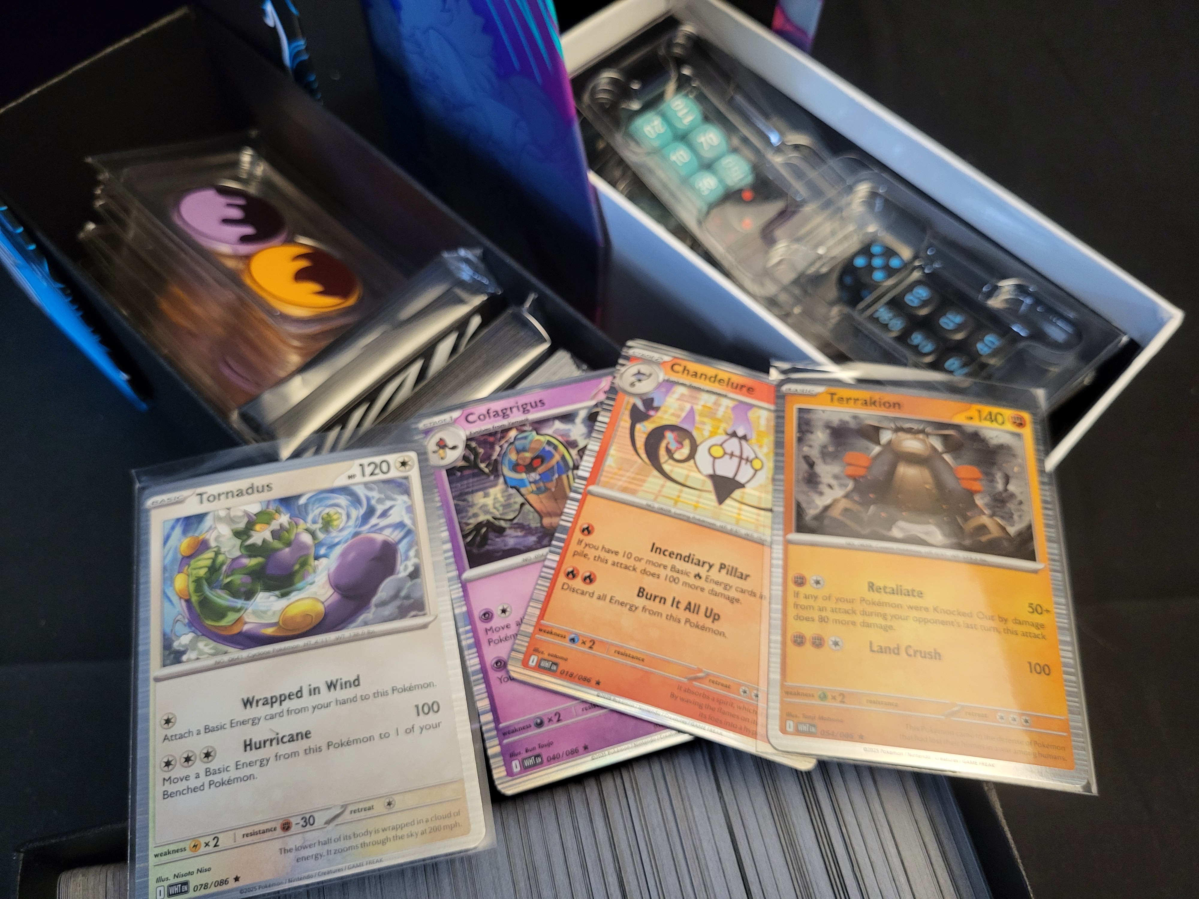 BID PER WHAT YOU SEE IN THE PHOTO, NOT THE AI GENERATED TITLES AND DESCRIPTIONS! This collection features items identified as the Pokémon TCG Mega Evolution-Phantasmal Flames series, including multiple Elite Trainer Boxes and an assortment of trading cards. The group contains several cards from the Scarlet & Violet—Stellar Crown expansion, notably Tornadus (078/086), Cofagrigus (040/086), Chandelure (018/086), and Terrakion (054/086), which are preserved in individual protective sleeves. Also included is a large quantity of unsleeved cards housed within a themed storage box. The lot is accompanied by various game accessories, including teal and black plastic damage counter dice, condition markers, and acrylic tokens, many of which remain in their original plastic packaging. The storage boxes are constructed of decorated cardboard featuring character illustrations and official branding.