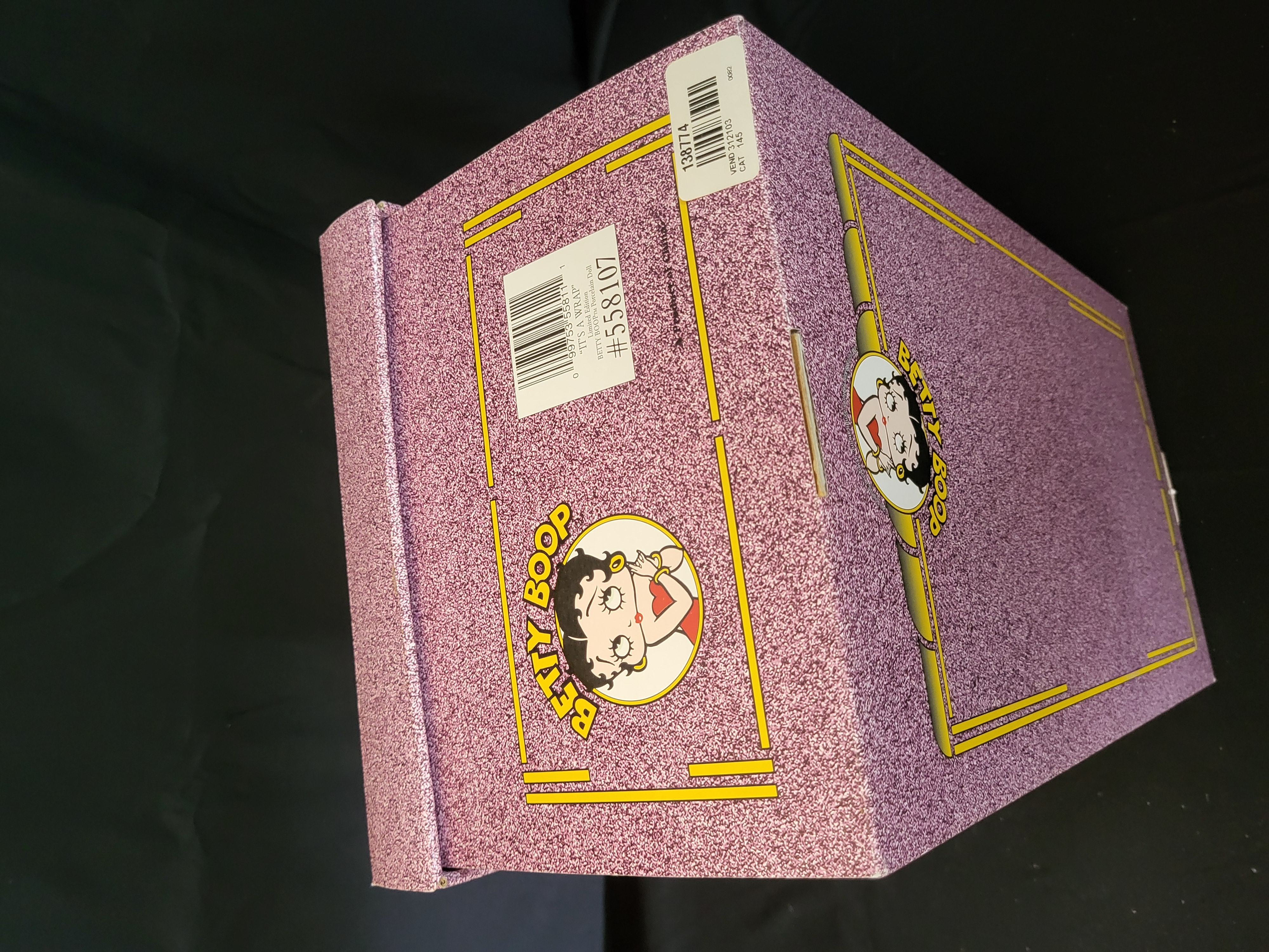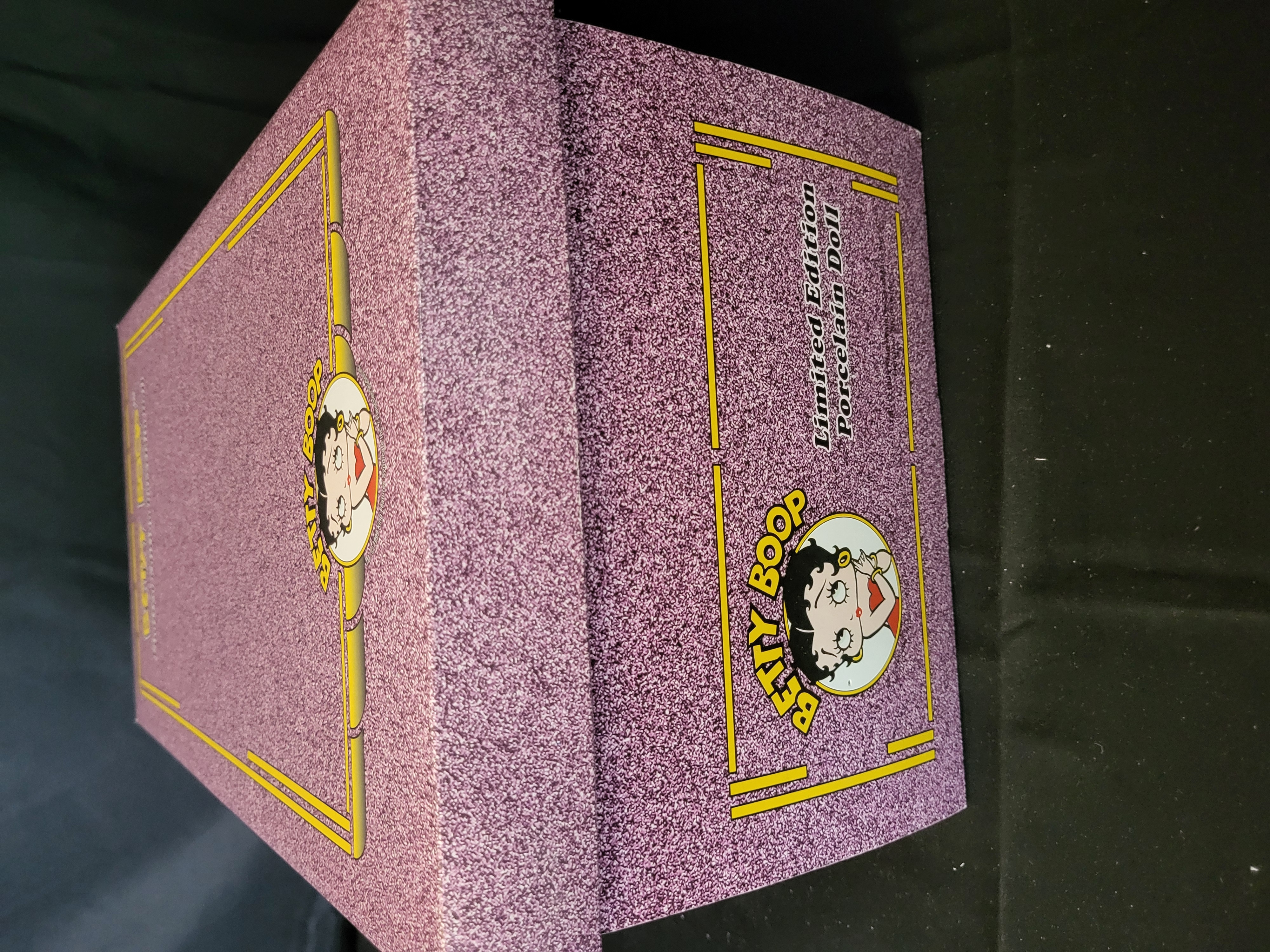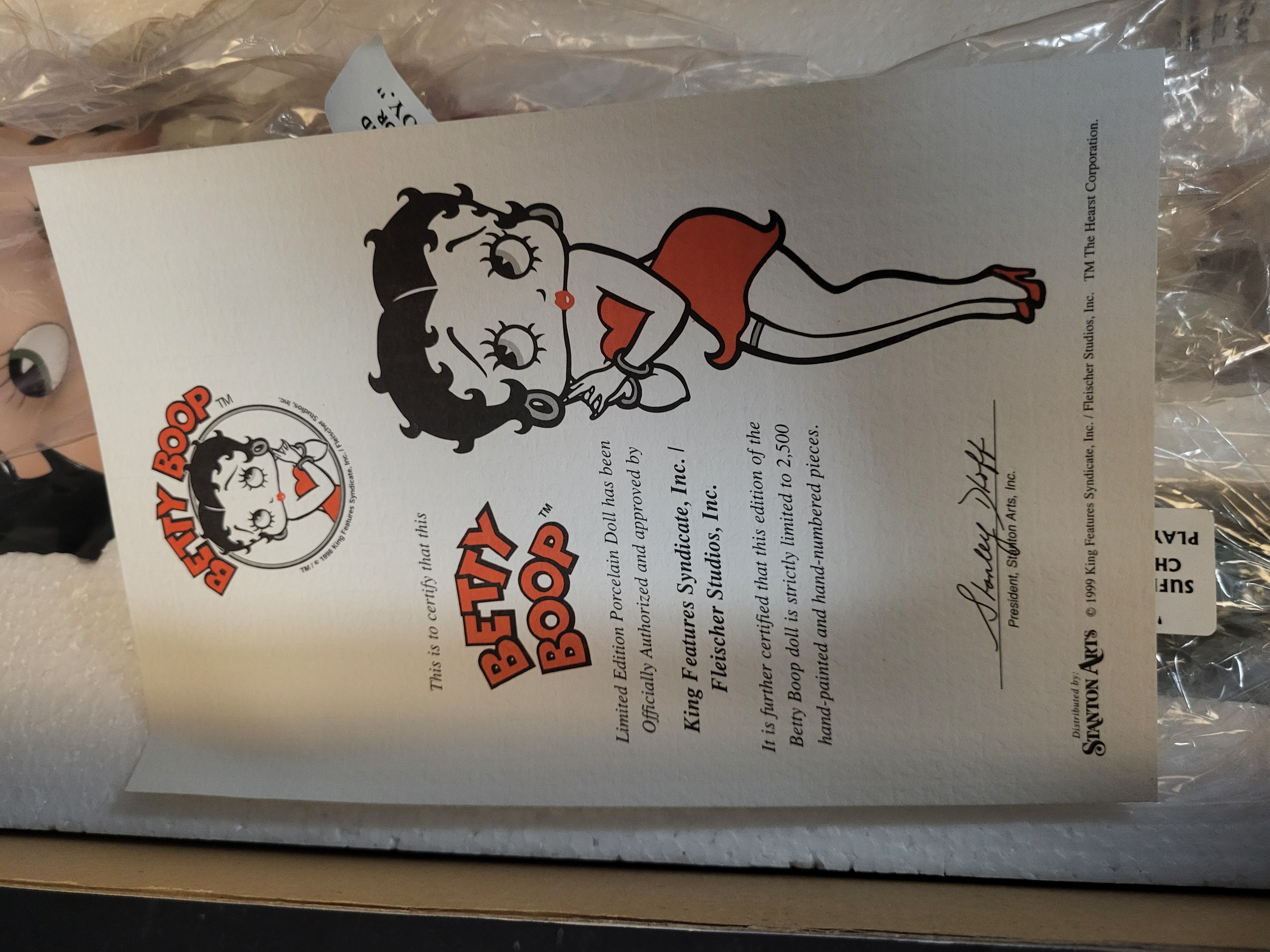 BID PER WHAT YOU SEE IN THE PHOTO, NOT THE AI GENERATED TITLES AND DESCRIPTIONS! A limited edition hand-painted porcelain doll titled It’s a Wrap, featuring the character Betty Boop. Distributed by Stanton Arts and officially authorized by King Features Syndicate and Fleischer Studios, the figure carries a 1999 copyright. This piece is part of a limited edition of 2,500. The doll is housed in its original decorative box with a purple glitter finish and custom-molded styrofoam inserts. The lot includes the original certificate of authenticity and a doll stand. The doll and stand are contained within their original protective plastic wrappings. The box exterior displays inventory stickers and barcodes, including reference number 558107.