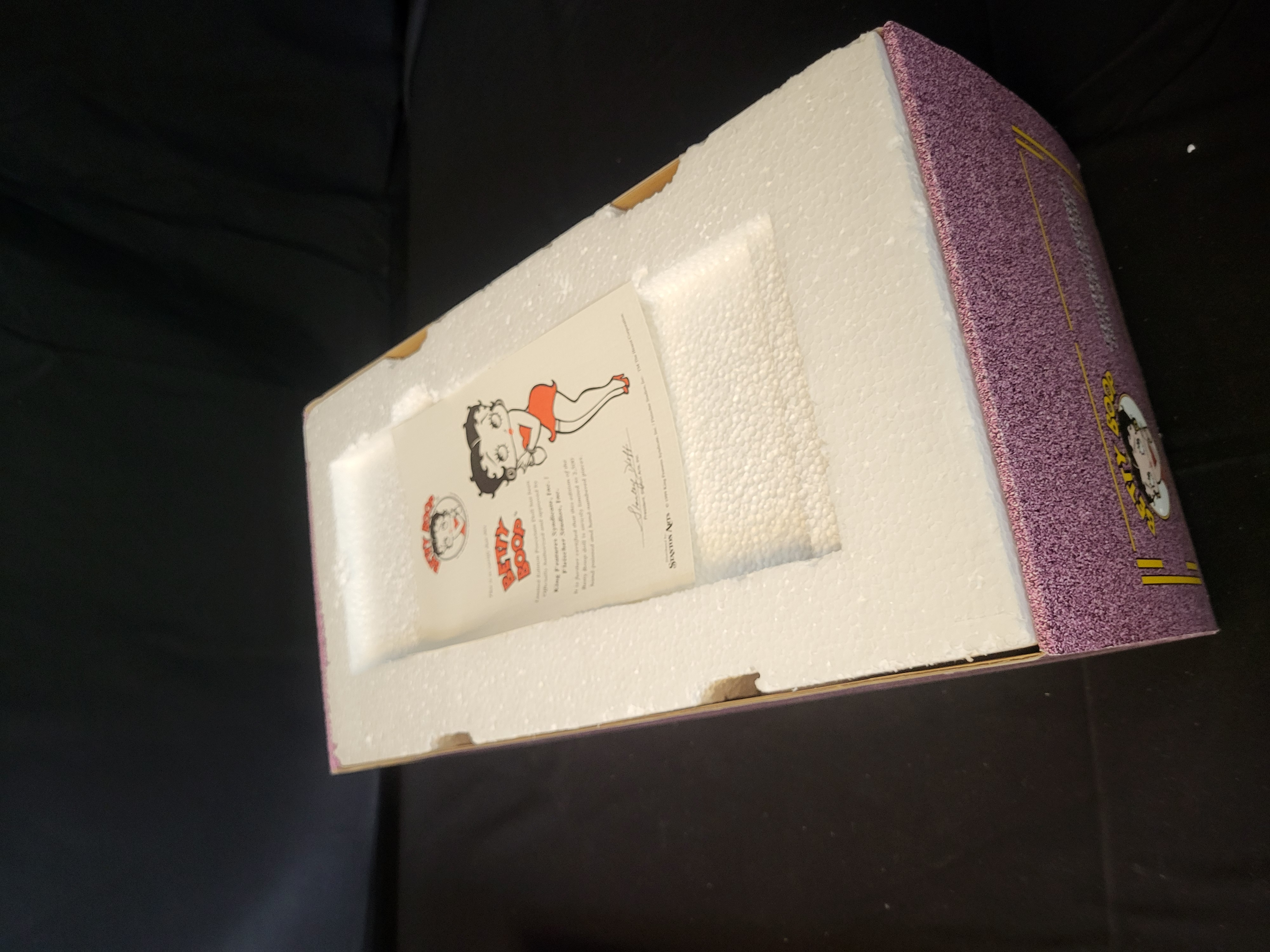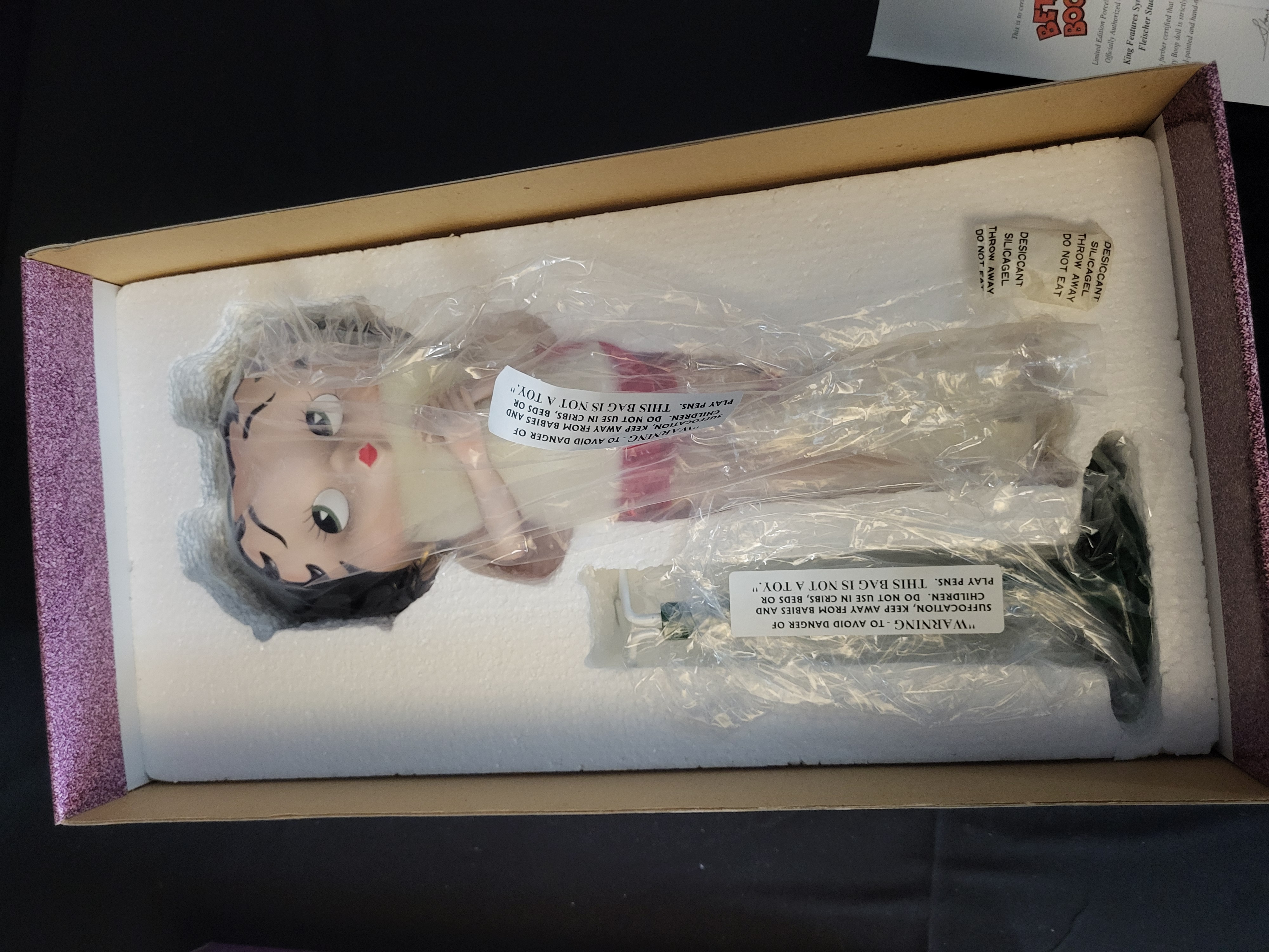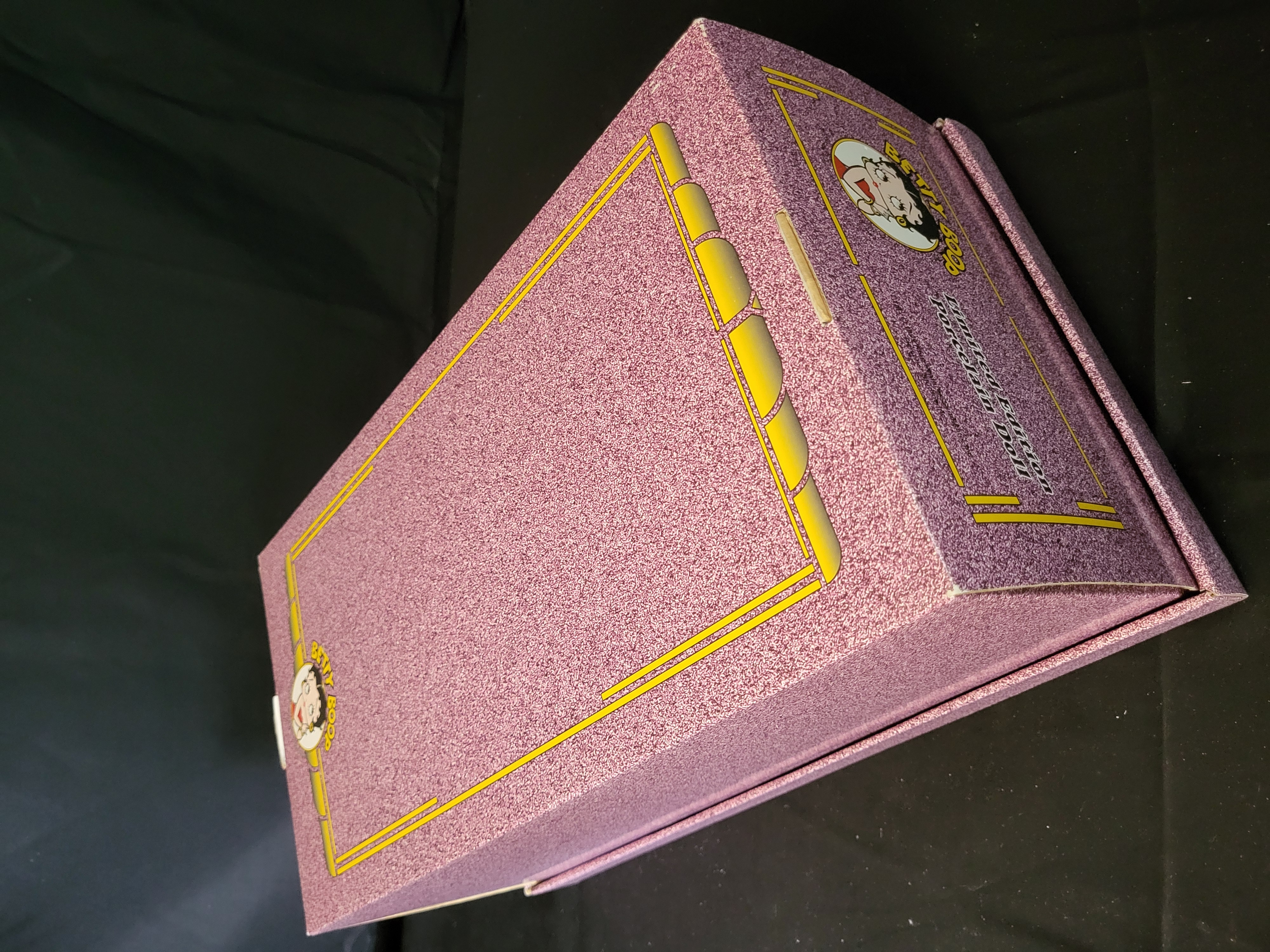 BID PER WHAT YOU SEE IN THE PHOTO, NOT THE AI GENERATED TITLES AND DESCRIPTIONS! A limited edition hand-painted porcelain doll titled It’s a Wrap, featuring the character Betty Boop. Distributed by Stanton Arts and officially authorized by King Features Syndicate and Fleischer Studios, the figure carries a 1999 copyright. This piece is part of a limited edition of 2,500. The doll is housed in its original decorative box with a purple glitter finish and custom-molded styrofoam inserts. The lot includes the original certificate of authenticity and a doll stand. The doll and stand are contained within their original protective plastic wrappings. The box exterior displays inventory stickers and barcodes, including reference number 558107.