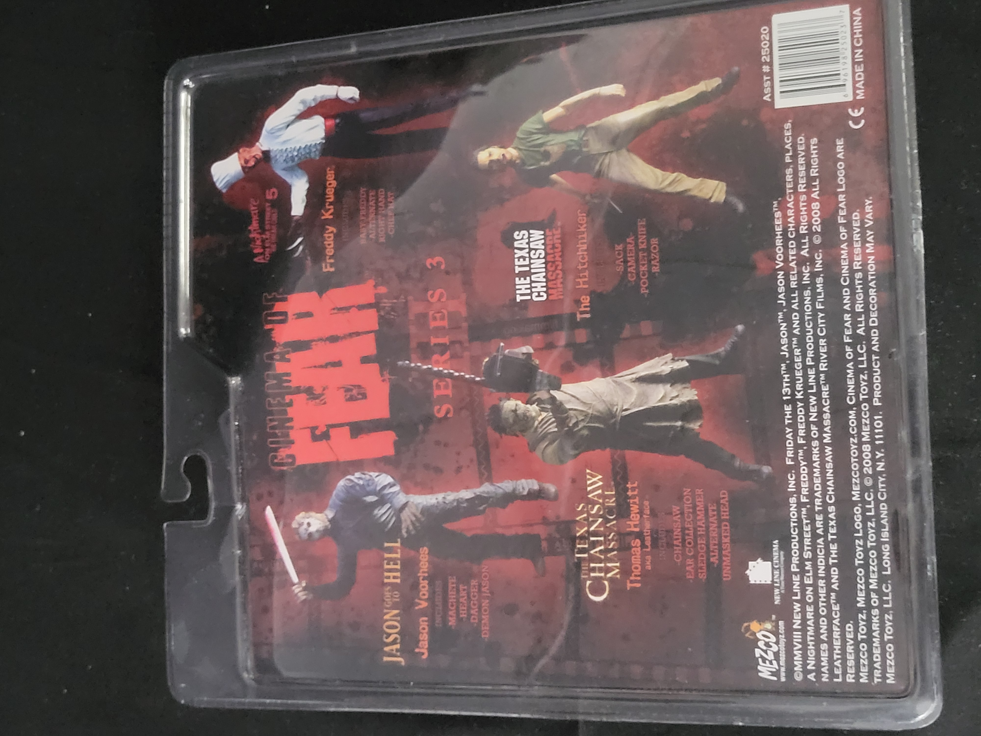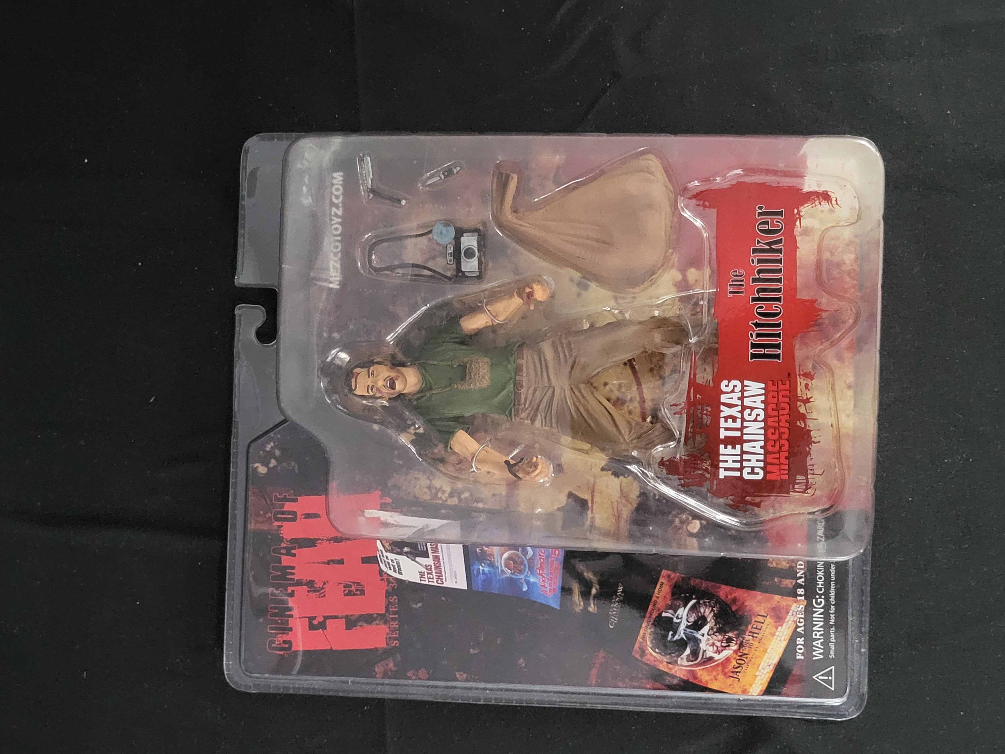 BID PER WHAT YOU SEE IN THE PHOTO, NOT THE AI GENERATED TITLES AND DESCRIPTIONS! A Mezco Toyz Cinema of Fear Series 3 articulated plastic action figure depicting the character The Hitchhiker from the 1974 film The Texas Chainsaw Massacre. The figure is presented in its original factory-sealed clamshell blister pack with a character-specific backing card featuring promotional artwork. Included accessories visible within the packaging are a sack, a camera, a pocket knife, and a razor. The reverse of the packaging displays other figures from the same series and bears a copyright date of 2008 for Mezco Toyz, LLC.