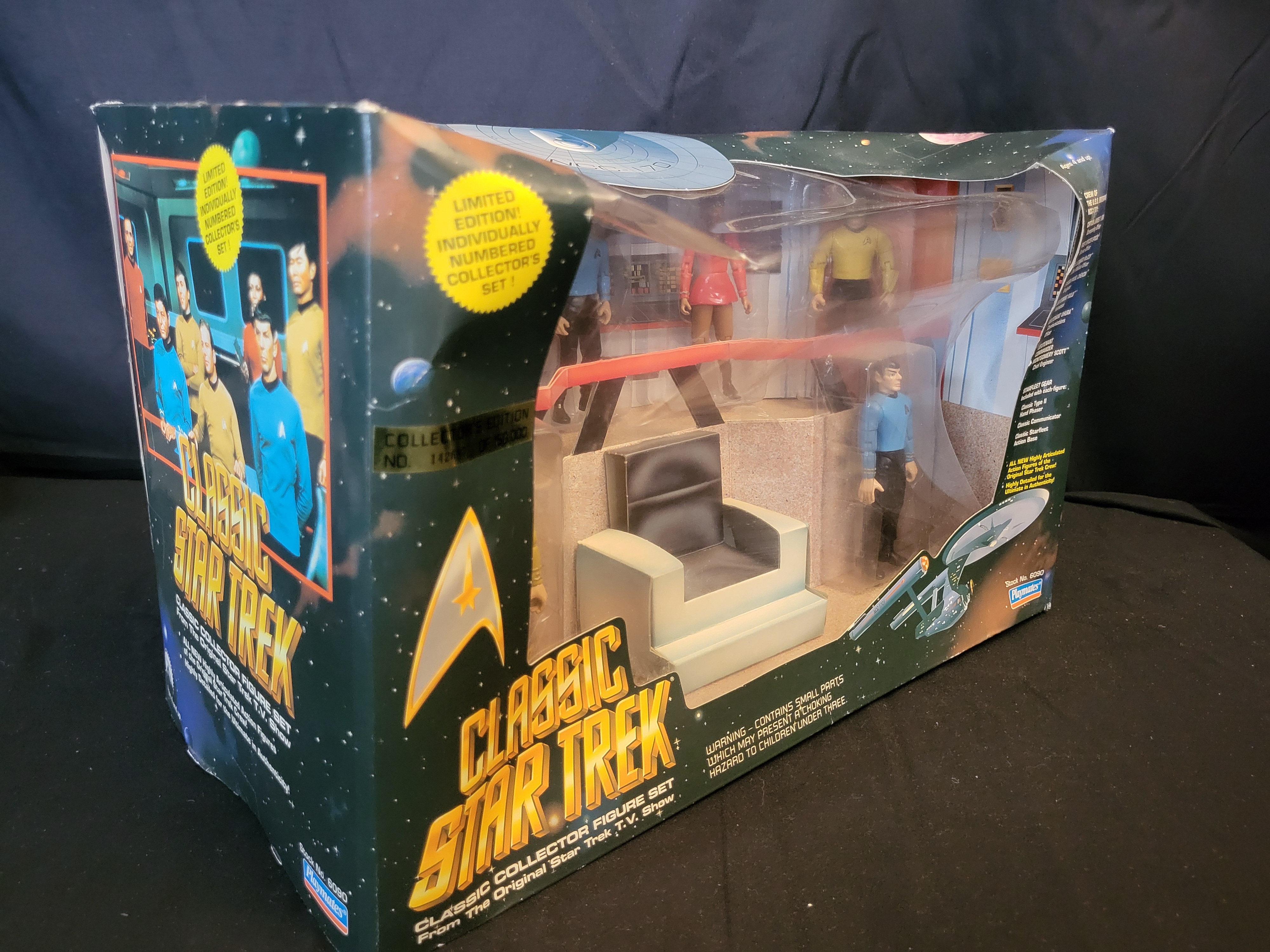 BID PER WHAT YOU SEE IN THE PHOTO, NOT THE AI GENERATED TITLES AND DESCRIPTIONS! A set of articulated plastic action figures from the Playmates Classic Star Trek collection, released in 1993. This limited edition set is individually numbered 142687 of 150,000. The collection depicts the primary cast from the original television series, including Captain James T. Kirk, Mr. Spock, Dr. Leonard McCoy, Chief Engineer Montgomery Scott, Lieutenant Sulu, Lieutenant Uhura, and Ensign Chekov. Included accessories consist of Classic Starfleet Gear such as phasers, communicators, and display bases, along with a captain’s chair. The items are contained within the original illustrated window-box packaging, which features character biographies and technical information on the back panel.